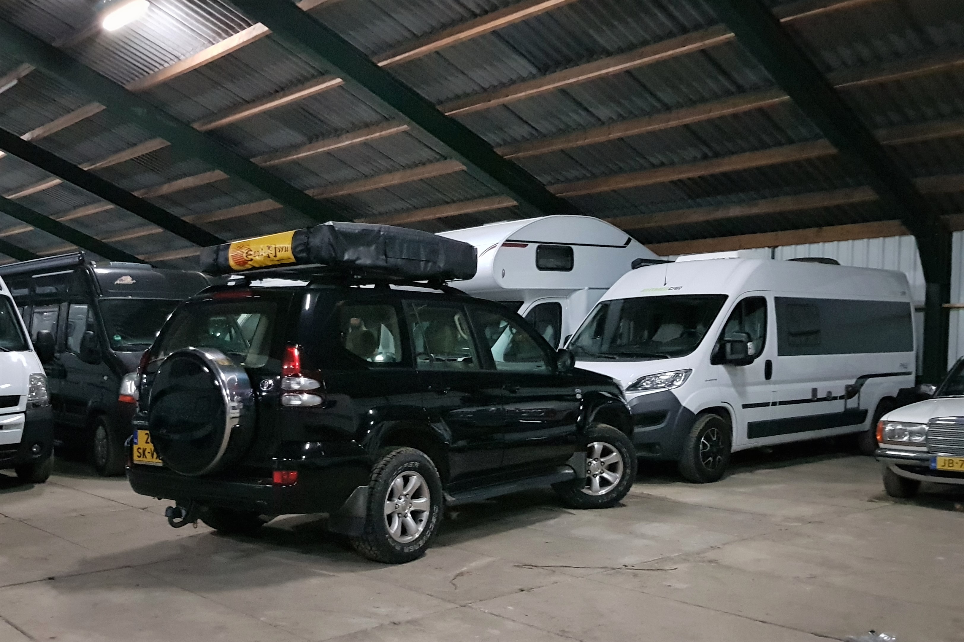 Het licht van de koplampen weerkaatst in de plassen van het donkere grindpad. De voorlopig laatste meters met onze Land Cruiser zijn aangebroken. Aan het eind van het weggetje staat een grote schuur, waar we ons rijdende huisje het komende halfjaar gaan stallen.