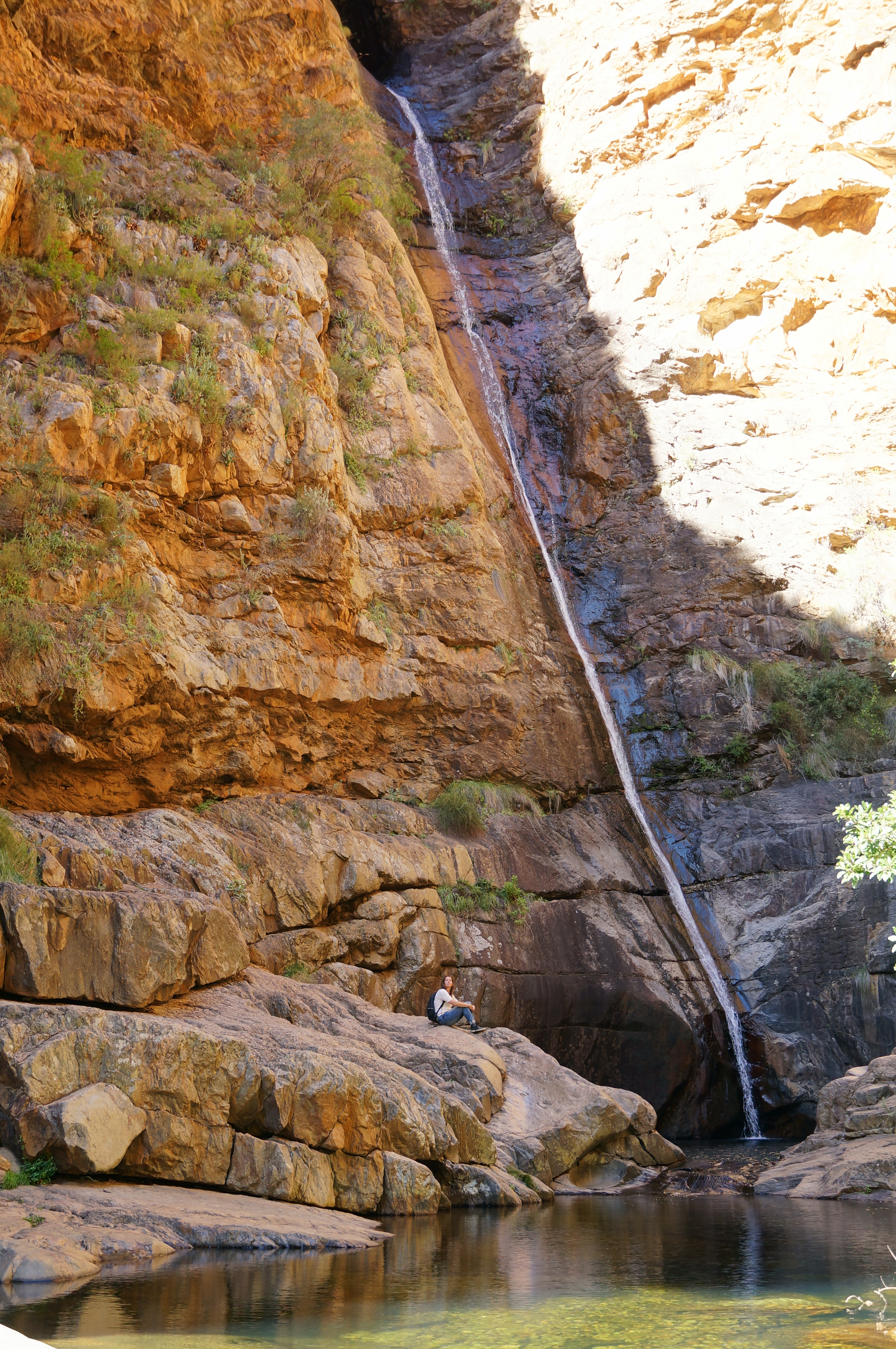 Het gebied waar we zitten heet Wilderness National Park en die naam dekt wel aardig de lading. We maken een prachtige wandeling door het bos, langs een riviertje dat uitkomt bij een waterval. Met stapstenen en een trekpontje steken we het riviertje een paar keer over. Een prima bezigheid voor deze warme dag, want in het bos is het lekker koel.