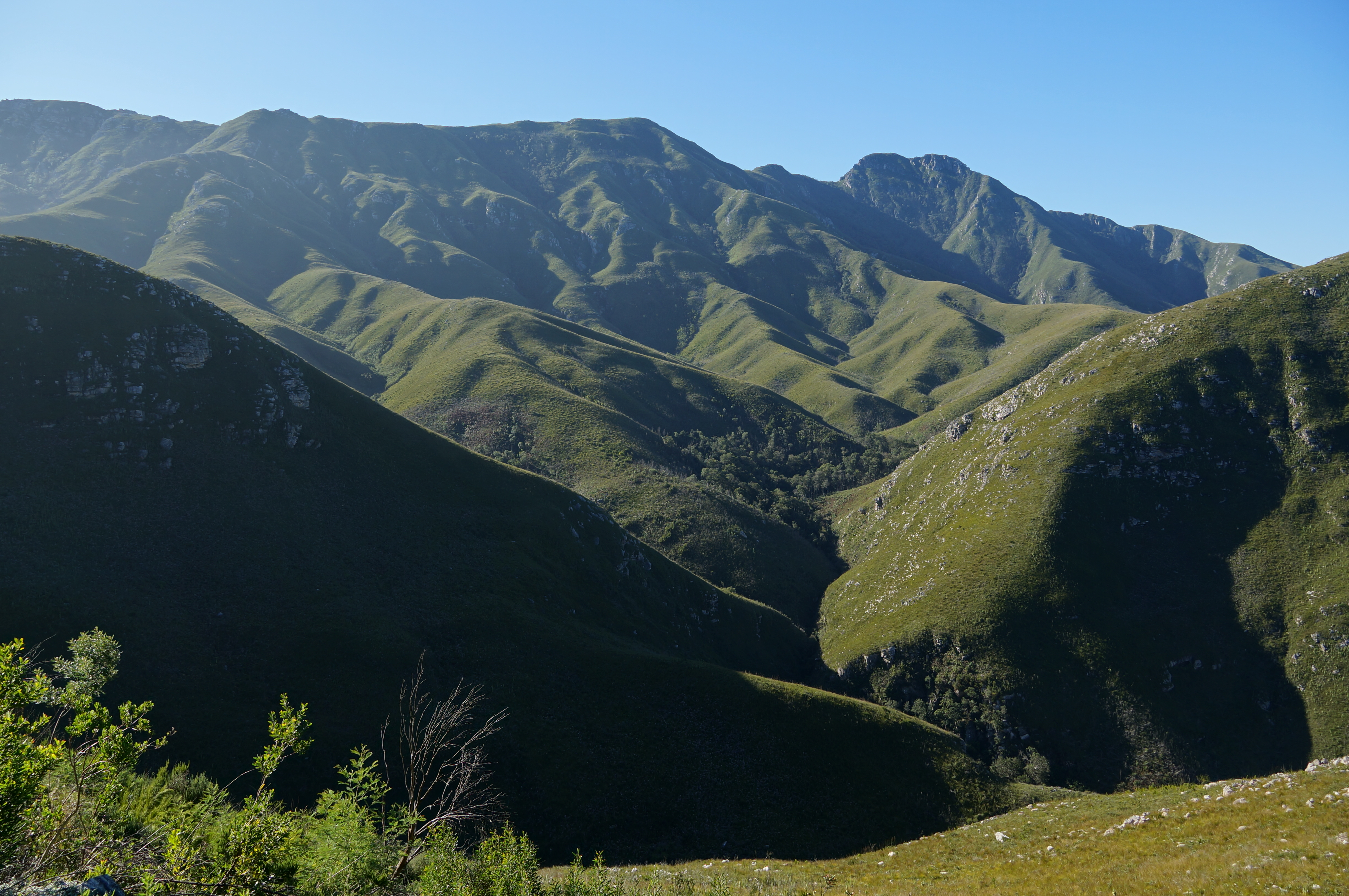 de groene bergen van de Outeniqua-pas | waterval onderweg | zonsondergang vanaf de veranda | wandeling in Wilderness National Park | uitzicht op de ‘Map of Africa’