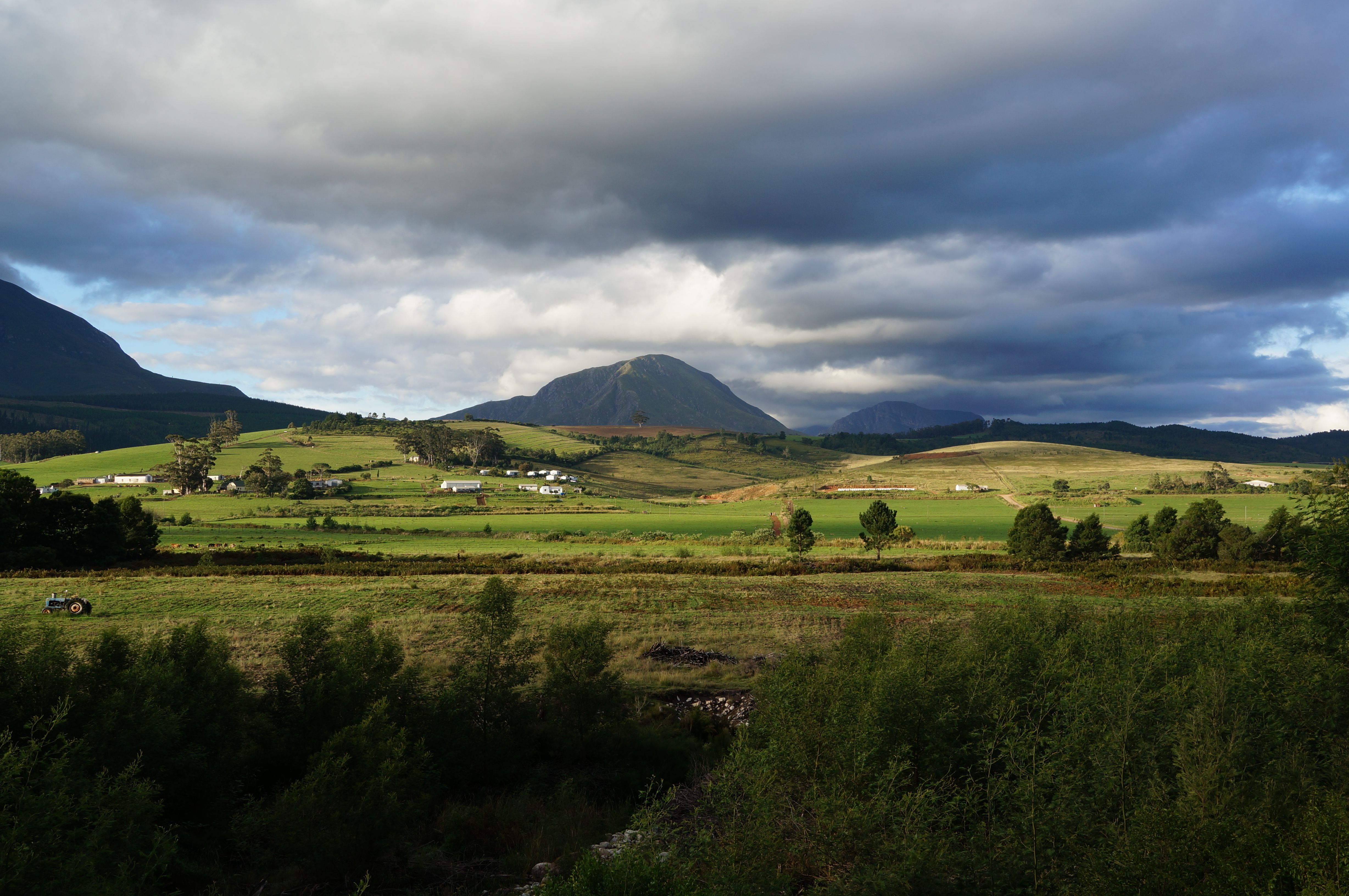 Voordat we doorgaan naar Kaapstad, overnachten we eerst nog in het slaperige stadje Riversdale. Het ligt aan de rand van een ruig gebergte waar we nog een korte wandeling maken. Op de terugweg naar het stadje rijden we over een hobbelweggetje tussen de landerijen terug naar ons appartementje, terwijl de ondergaande zon tussen de donkere wolken door prikt. Een omweg valt nooit tegen.