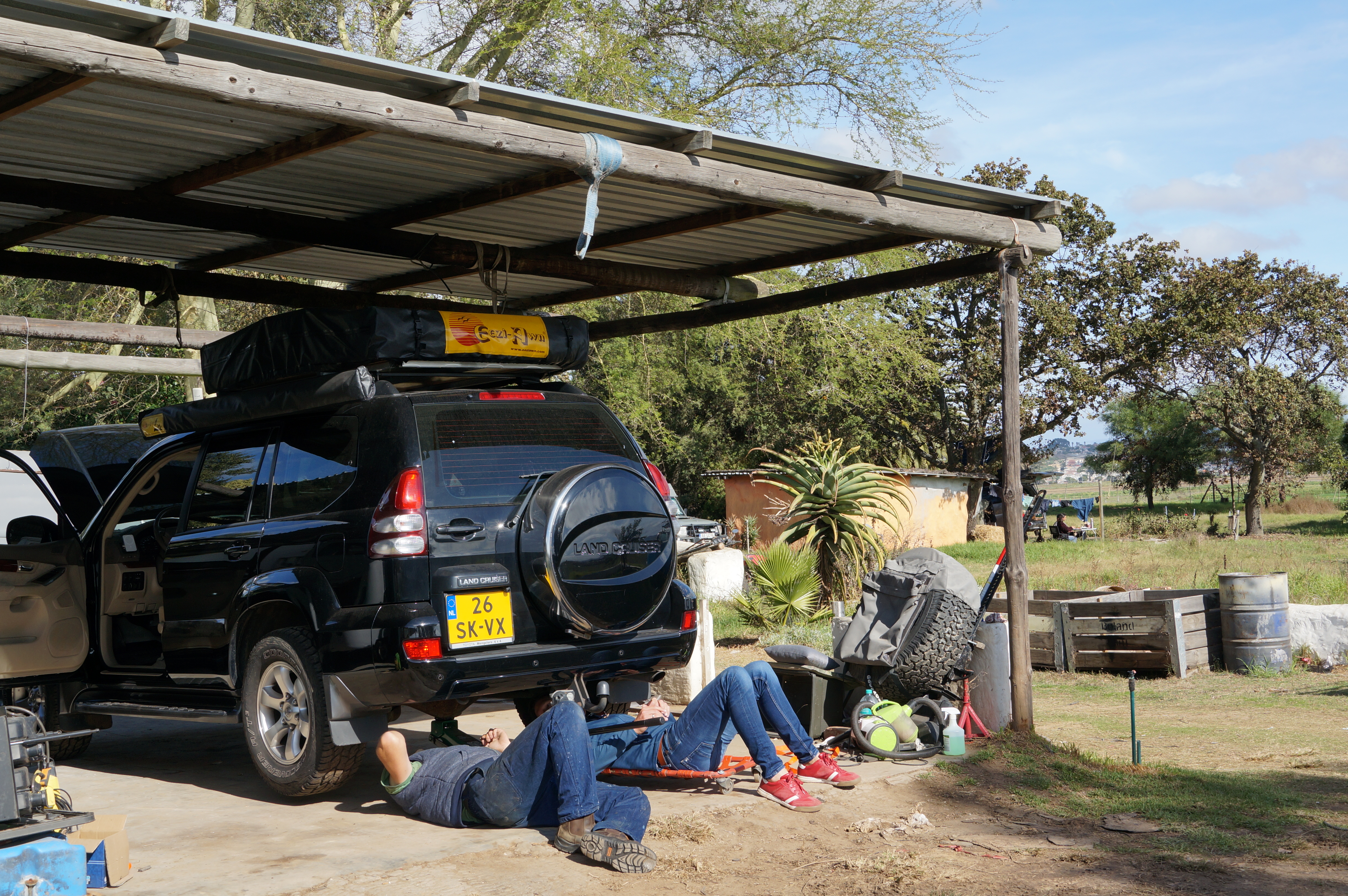 Ellemieke roept de laatste kilometers tot het terrein waar onze Land Cruiser staat te wachten wel drie keer dat ze hem gaat knuffelen. Tot een knuffel komt het niet, maar wat is het fijn dat onze auto bijna 10.000 kilometer van huis nu eindelijk voor onze neus staat. Alles zit er nog in en op een paar krassen na lijkt alles in orde te zijn. Krassen zal de auto nog wel meer gaan oplopen de komende maanden, dat noemen ze hier bush scratches. Niks om je druk over te maken.