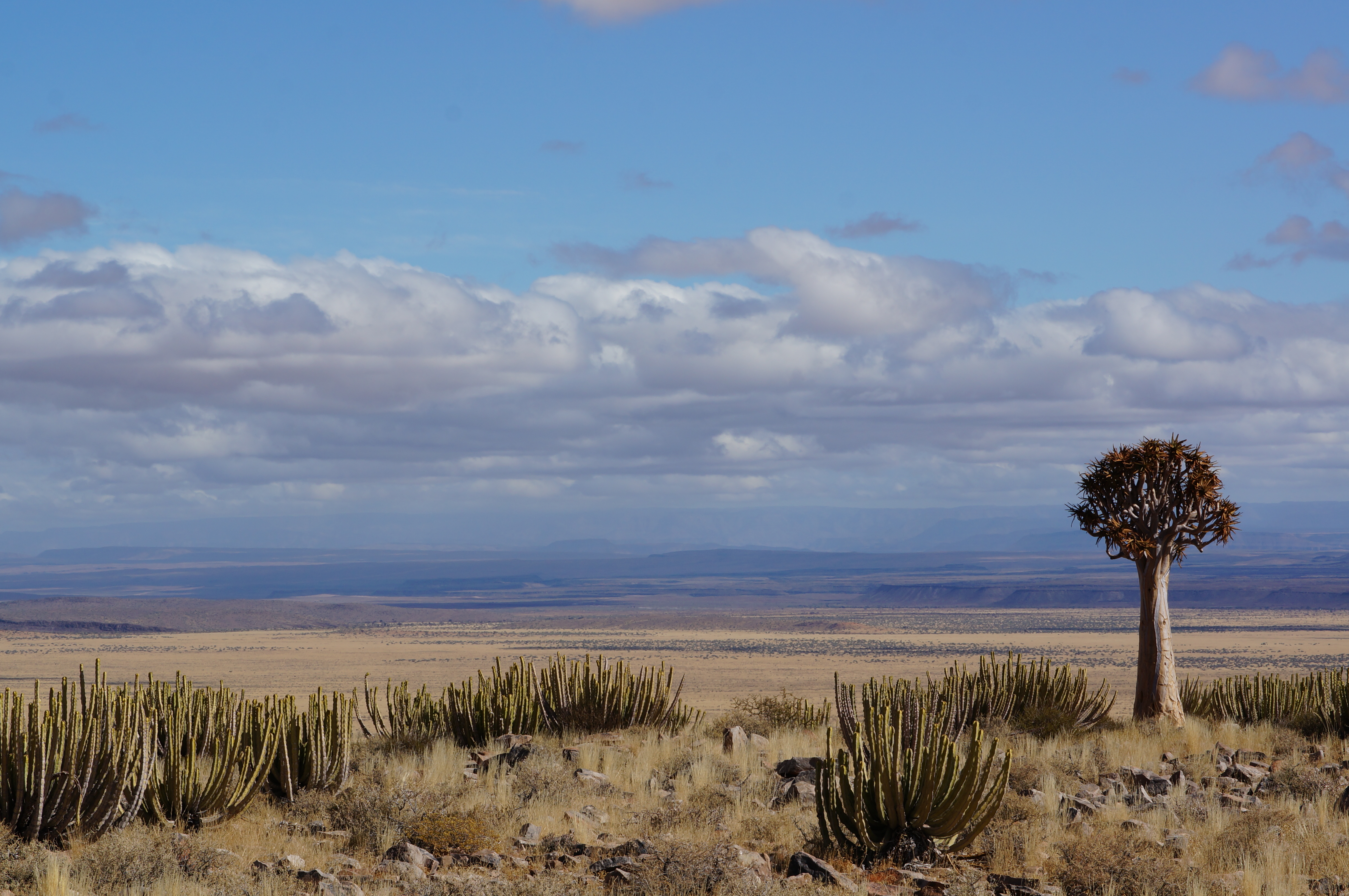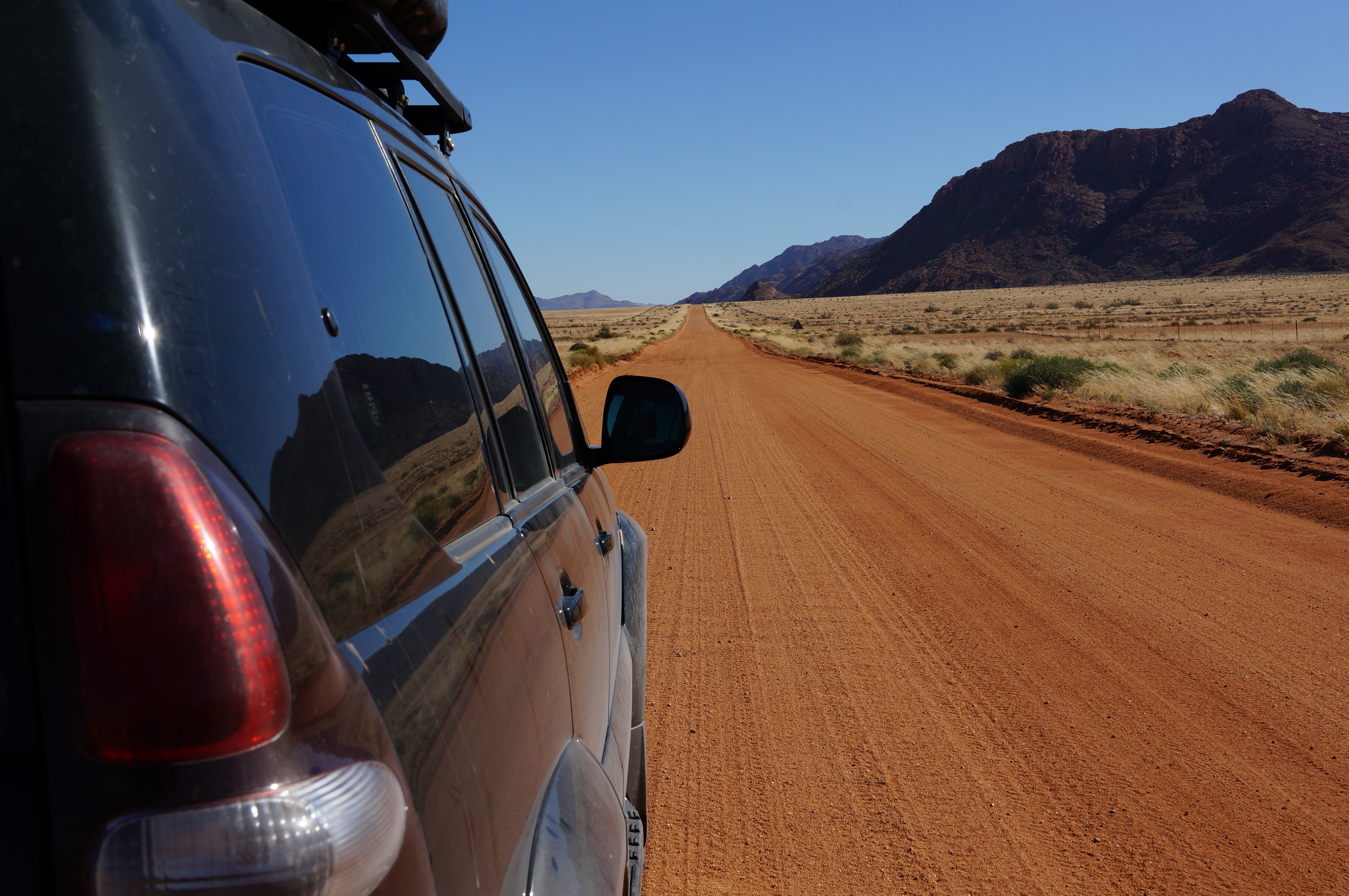 De volgende dag gaan we op weg richting de Fish River Canyon, na de Grand Canyon in de V.S. de grootste kloof ter wereld. Onderweg laten we het landschap langzaam op ons inwerken, de omgeving wordt langzaam ruiger. De zon staat aan de hemel, op de radio klinkt de heerlijke, dromerige muziek van The War on Drugs en in de binnenspiegel zie ik de stofwolk die onze auto achterlaat langzaam oplossen in de blauwe lucht. Onderweg zijn is soms al een bestemming op zich.