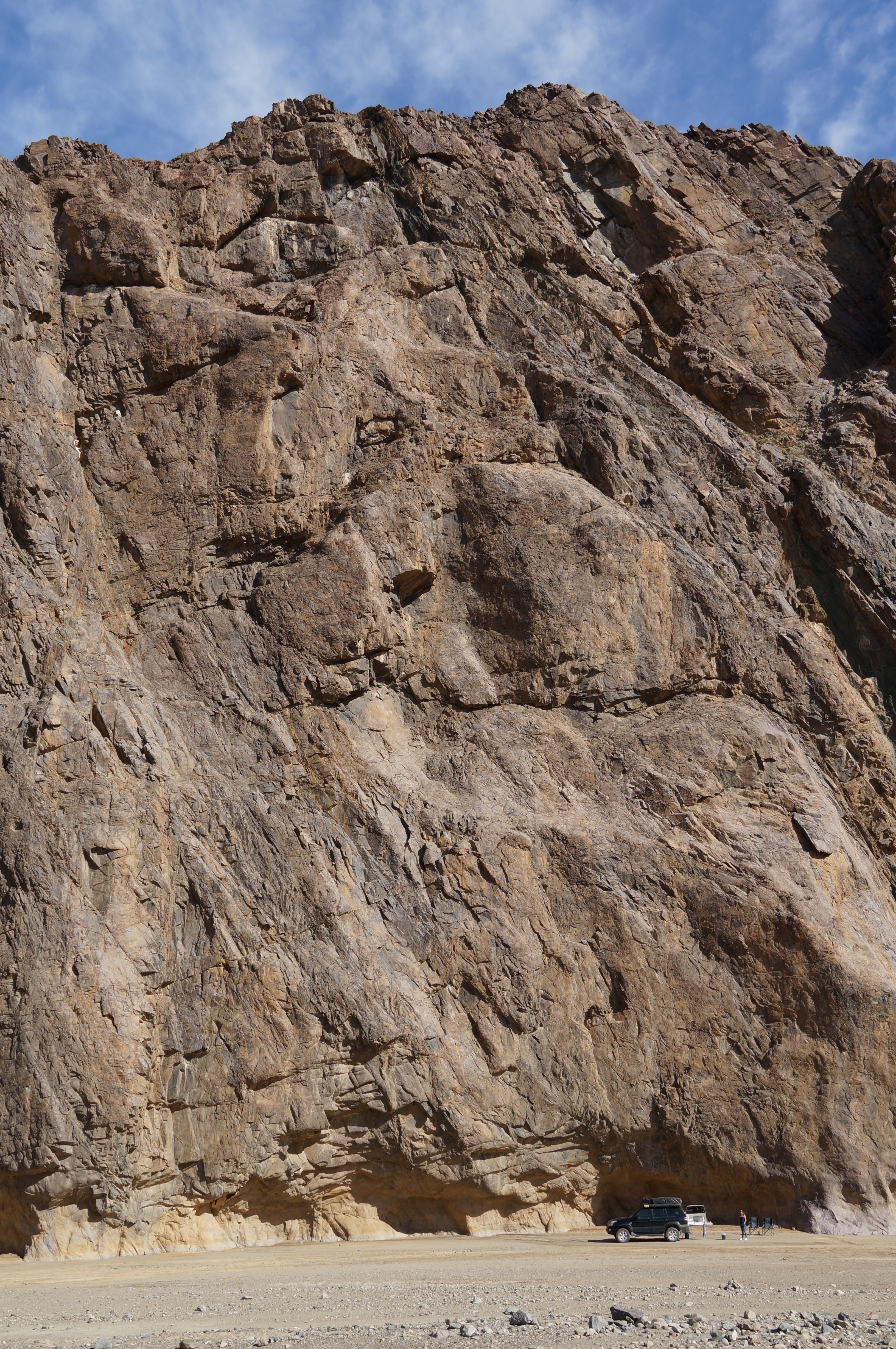 We hebben van andere reizigers een tip gekregen voor een mooi lunchplekje, bovenop een berg. Wat ze er niet bij vertelden is dat het weggetje er naartoe die benaming niet eens waard is. De Land Cruiser hobbelt omhoog over losliggende stenen met scherpe punten. Ellemieke is er halverwege wel klaar mee en wil omkeren. Ik zeg: “Maar schat, we zijn er bijna… Zonde om nu af te haken.” Totdat we op het punt komen waarop ook ik me afvraag of dit wel zo’n goed idee is. Het paadje wordt nog steiler en de stenen scherper en groter. Maar dan is het al te laat om te keren. Ik kijk naar rechts en zie een gezichtsuitdrukking die het midden houdt tussen ‘zie je nou wel’, boosheid en angst. Oeps… Maar we zetten door, onze banden grijpen zich vast in de stenen en de auto sleurt zich naar boven. Het uitzicht is prachtig, we kijken uit over eindeloze gele vlaktes en bergen die als gesmolten marshmallows in het landschap liggen.