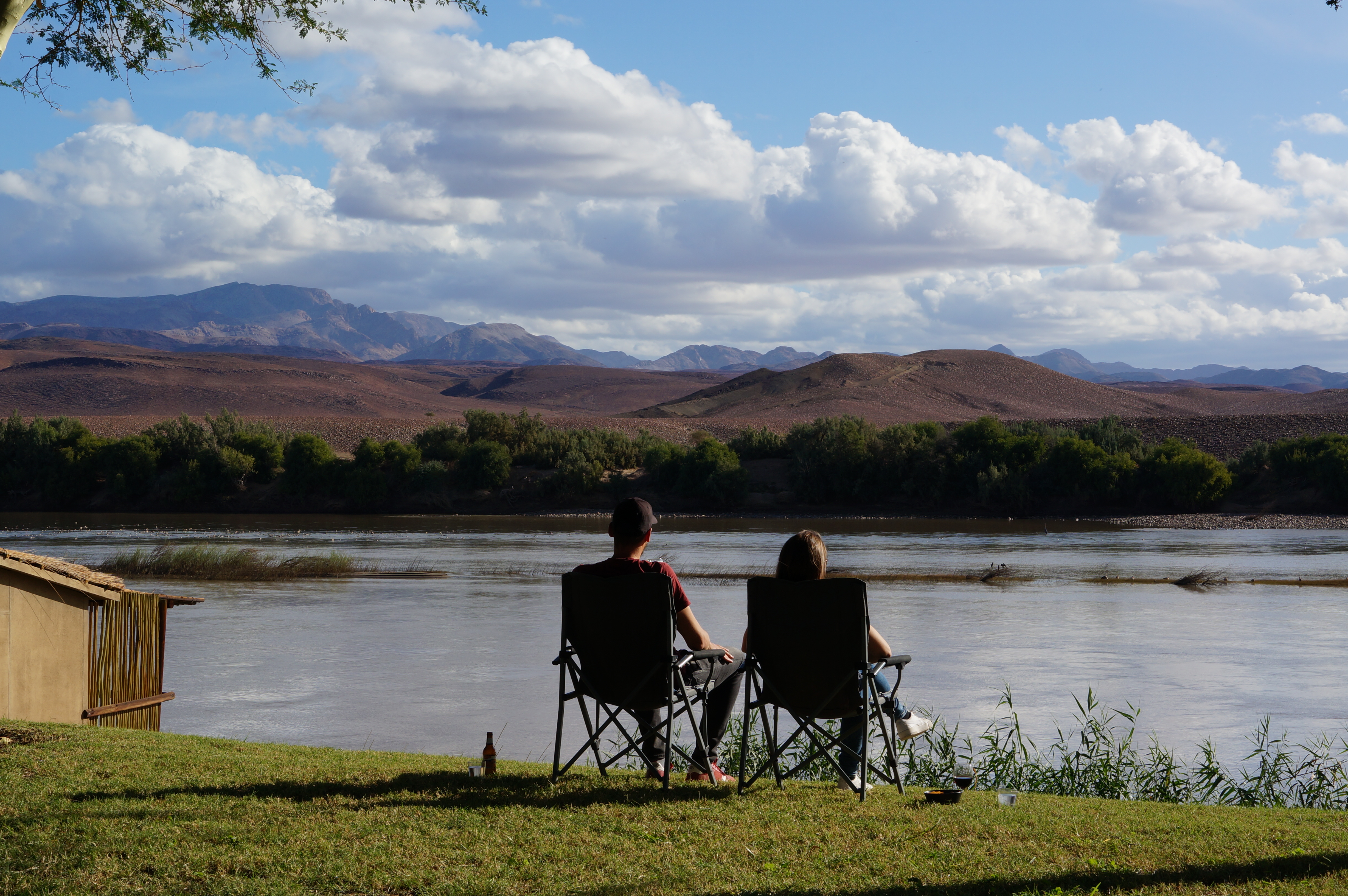 Aan het eind van de middag komen we aan in Aussenkehr, wat niet meer is dan een verzameling hutjes, boerderijen met enorme velden met druivenranken en een Spar-supermarkt. Aan de oranjerivier, waar we uitkijken over Zuid-Afrika, proosten we op een mooie dag en zien we de zon zakken achter de bergen. De temperatuur blijft dit keer ook na zonsondergang aangenaam, waardoor kamperen na een paar koude en winderige dagen weer een stuk aangenamer is. Als we bijna naar bed gaan komt de eerste regen in weken naar beneden, maar veel stelt het niet voor.