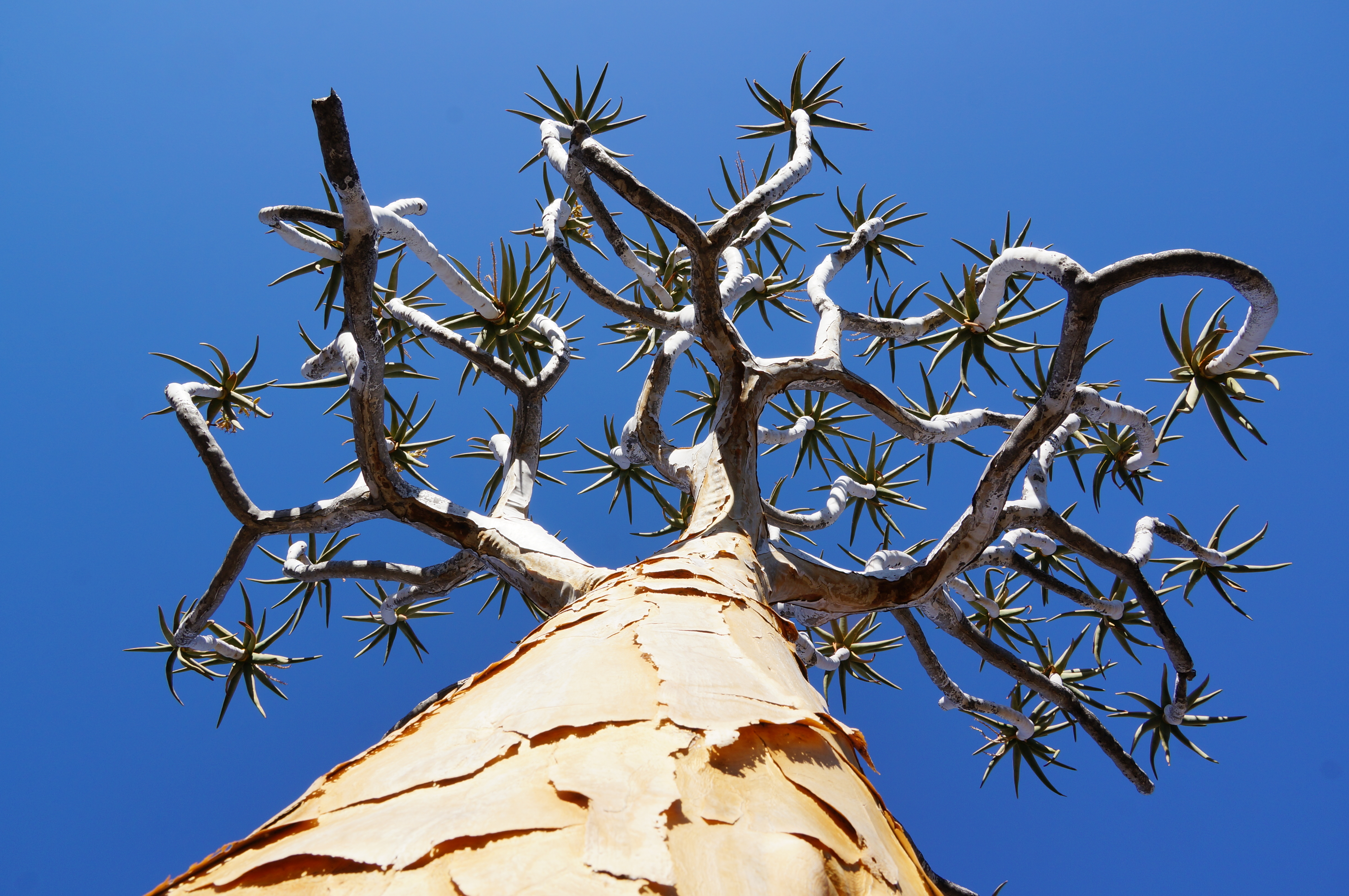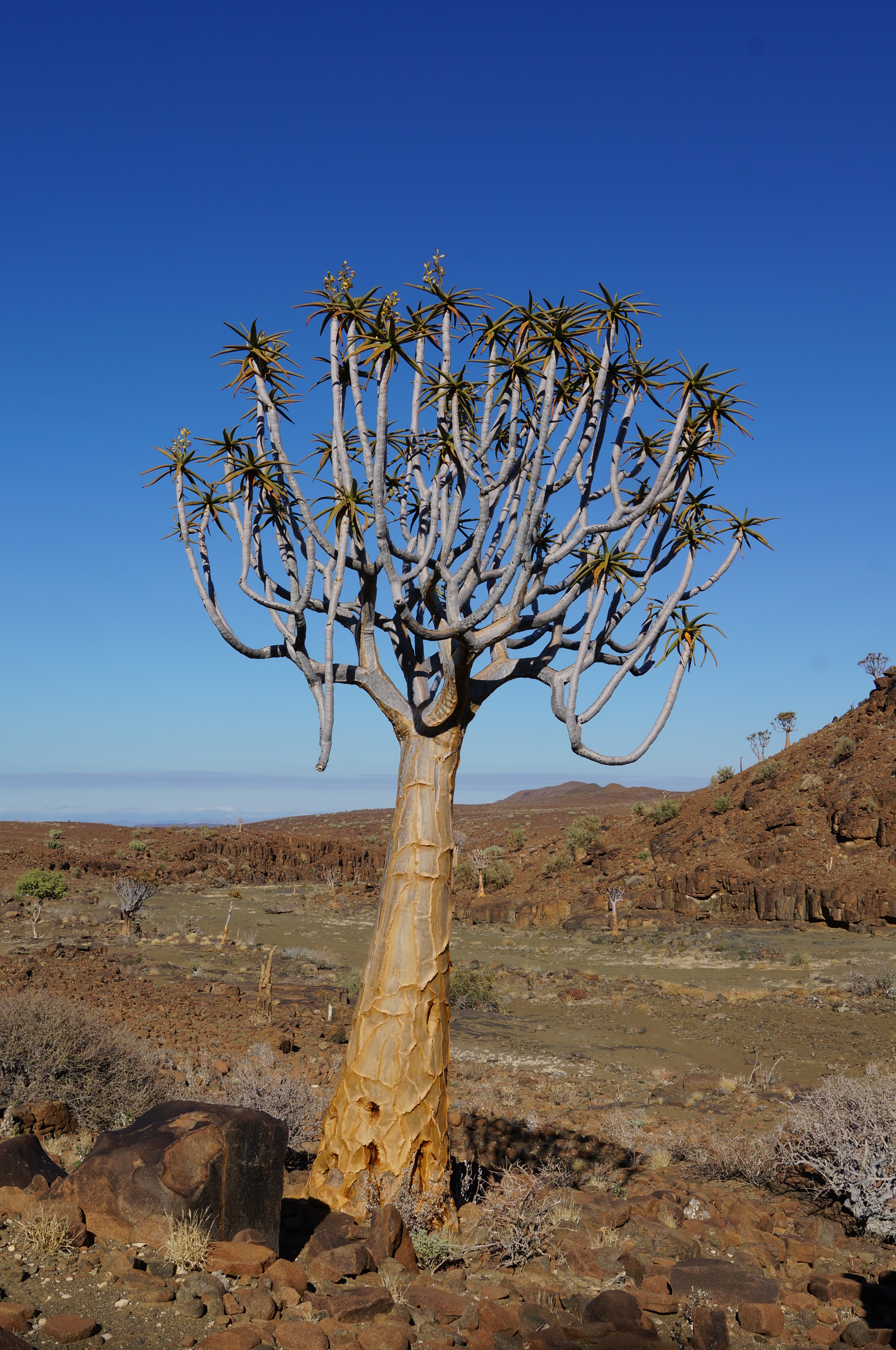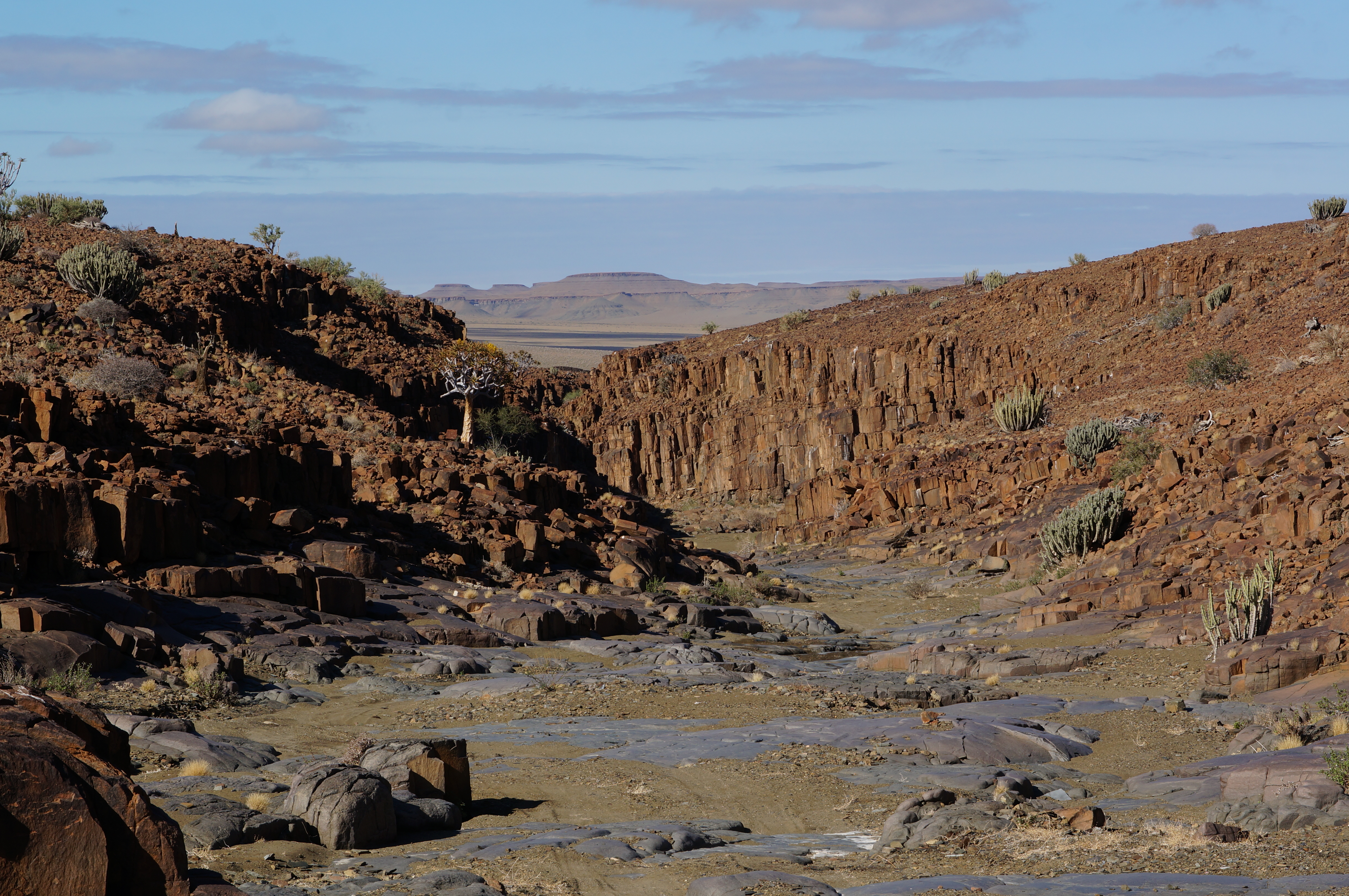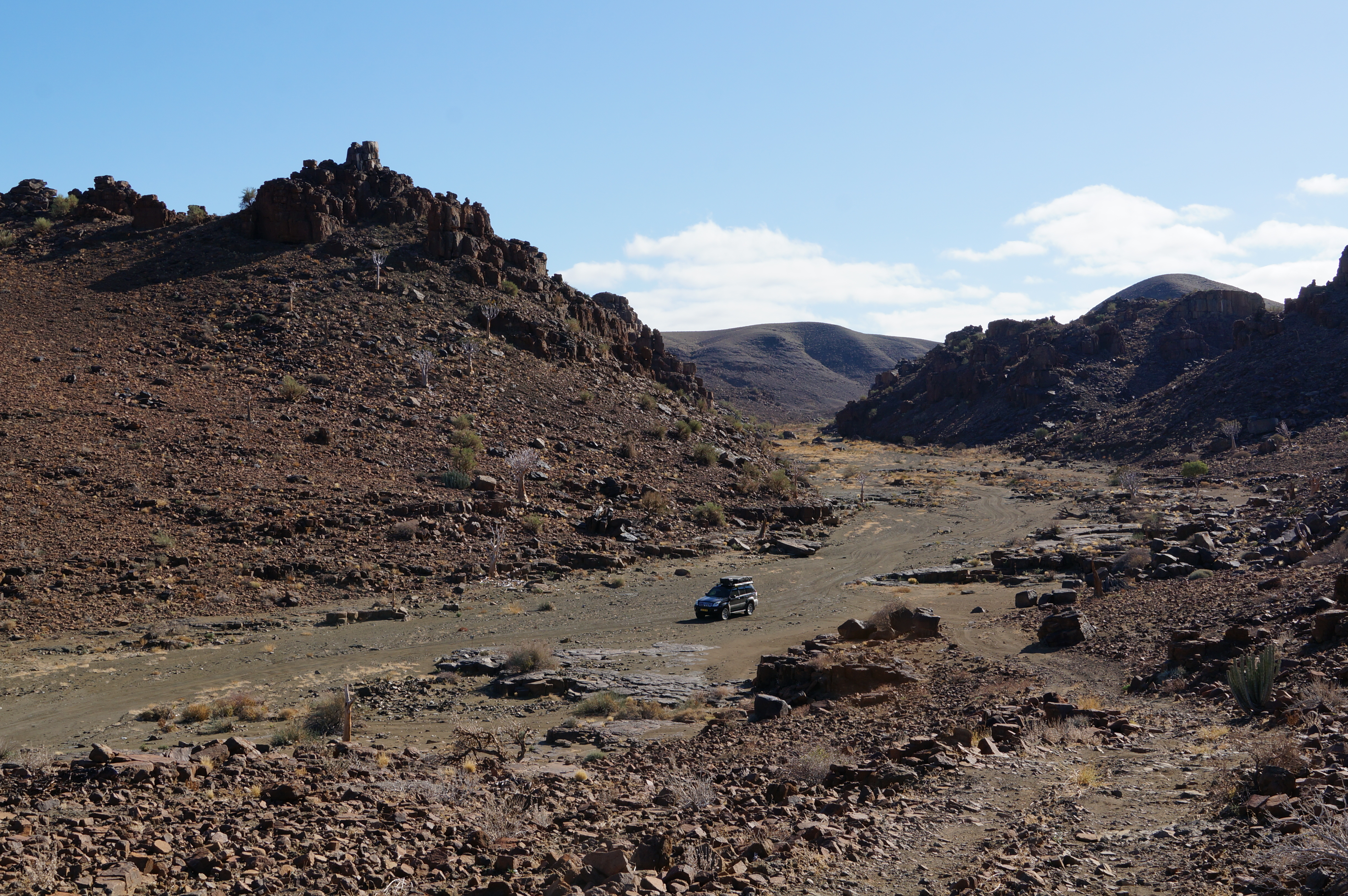 De volgende dag kunnen we gelukkig alsnog gaan. Het eerste stukje door het gebied hobbelen we tussen de rotsen door, maar al snel moeten we er overheen. De mevrouw bij de Spar is er blijkbaar vanuit gegaan dat we een terreinwagen hebben, want met een Toyota Aygo waren we niet ver gekomen. Na wat klim- en klauterwerk komen we in een kloof waarvan de rotsige wanden zijn begroeid met kokerbomen en cactussen. Omdat er verder geen bordjes staan rijden we verder een willekeurig paadje in en hopen dat we zo een rondje kunnen maken. Op geen van de vier kaartenapps die we hebben staat het weggetje waarop we rijden aangegeven. Er zit nog een tweede sleutel aan de bos en na een uurtje rijden door het lege landschap stuiten we weer op een hek. Zou de sleutel passen? Jahoor, de tweede sleutel is inderdaad voor dit hek en we kunnen weer afdalen richting het dorpje.