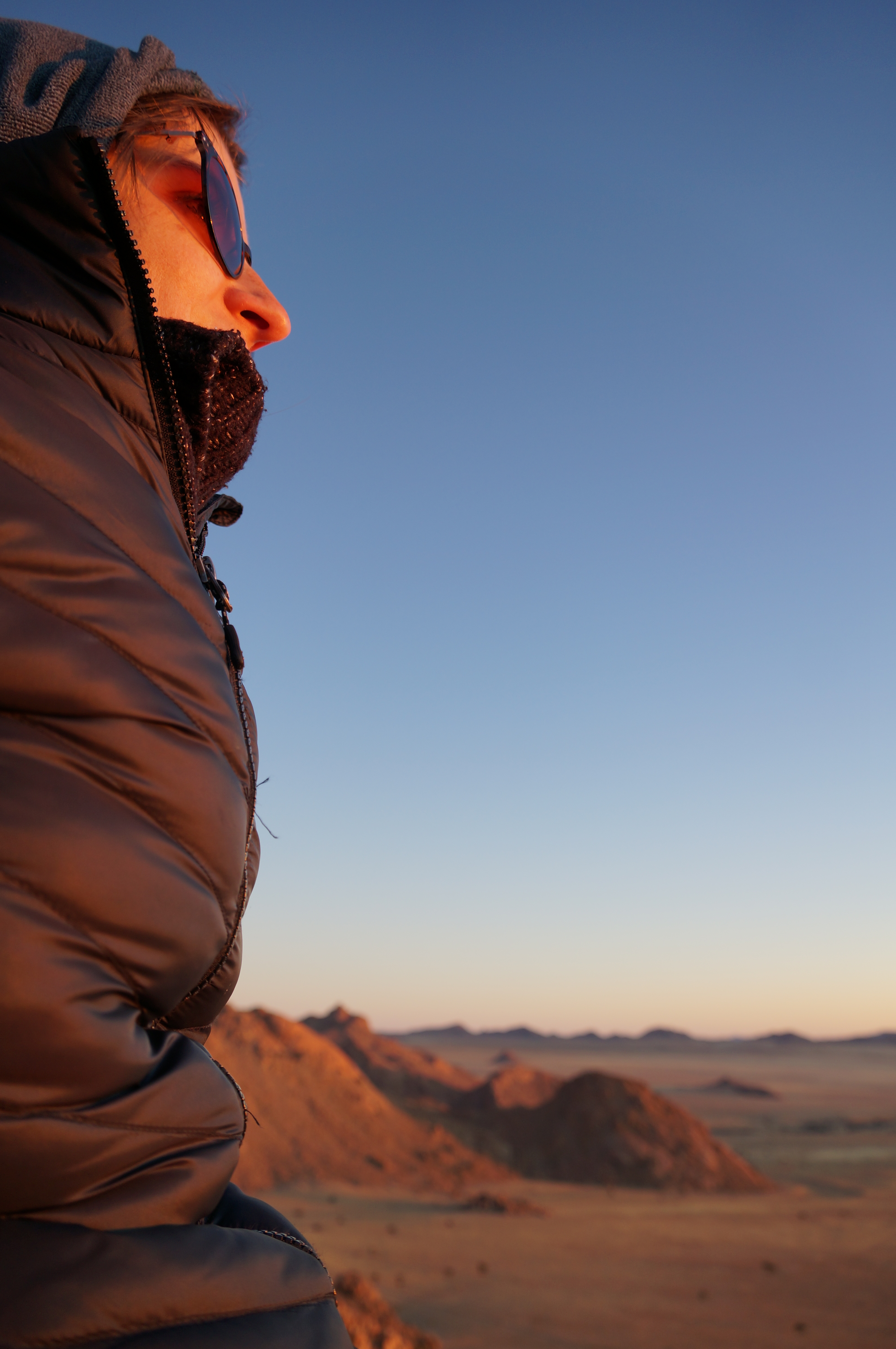 Na een winderig nachtje rijden we verder langs de Oranjerivier, waar veel mijnbouw is. In de gitzwarte bergen, die als ingezakte chocoladebrownies uit de grond steken, wordt diamant gewonnen. We buigen daarna af richting het noorden en maken een tussenstop in Aus, waar we een van de mooiste zonsondergangen ooit zien, maar waar we ook in de ijzige wind onze daktent uitklappen. Gelukkig is er een restaurant bij de camping, want buiten is het niet uit te houden. De wind blijkt zeer ongewoon te zijn voor de tijd van het jaar en er komt nog meer.