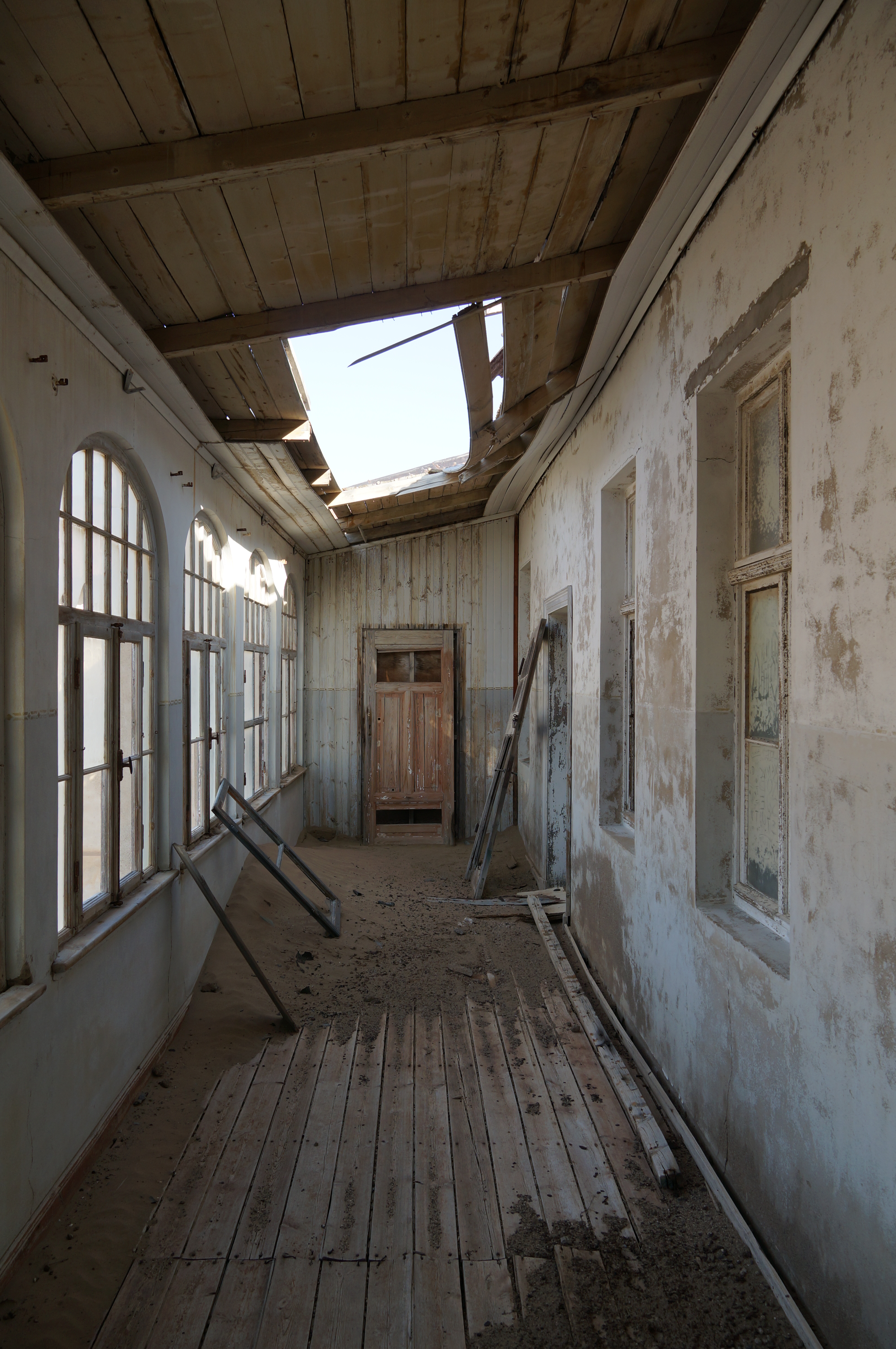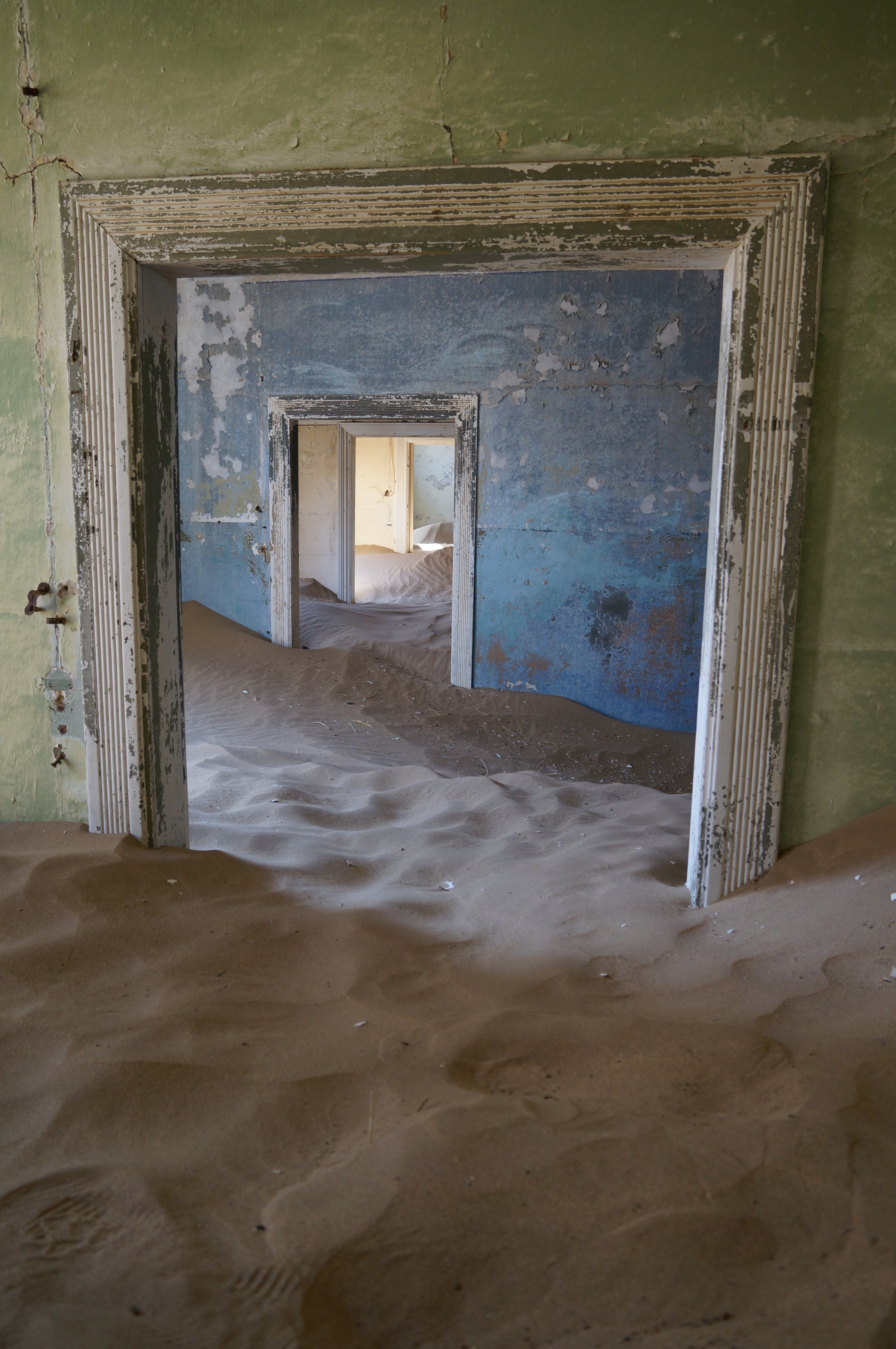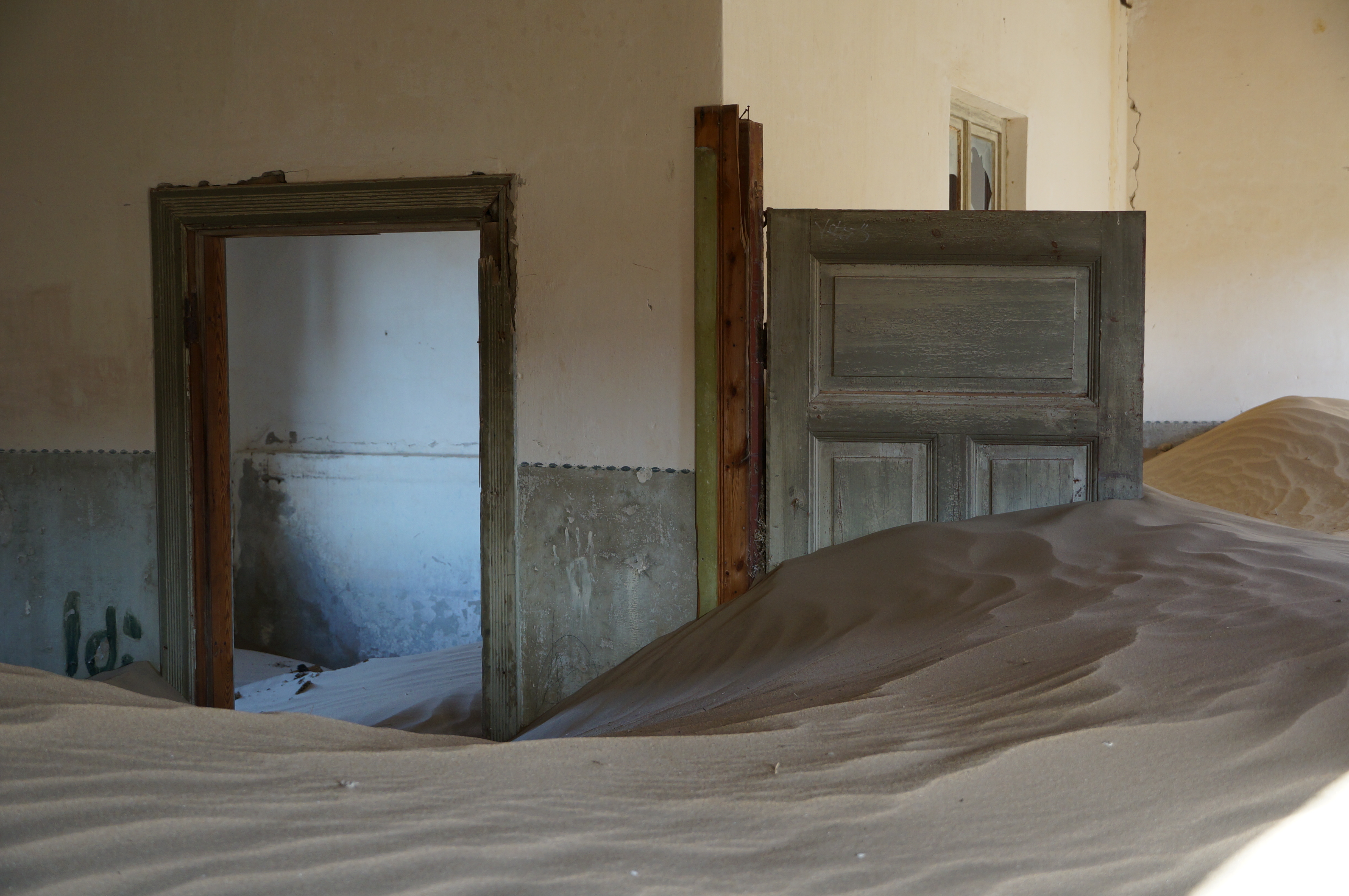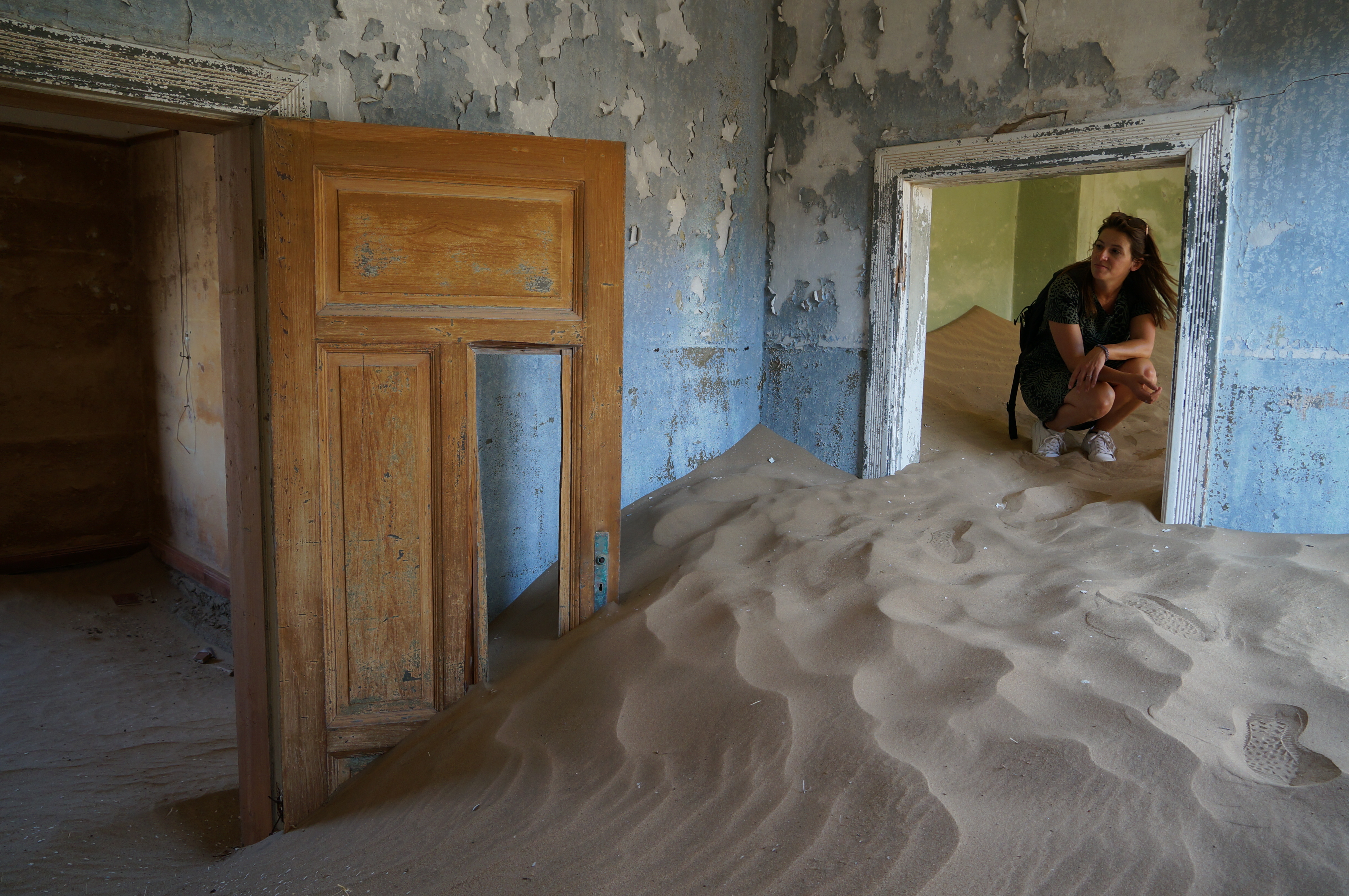 In Lüderitz hebben we een appartementje geboekt, want met deze wind is kamperen niet te doen. De dagen erop gaat het stormen en kleurt de lucht geel van het zand dat uit de woestijn richting zee waait. De temperatuur is opgelopen tot meer dan 30 graden, wat het allemaal nog vreemder maakt. Ondanks de wind willen we toch iets van de omgeving zien, maar mooi vinden we het er niet. Het is vooral een beetje vreemd. Alles is grijs: de rotsen, het zand, de lucht. Surreëel, maar na een paar uur willen we wel weer wat kleur. Een stuk leuker is het verlaten mijndorpje Kolmanskop, dat deels door de woestijn is opgeslokt en waar we helemaal alleen door de kamers van de huisjes kunnen lopen en kruipen. Op sommige plekken ligt het zand al bijna tot aan het plafond.