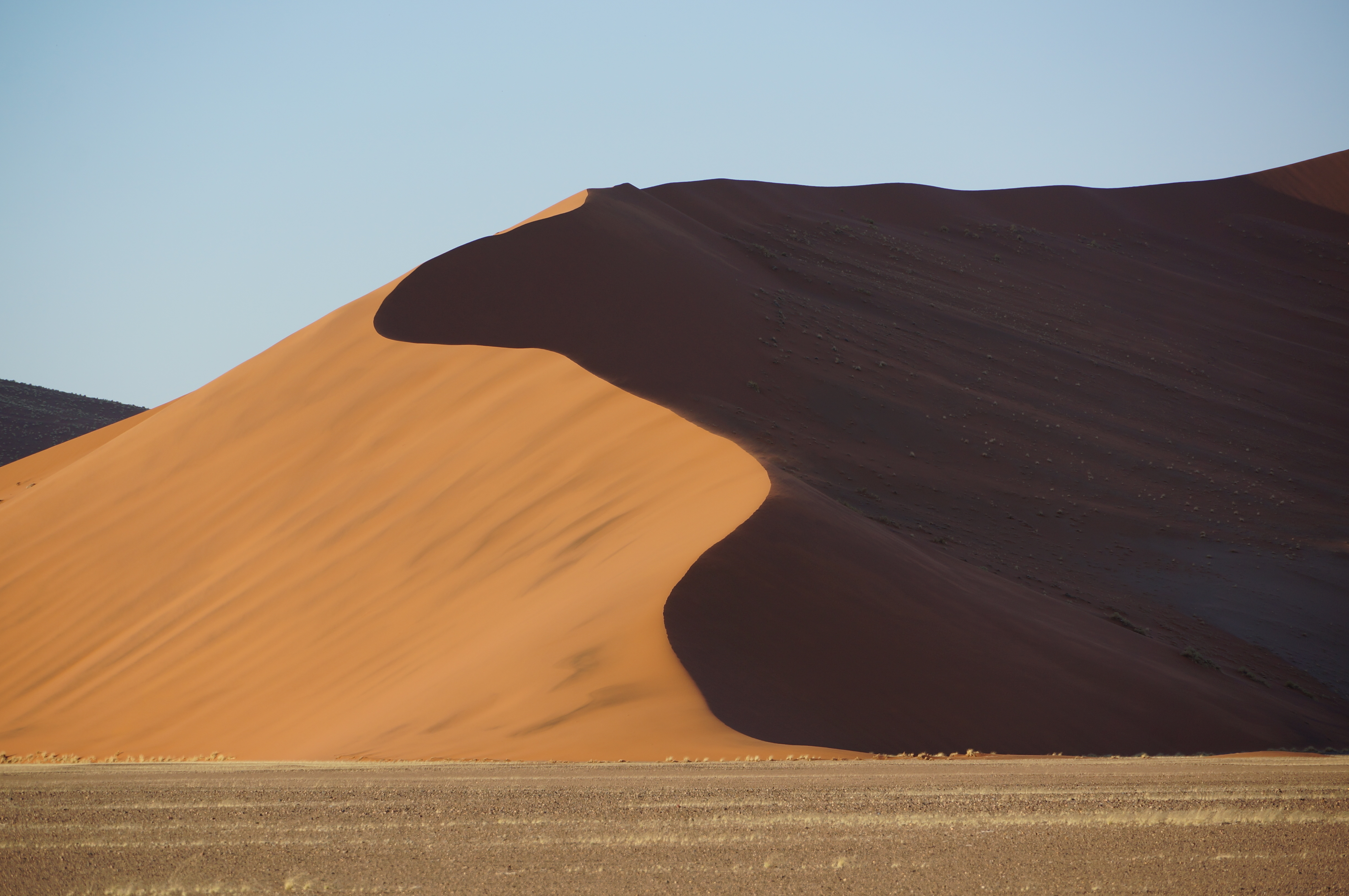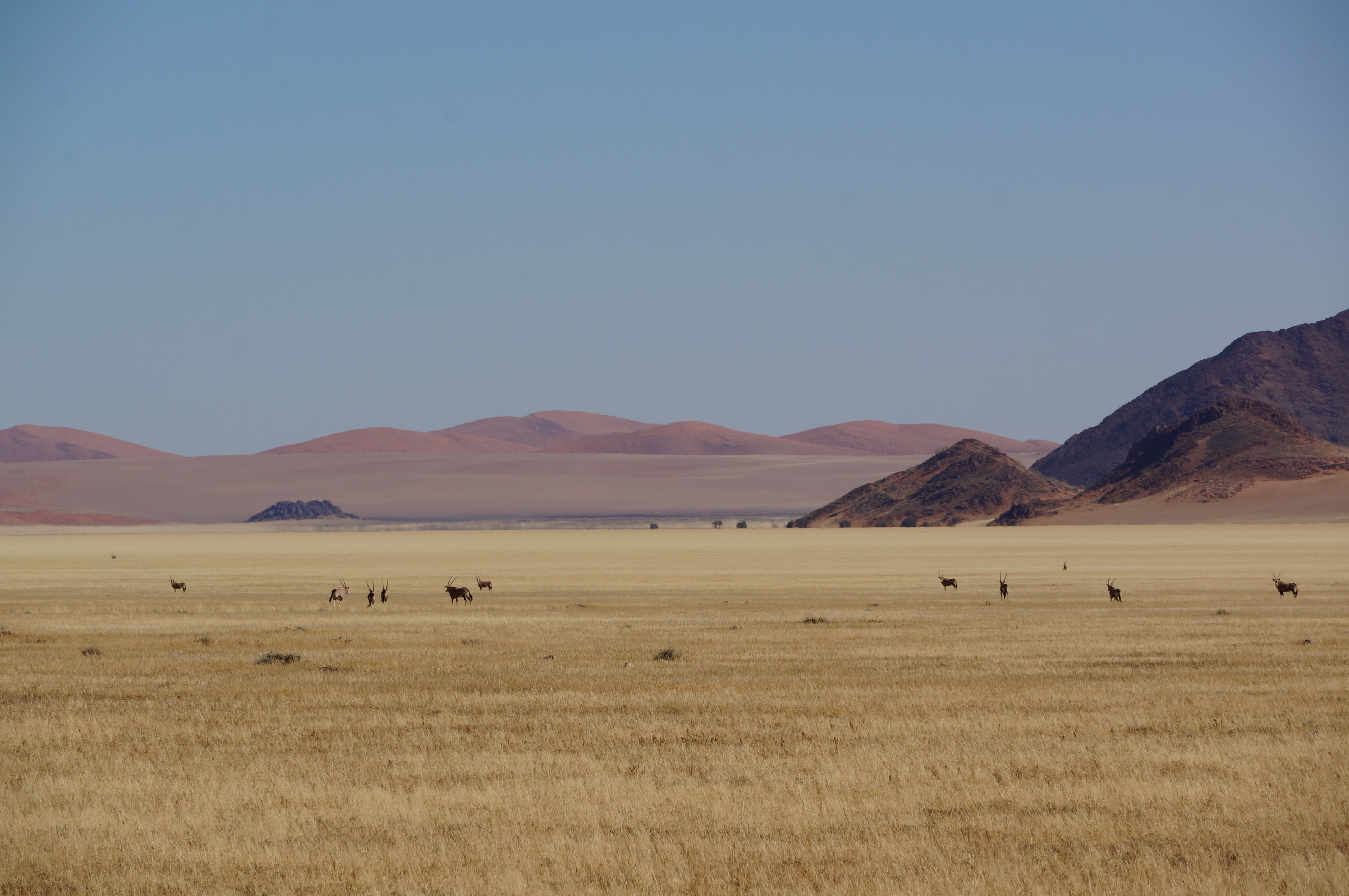 Dit verhaal gaat natuurlijk goedkomen, want zoals ik al vertelde zijn we op weg naar de Sossusvlei. Alleen de route er naartoe is al prachtig. Eindeloze vlaktes met goudgele graspluimen, verdwaalde boompjes en grazende gemsbokken, met op de achtergrond rode zandduinen als voorproefje op de Sossusvlei. Nog even twee korte feitjes over Namibië: