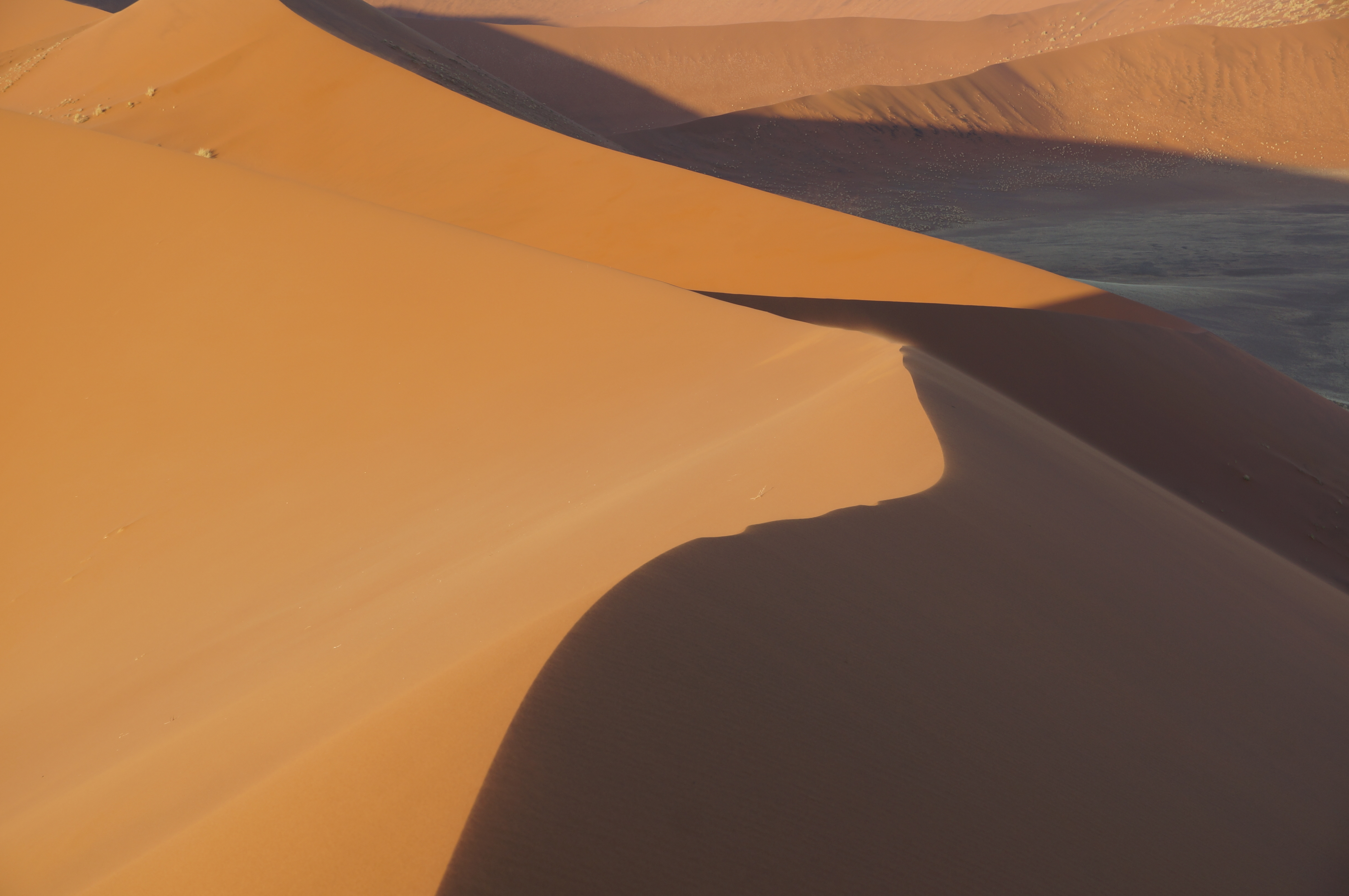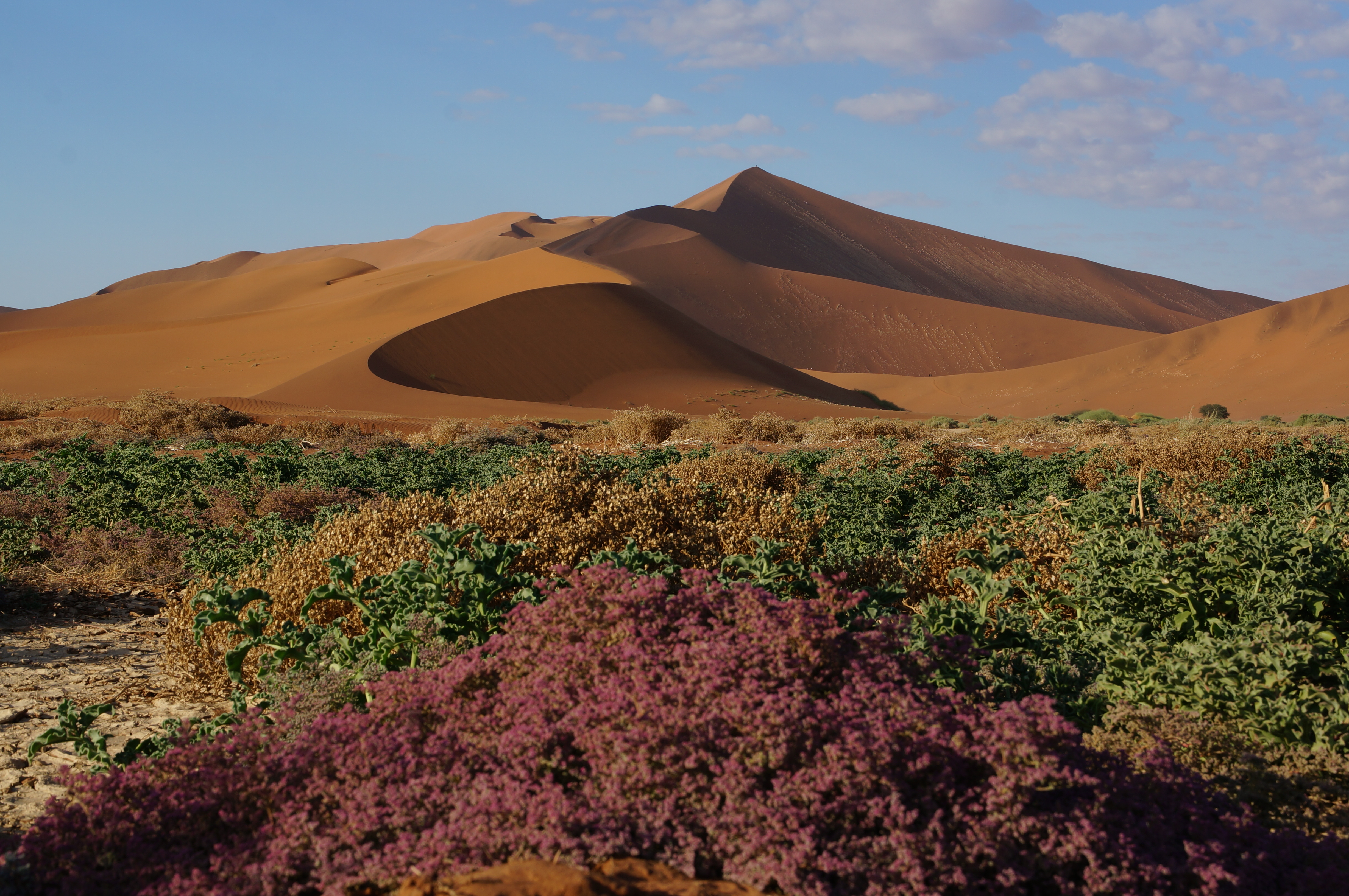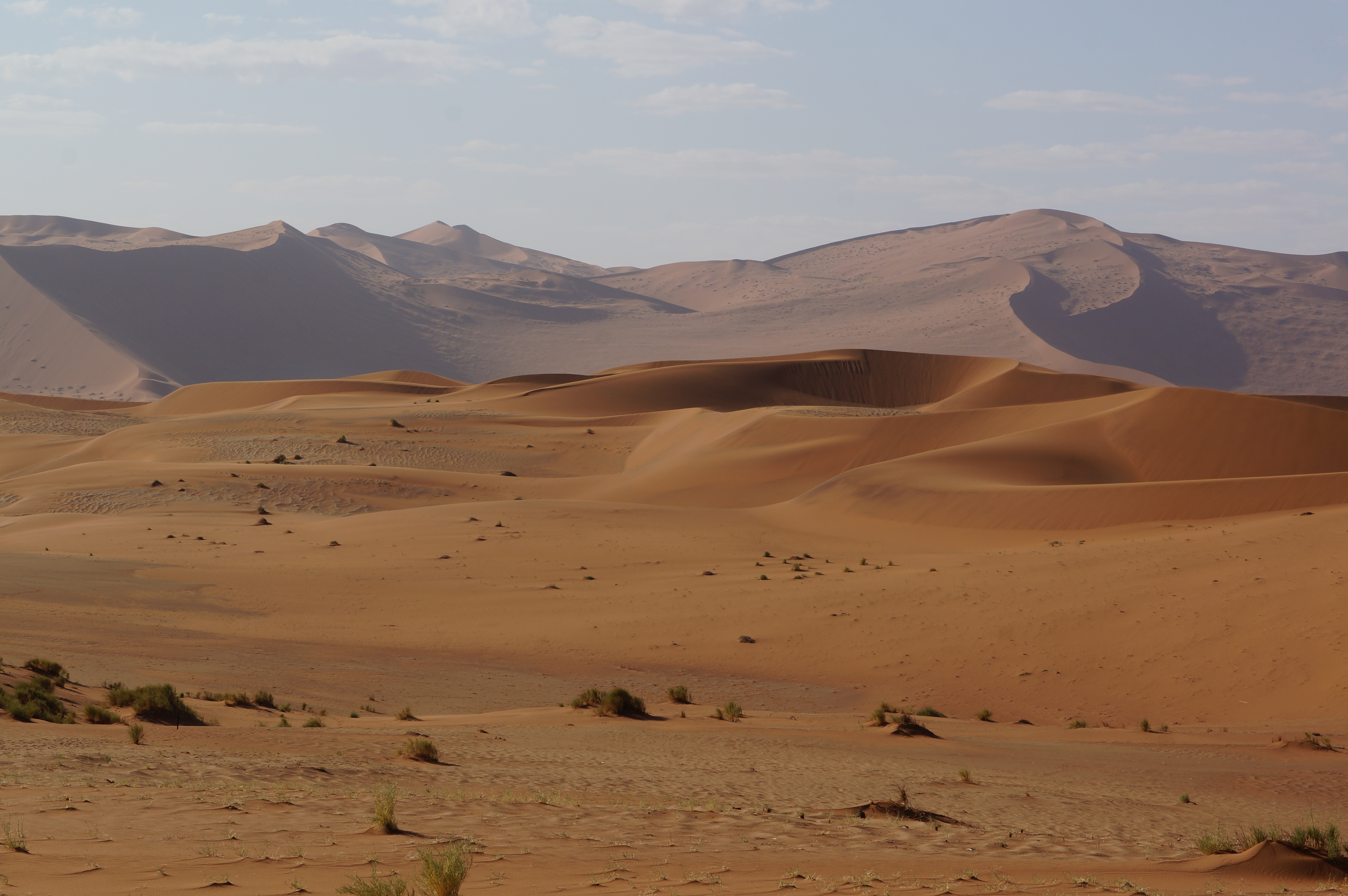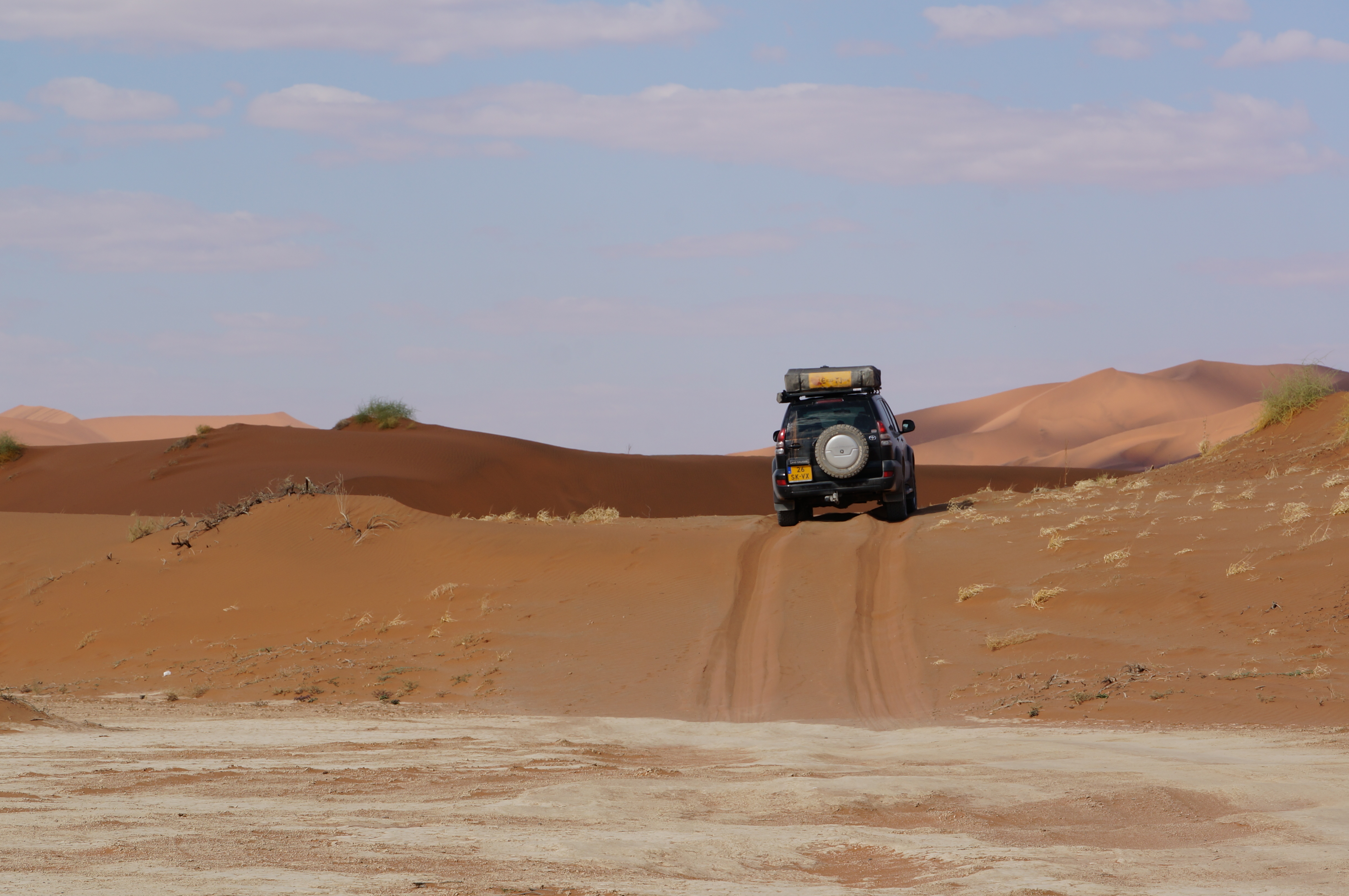 Als we Lüderitz een paar dagen later weer verlaten is de storm op zijn hevigst. De weg ligt bezaaid met zandduinen en we zien onderweg een politieauto die eerder in de ochtend op een van de duinen is gebotst en behoorlijk in de kreukels ligt. Het zand steekt horizontaal de weg over, maar we halen veilig onze tussenstop op weg naar de Sossusvlei, een van de bekendste attracties van Namibië. We komen terecht op een prachtige camping, gelegen op een plek die niet eens op de kaart staat. De wind is weer iets gaan liggen als we aankomen, maar nadat we (weer) een prachtige zonsondergang hebben bekeken daalt de temperatuur met grote stappen en trekt de wind weer aan. We zijn er even helemaal klaar mee, zo is kamperen niet leuk. We rijden terug naar de ingang, boeken alsnog een huisje en doen de volgende dag even helemaal niks.