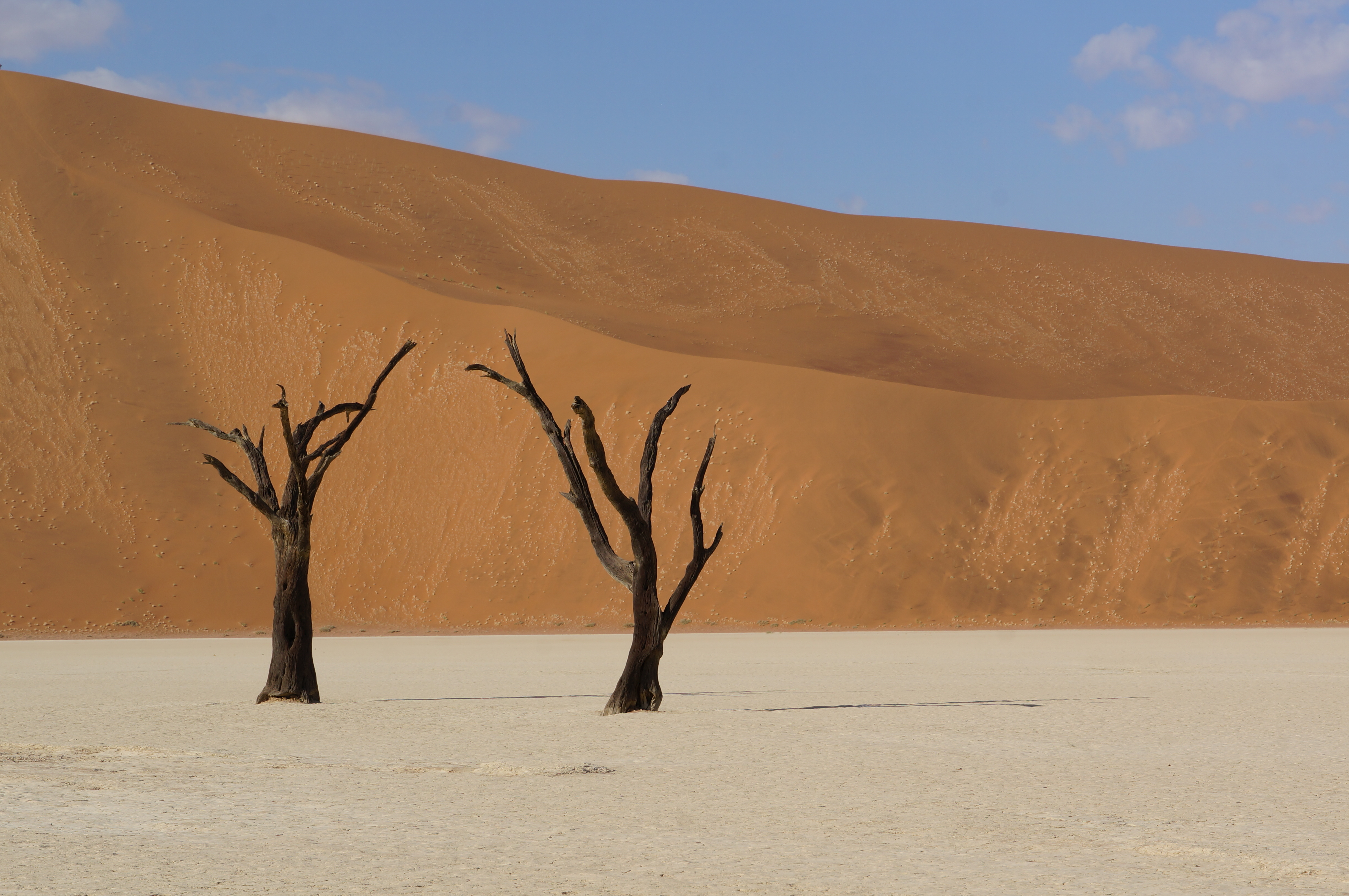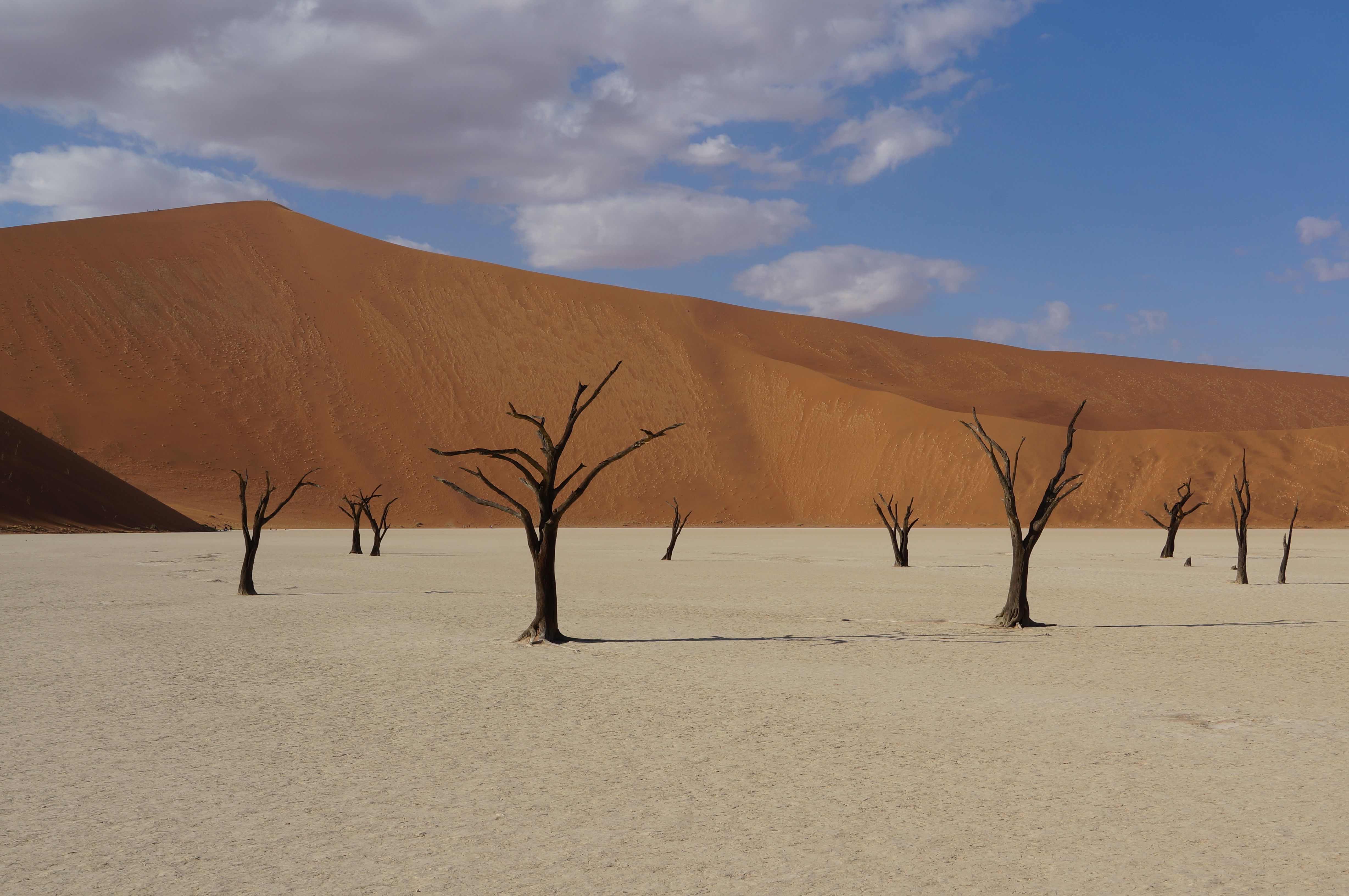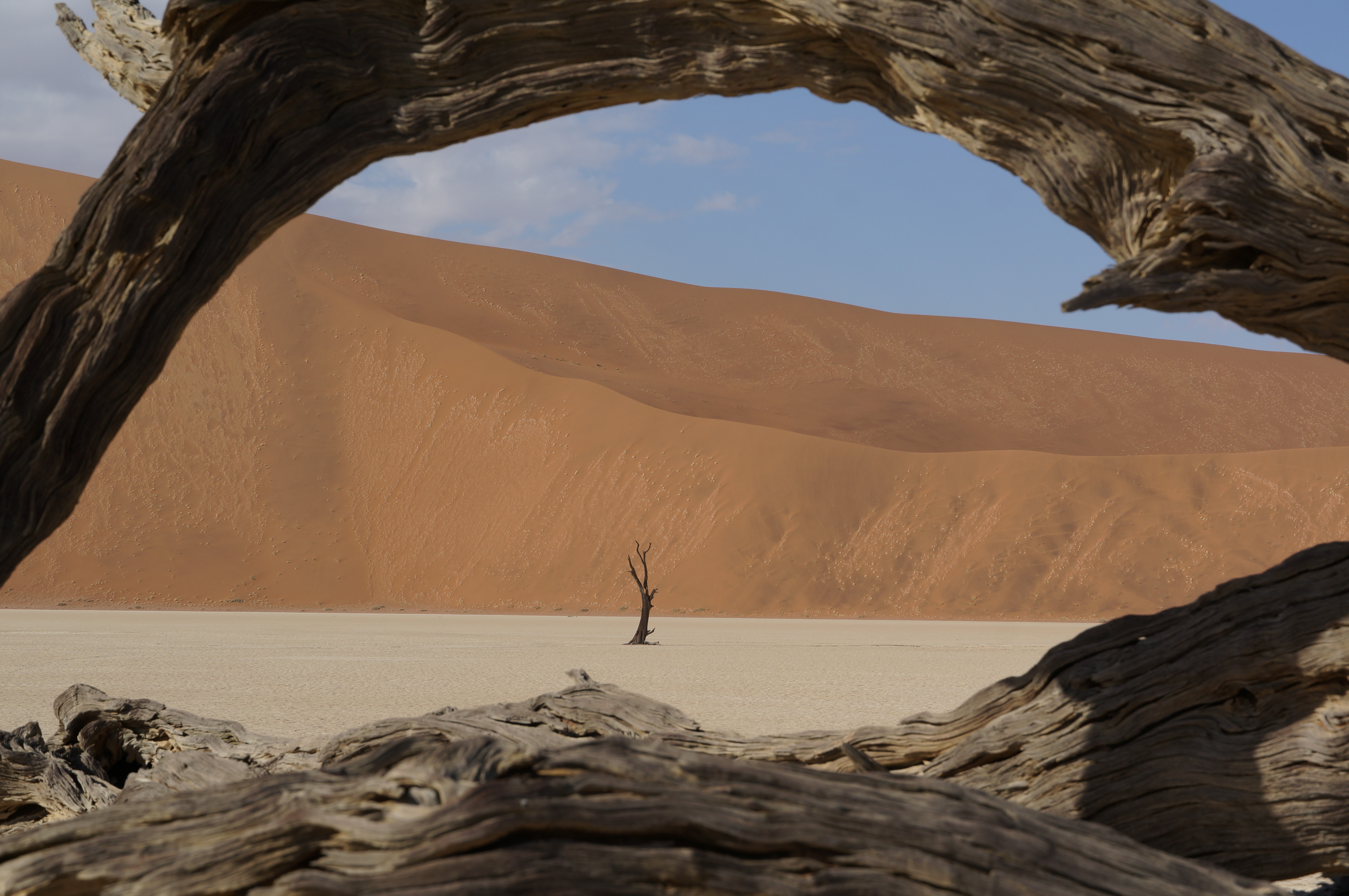 Daarna rijden we door naar de beroemde Deadvlei. Elke reisgids over Namibië opent met een foto die hier gemaakt is. Versteende bomen staan als kunstwerken op een witte vlakte tentoongesteld, met op de achtergrond metershoge zandduinen. Terwijl we rondlopen laten we deze bijzondere plek op ons inwerken. De zon en wolken spelen met de schaduwen op de duinwanden en rond lunchtijd zijn de meeste toeristen verdwenen waardoor we prachtige foto’s kunnen schieten. Wát een bijzondere plek.