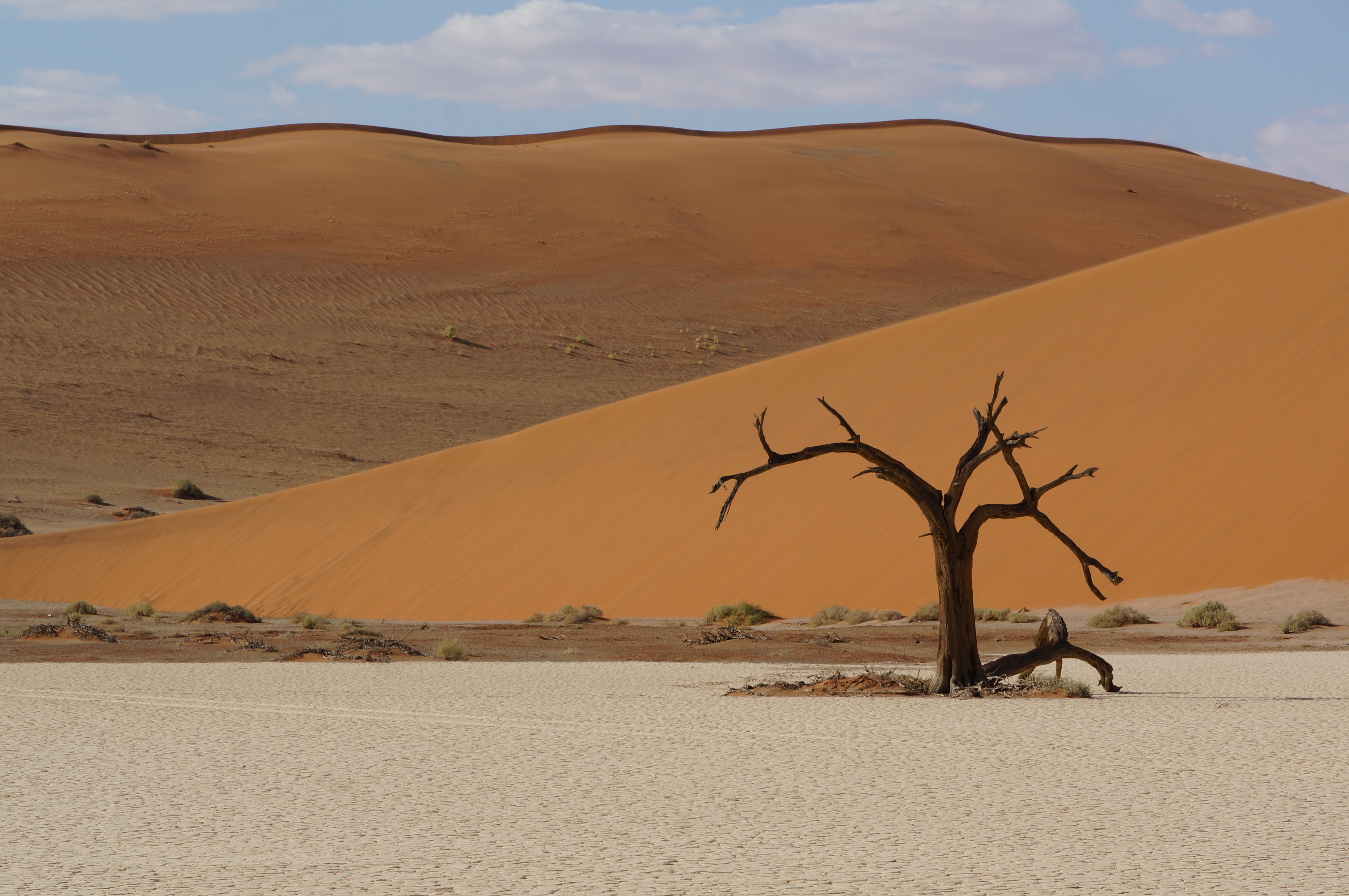 Aan het eind van de middag wandelen we naar de iets verderop gelegen Hidden Vlei. Het is een pittig wandelingetje door de woestijn, maar het is elke stap waard. Verscholen tussen de hoge duinen ligt een spierwitte vlakte die bijna pijn doet aan je ogen. Ellemieke blijft boven, want die heeft genoeg gelopen voor vandaag. In daal over het duin af naar de vallei en sta helemaal alleen op de witte zoutkorst, samen met een paar versteende bomen. In het hoogseizoen, in het meest bezochte nationale park van Namibië, sta ik hier op deze onaardse plek, helemaal alleen. Hoeveel hoogtepunten kan een dag hebben?