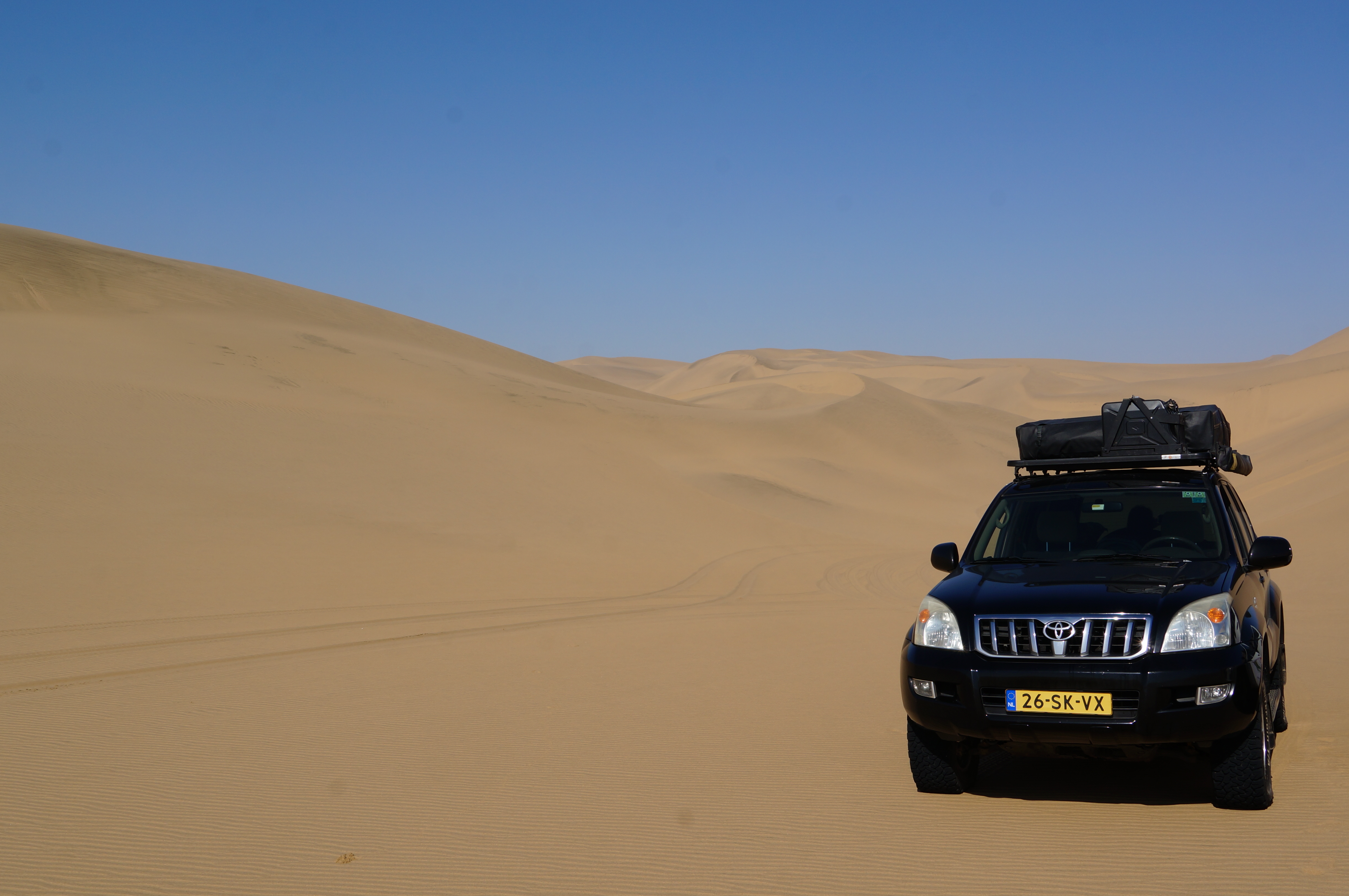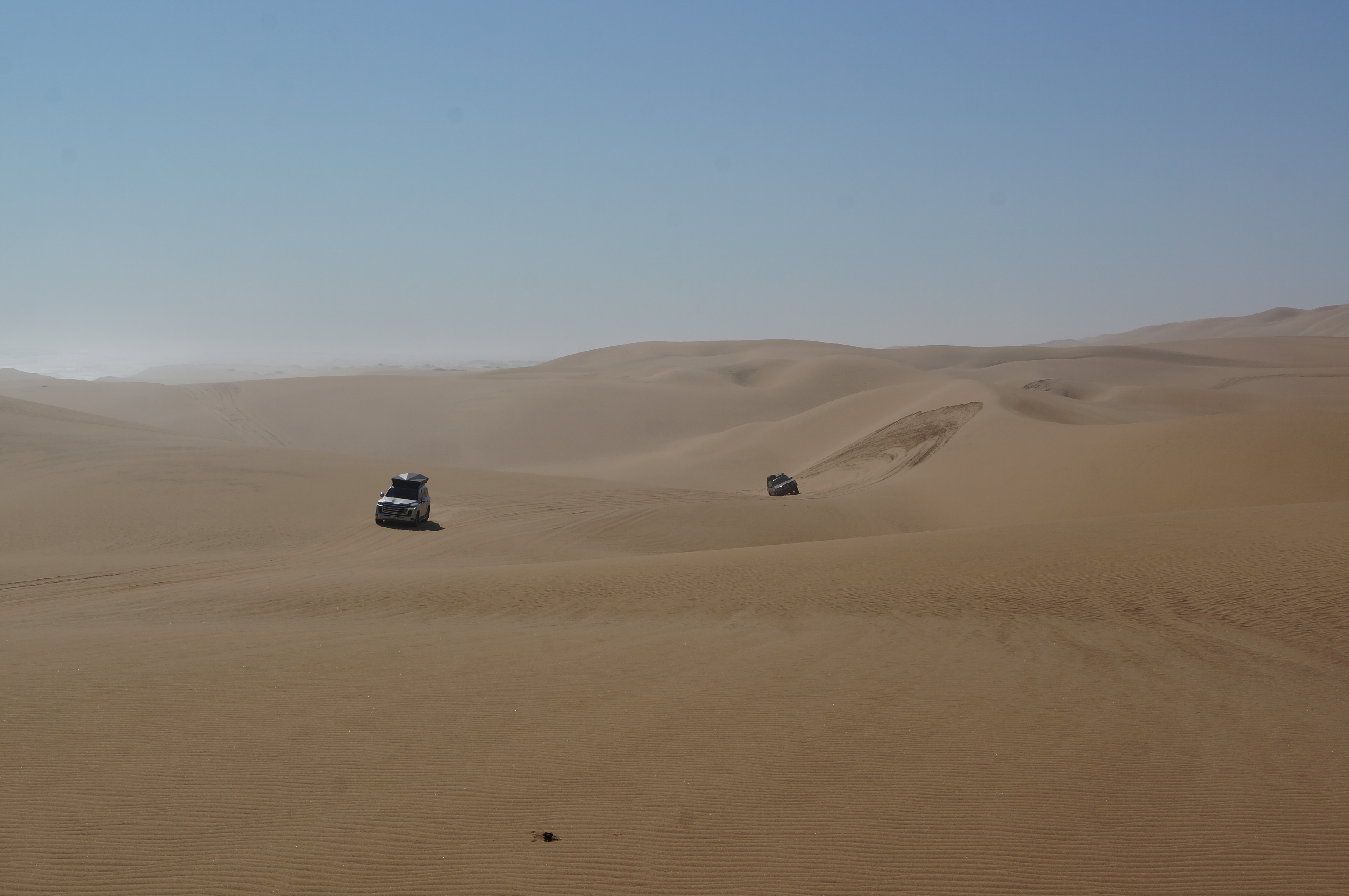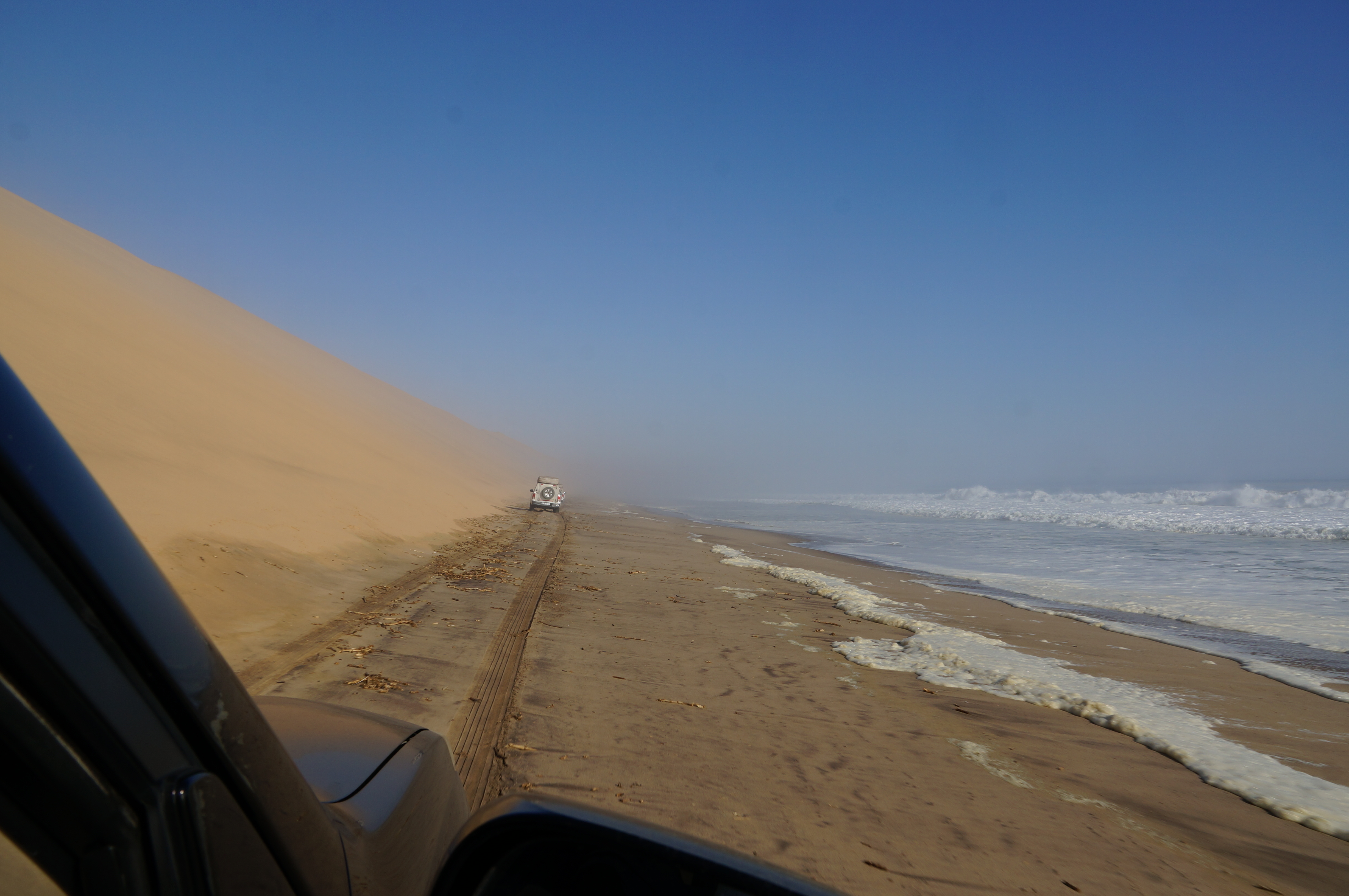 Het is een fantastische middag, waarbij we ons voor even Dakar-rijders voelen. Zover we kunnen kijken zijn er zandduinen met daarachter de zee. We passeren smalle strookjes strand, waar de golven van de zee overheen spoelen en soms even moeten wachten tot het water weer weg is. We rijden enorme zandduinen op en af, soms wel met 45 graden omlaag. We eindigen op de plek waar we gevangen zitten tussen de zee en de woestijn, waar we niet meer verder kunnen rijden omdat er geen strand meer over is. Hier eindigen de hoge duinen direct in de zee, een indrukwekkend gezicht.