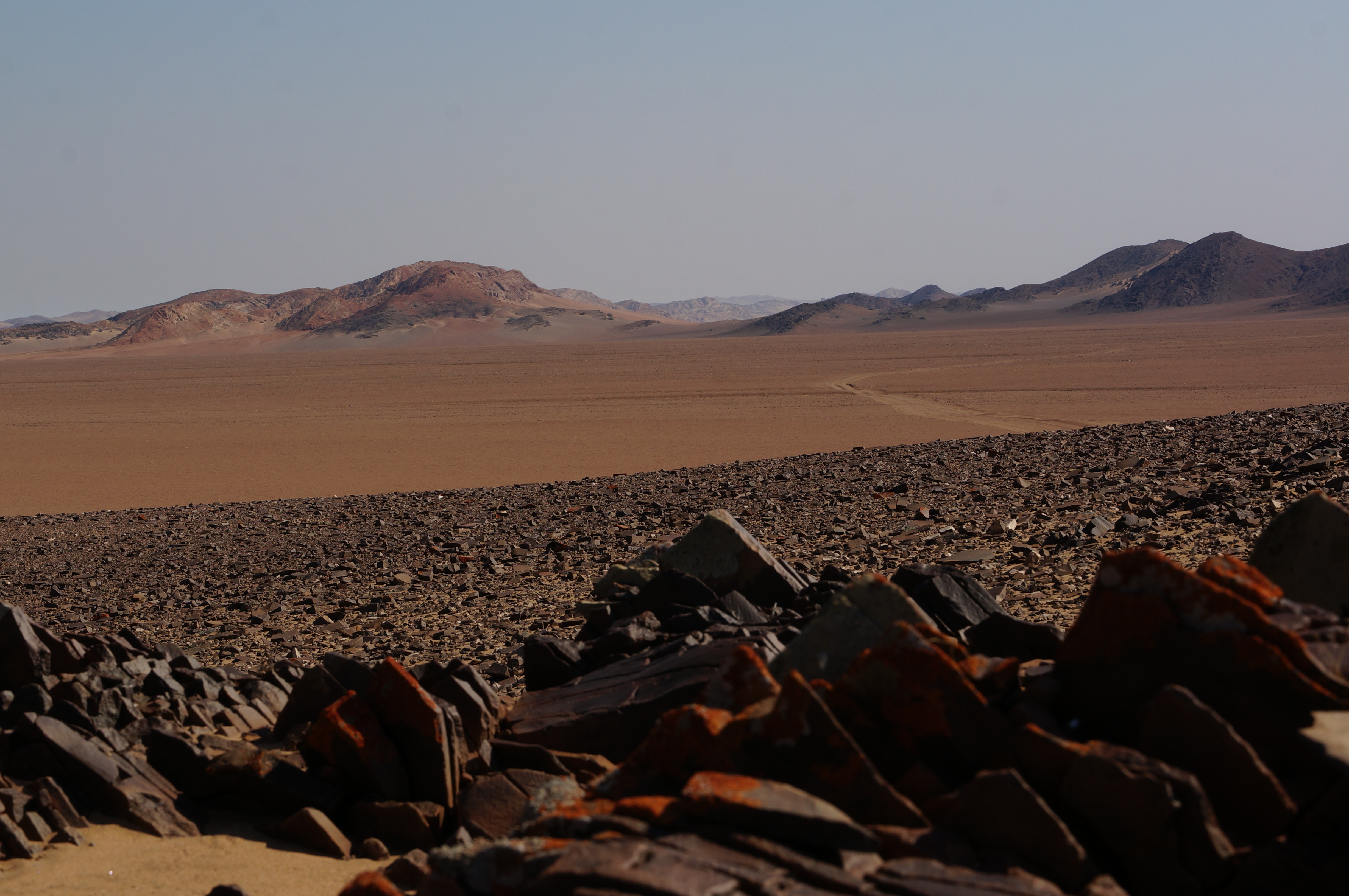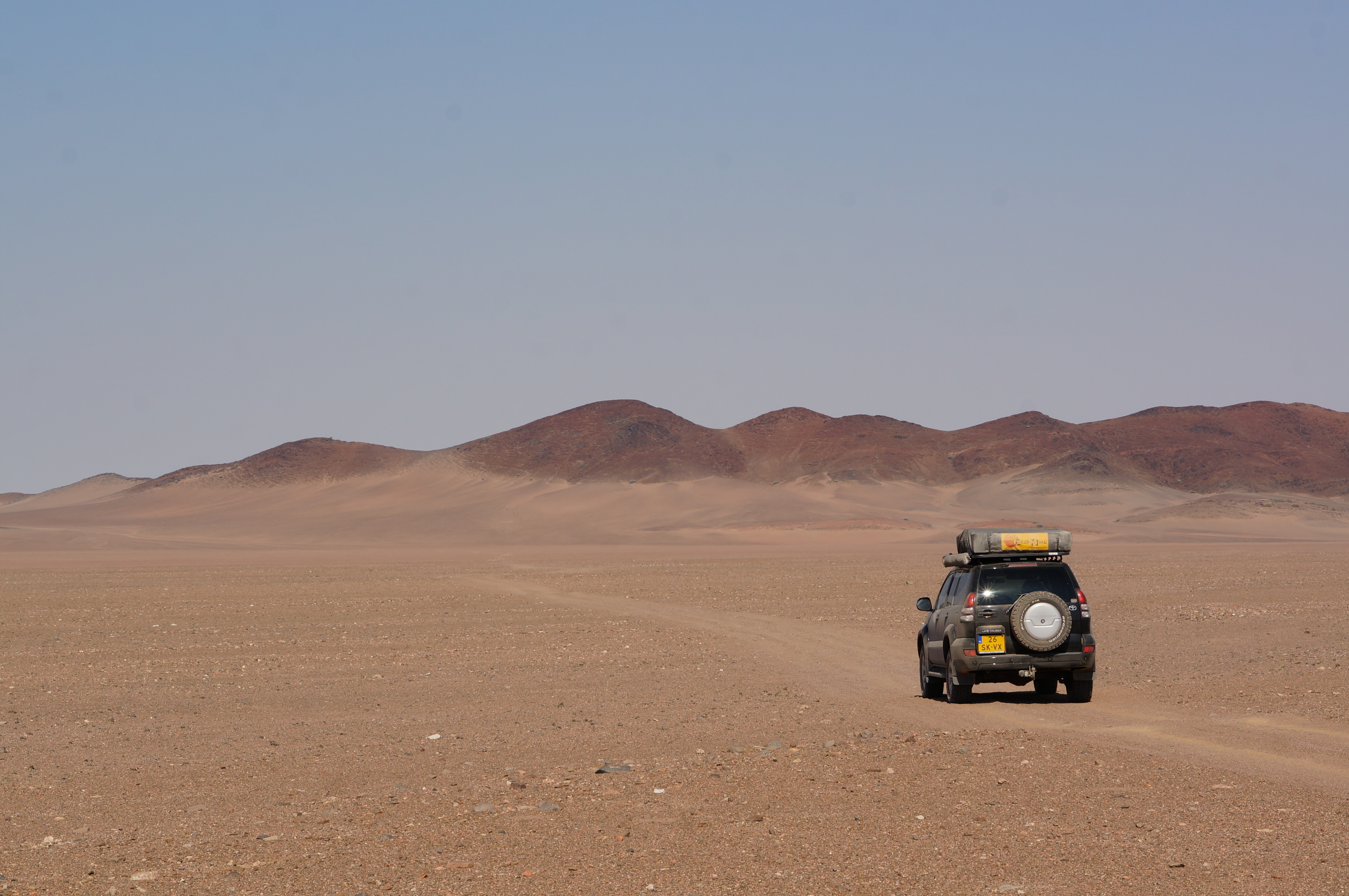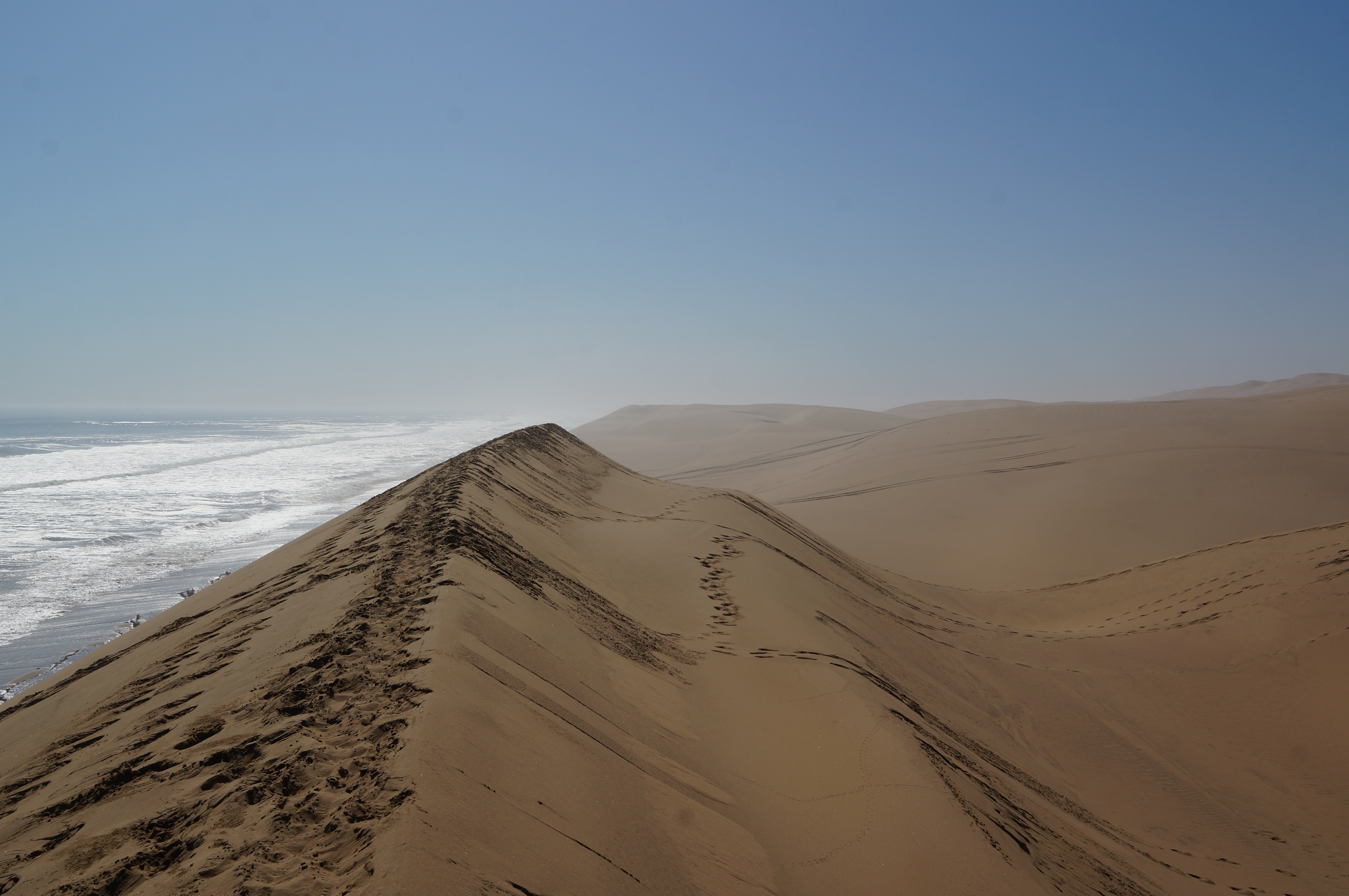 Het is een fantastische middag, waarbij we ons voor even Dakar-rijders voelen. Zover we kunnen kijken zijn er zandduinen met daarachter de zee. We passeren smalle strookjes strand, waar de golven van de zee overheen spoelen en soms even moeten wachten tot het water weer weg is. We rijden enorme zandduinen op en af, soms wel met 45 graden omlaag. We eindigen op de plek waar we gevangen zitten tussen de zee en de woestijn, waar we niet meer verder kunnen rijden omdat er geen strand meer over is. Hier eindigen de hoge duinen direct in de zee, een indrukwekkend gezicht.
