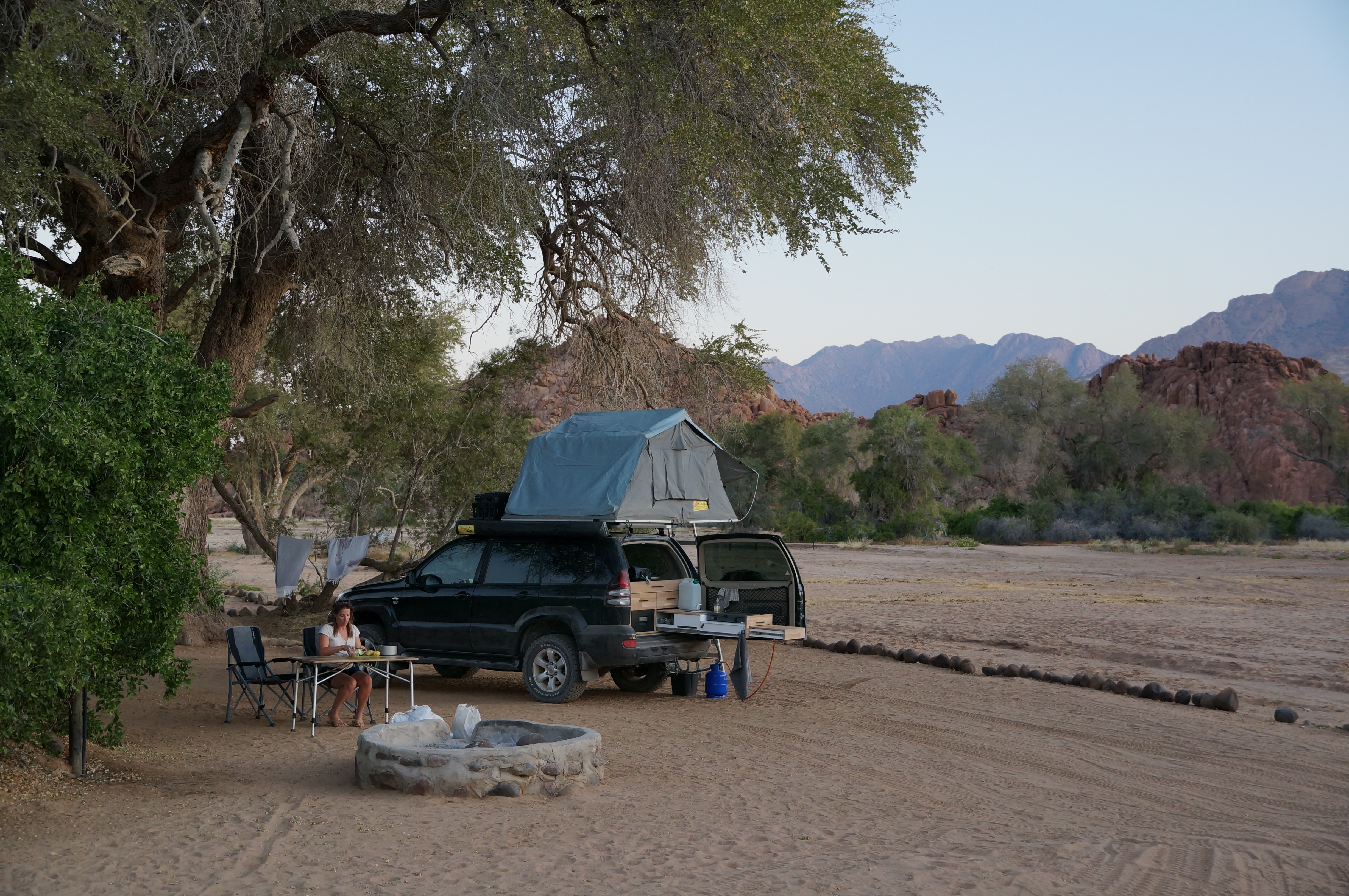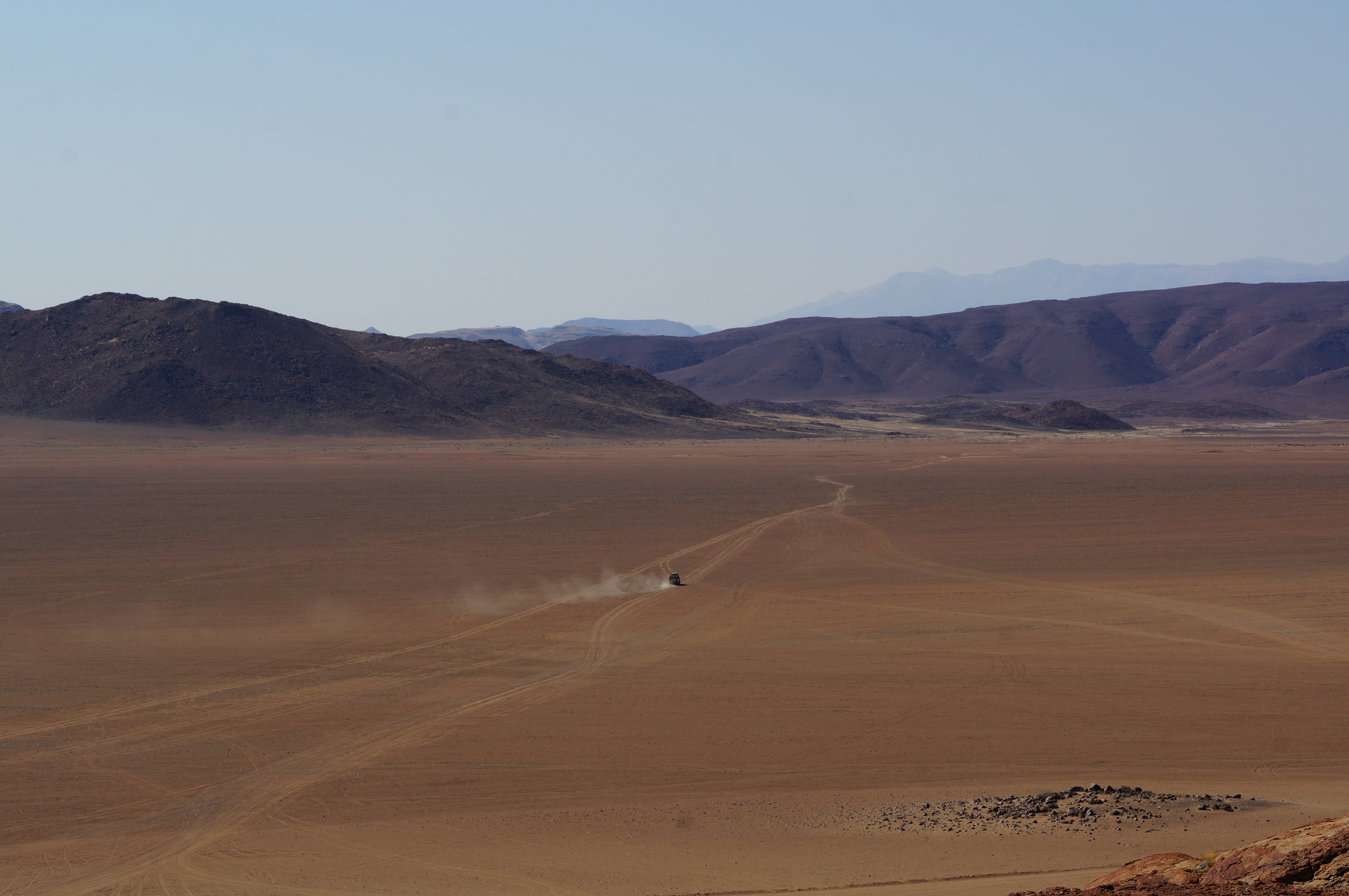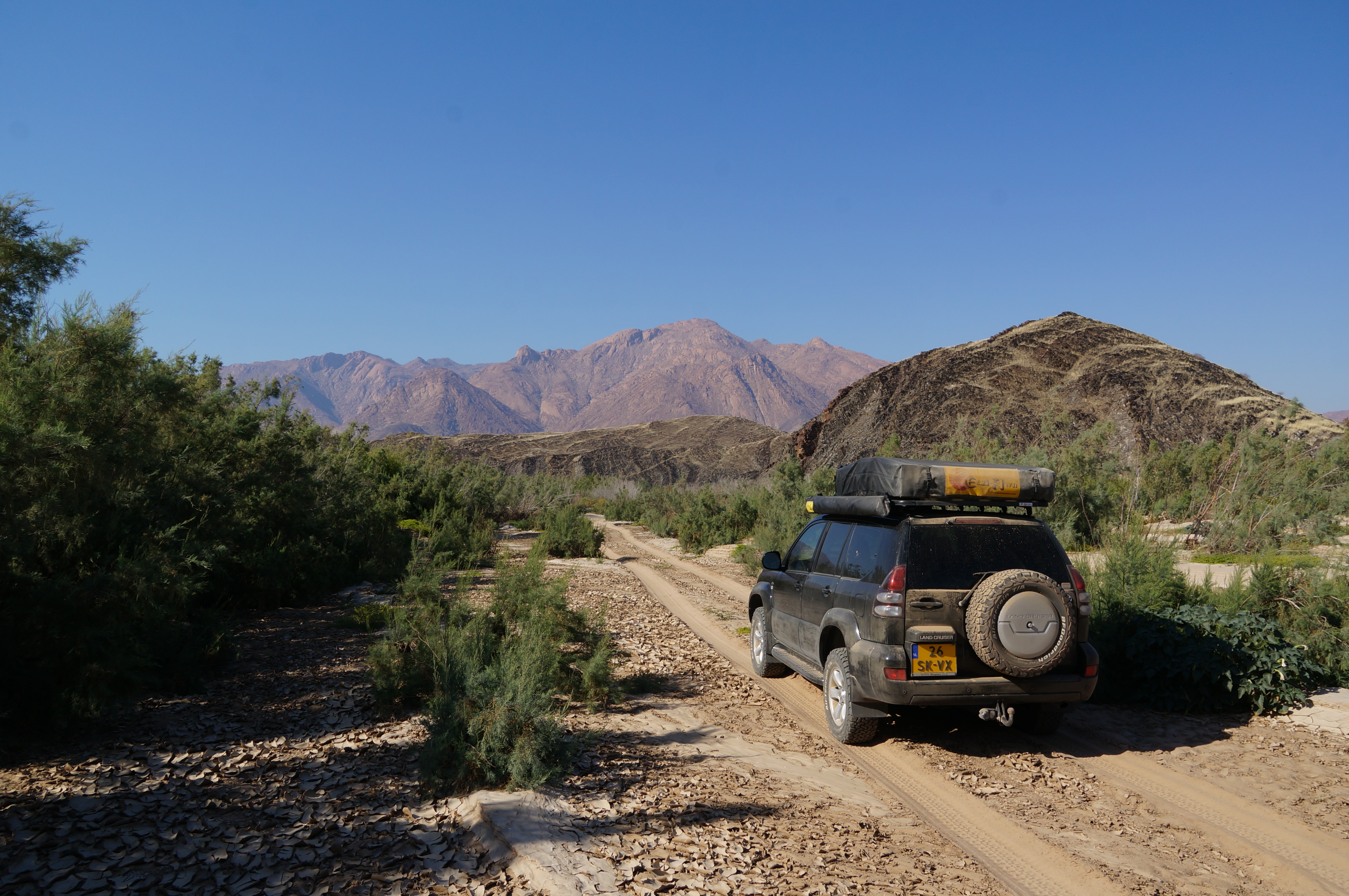 Op de camping die avond hakken we eindelijk de knoop door over een reisplannetje waar we al weken mee worstelen. Ik wil graag naar Kaokoland, het afgelegen noordwesten van Namibië, maar Ellemieke ziet het niet zitten omdat het iets teveel off the grid is. We bereiken een compromis: we reizen een stukje het gebied in en gaan vanuit het dorpje Purros de omgeving ontdekken. Voor een volledige trip door het gebied zouden we meer dan een week uit moeten trekken, omdat de wegen nauwelijks begaanbaar zijn. Jeepsporen voeren door zanderige rivierbeddingen en over eindeloze vlaktes. Het grootste deel van Kaokoland is niet te bereiken zonder stevige terreinwagen, maar die hebben we gelukkig bij ons. In een paar dagen reizen we naar Purros, maar de laatste honderd kilometer zijn vreselijk. We stuiteren urenlang over wasbordweggetjes waarvan je de ribbels vanuit een vliegtuig waarschijnlijk nog kan zien. We passeren stoffige dorpjes waar we wat nog wat proviand bij elkaar sprokkelen, ver voorbij het punt waarop we nog verse producten kunnen kopen. We vullen de brandstoftankjes op het dak, want diesel kunnen we voorlopig niet meer krijgen. Dit stuk van Namibië is daarvoor te ver afgelegen. We zien het landschap veranderen. Leeg wordt leger, droog wordt droger. Dit is Namibië in het kwadraat. Uiteindelijk bereiken we de community-camping in de buurt van Purros.