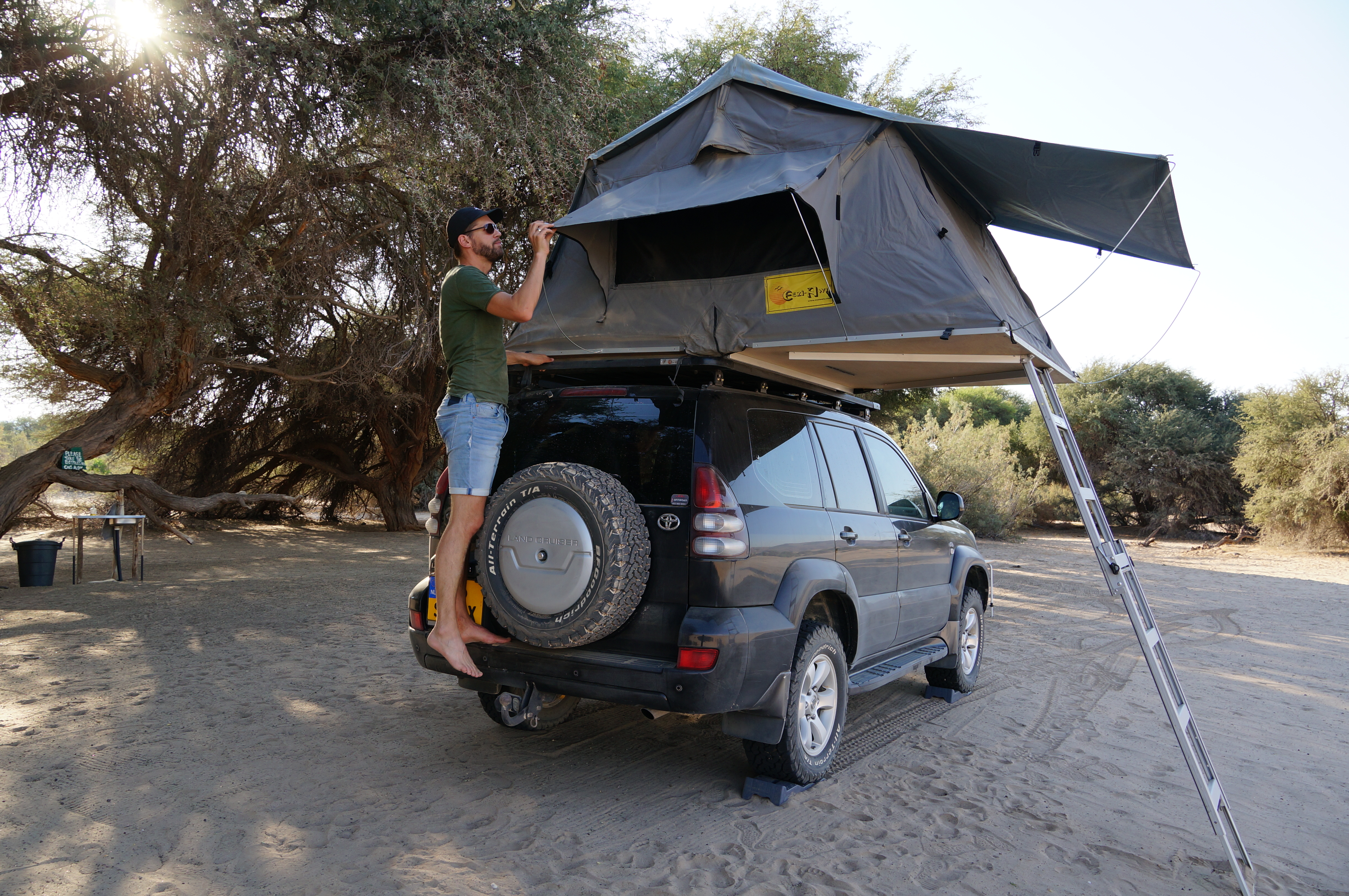 Na drie prachtige dagen in Etosha rijden we verder naar het oosten. We zitten nu in Tsumeb, een stad met bouwmarkten, een Toyota-garage en andere werkplaatsen. We laten de onderplaat van de Land Cruiser nu goed vastzetten, maar inmiddels is hij te ver gescheurd om het de rest van de reis uit te houden. De werkplaatschef verwijst ons door naar een metaalbewerker, die voor ons een stevige plaat op maat maakt. Ook loop ik alle bouten en schroeven van het dakrek en de tent na, want er komen soms vreemde geluiden vanaf.
