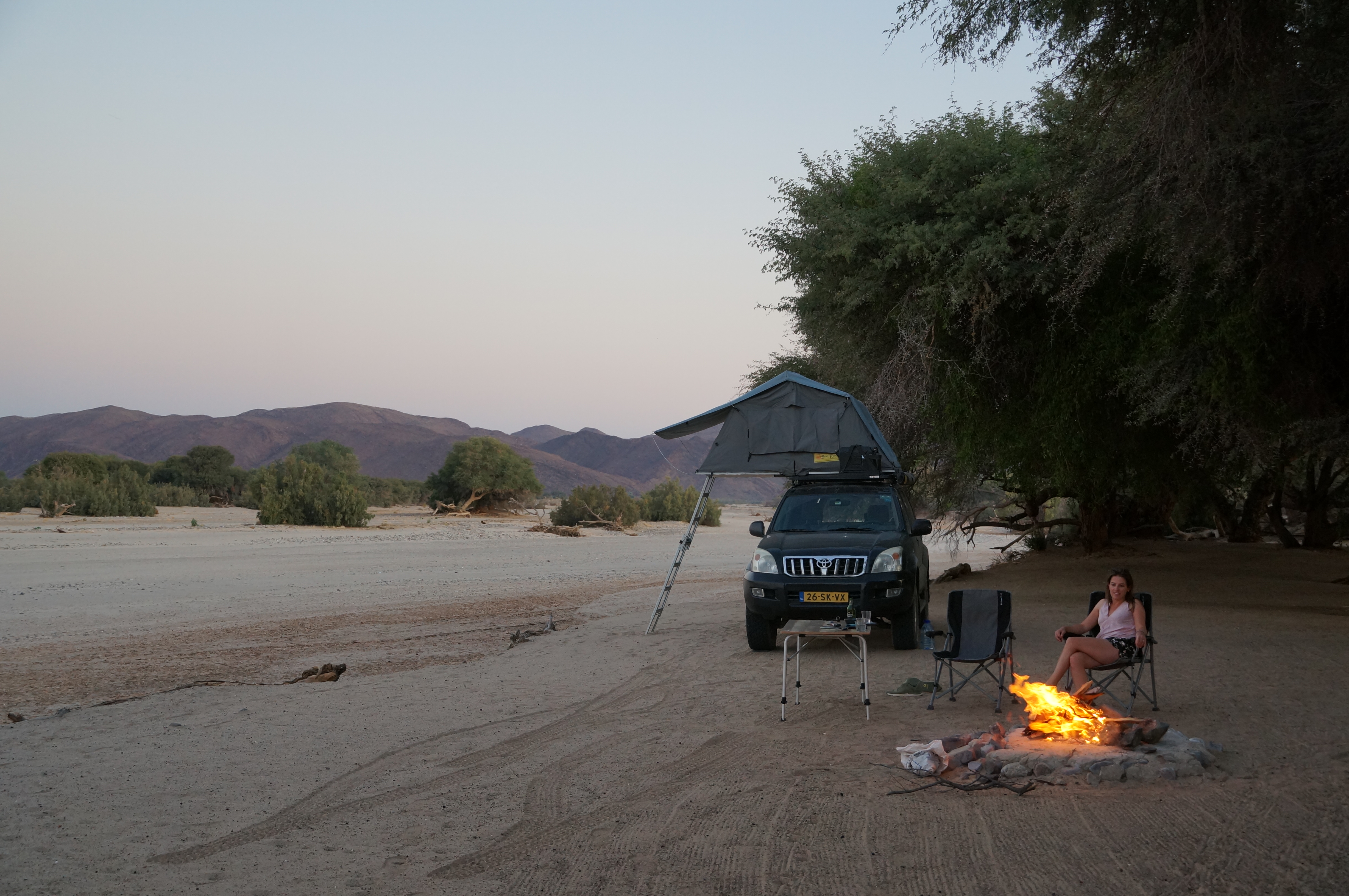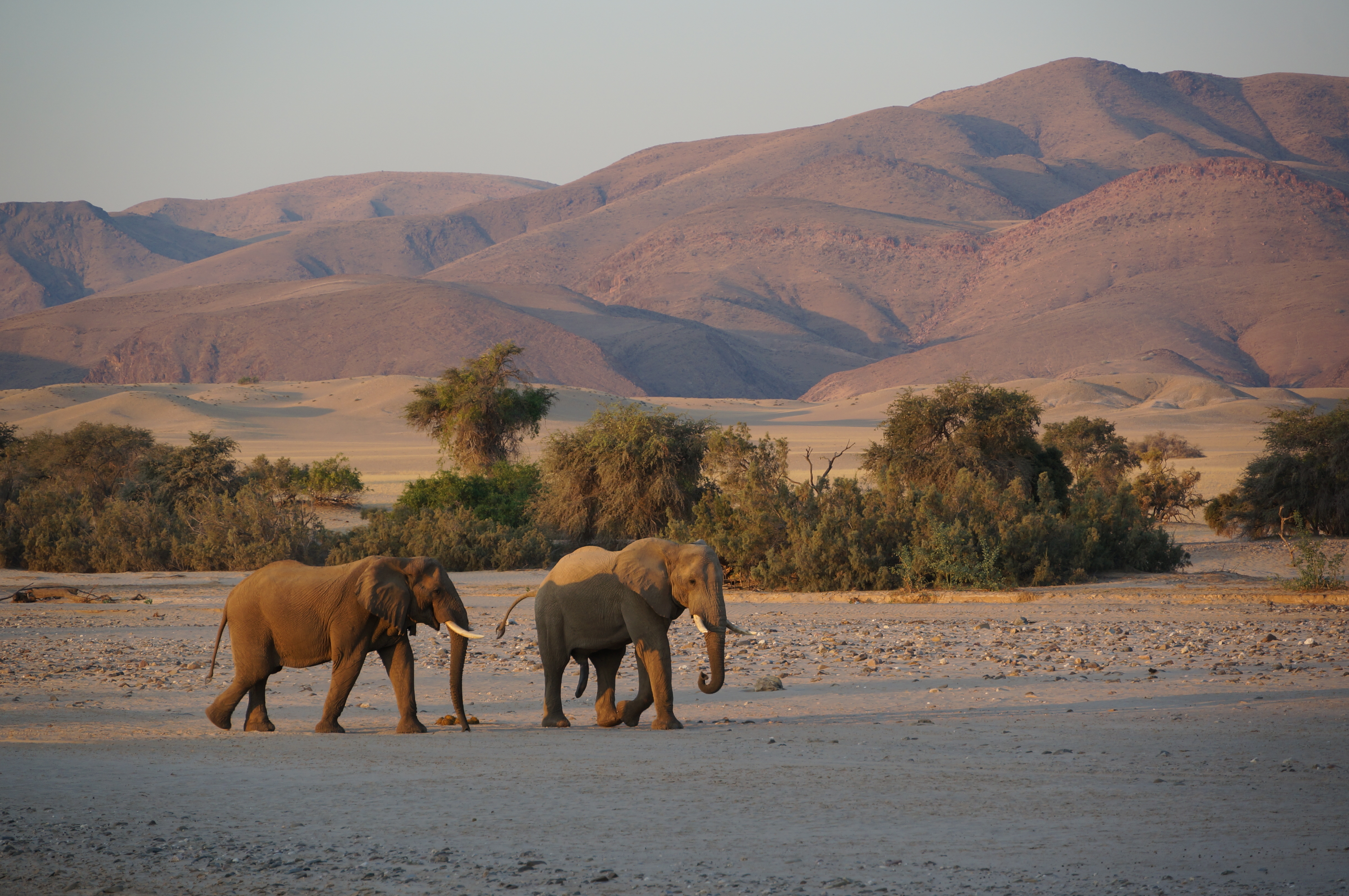 Purros. Een plaatsje in het afgelegen wilde noordwesten van Namibië. Even buiten het dorp staan we op een plekje aan de droge rivierbedding. De zon is bijna onder en legt een oranje gloed over de bergen in de verte. In het laatste zonlicht steken twee woestijnolifanten de rivierbedding over. Ze lopen geruisloos door het diepe zand en verdwijnen even later tussen de bomen aan de overkant. Sommige momenten van deze reis zullen ons voor altijd bijblijven.