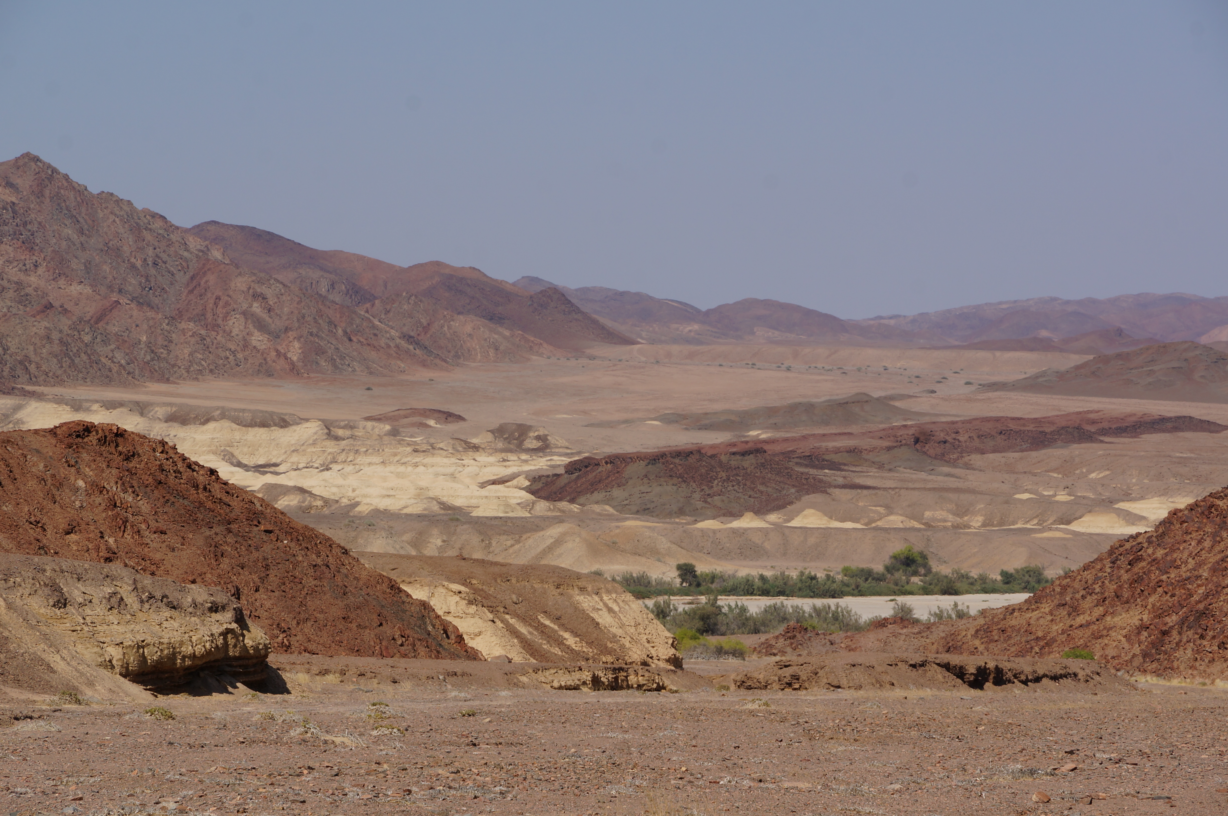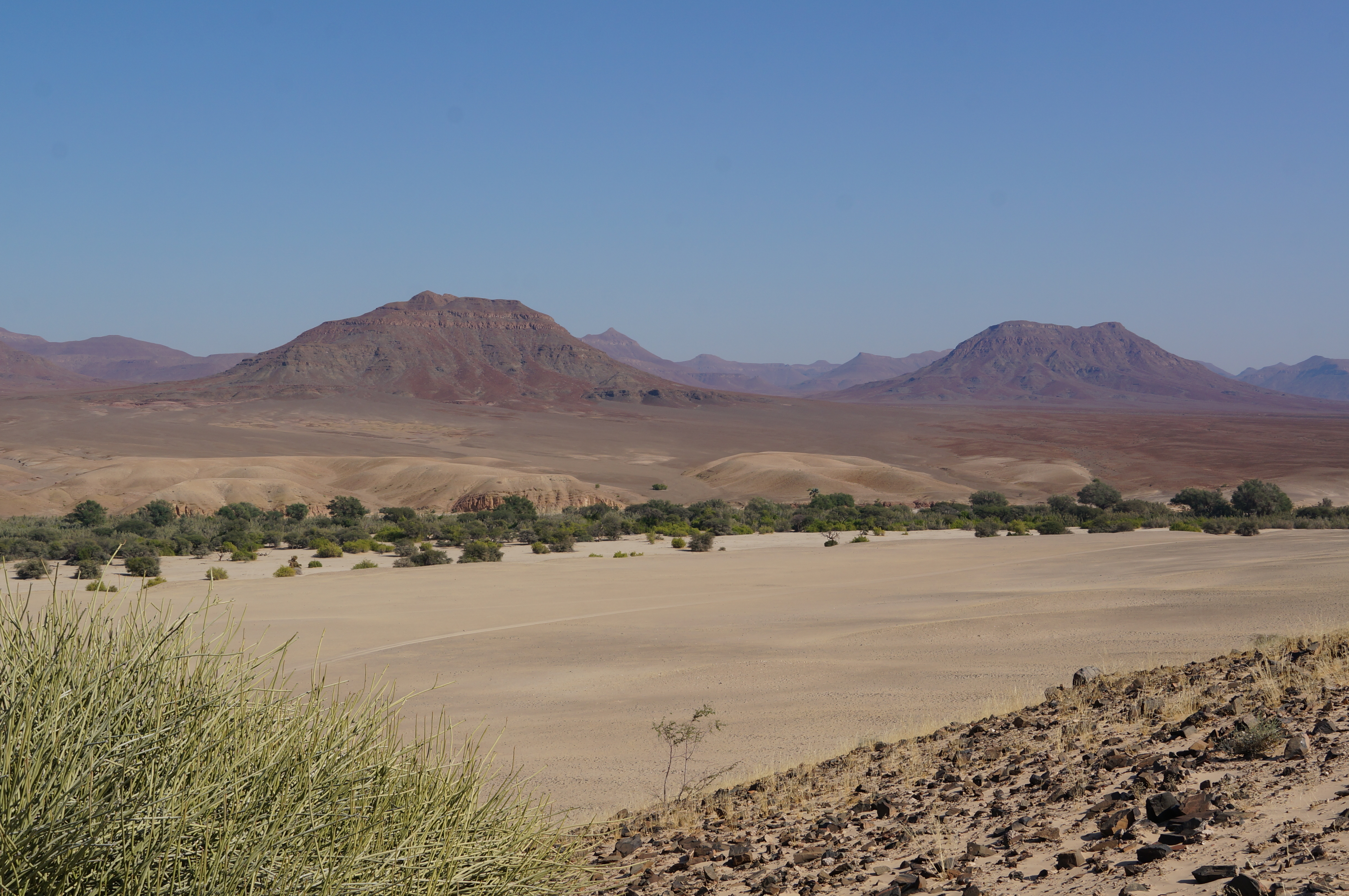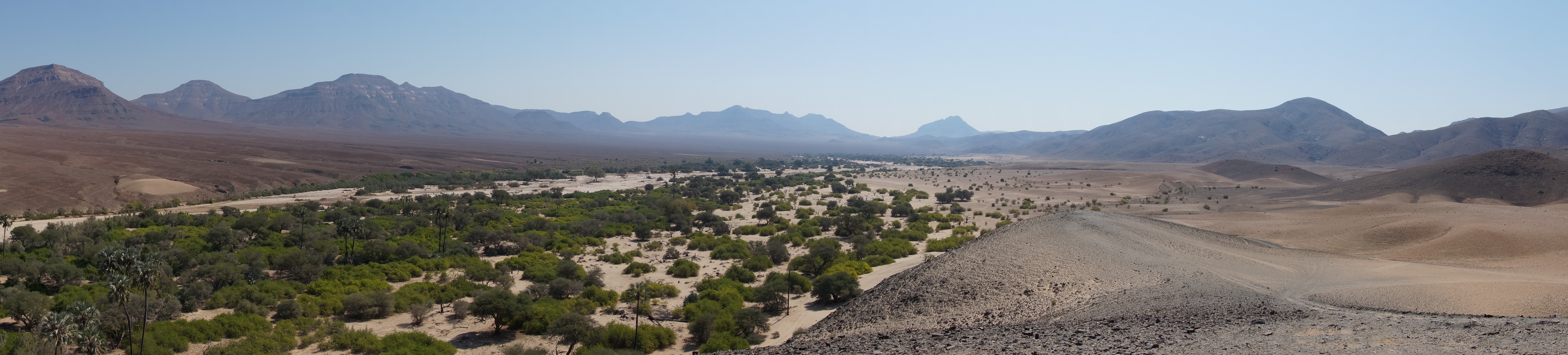 Koakoland is de plek waar de laatste woestijnolifanten ter wereld leven. Als we aankomen op de camping zien we pootafdrukken van hun laatste bezoek in het zand staan. Dit is geen plek waar hekken staan, maar waar mensen en dieren door elkaar leven. De volgende dag trekken we het gebied in, we volgen de rivierbedding en wandelen of rijden hier en daar een heuvel op om uit te kijken. Wat is dít een bizar landschap. Alsof een enorme reus allemaal stukjes aarde van over de hele wereld naast elkaar heeft neergekwakt. Zandduinen, palmenoases, bergen, rivierbeddingen en kraters lopen in één panorama in elkaar over. We zien giraffes en woestijnolifanten lopen in de rivierbeddingen, waar op sommige plekken nog wat water in staat.