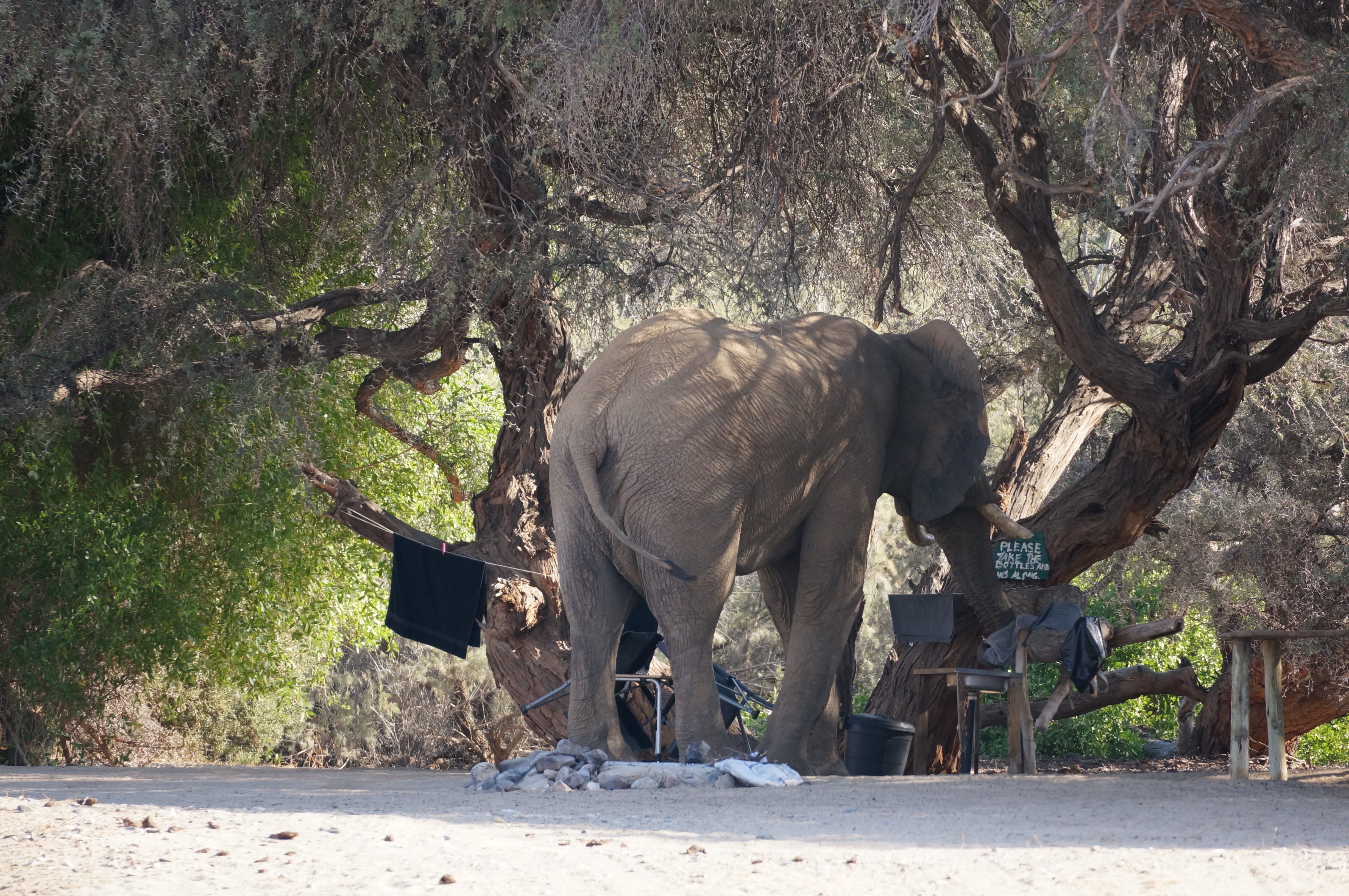 Als we terugkomen op het campinkje staan er twee olifanten op de plek naast die van ons. We besluiten om op een afstandje te wachten tot Jumbo en zijn vriendje uitgescharreld zijn. We zien hoe een van de olifanten onze plek oploopt, waar hij naast onze tafel en stoelen gaat staan en probeert om water uit het kraantje te halen. Met zijn slurf slaat hij tegen een van onze handdoeken aan, die daarna een mooie afdruk heeft. Gelukkig blijft alles verder heel en kunnen we na een uurtje terug naar ons plekje. De zon is dan al aan het zakken en Ellemieke blijft angstvallig de bosjes in turen om te kijken of de olifanten niet terugkomen. Dat doen ze wel, maar op iets meer afstand. Terwijl hun grijze huid bijna roze oplicht van de laatste zonnestralen lopen ze geruisloos voor onze neus voorbij door de rivierbedding. We kijken ademloos toe vanuit onze campingstoelen. Wát een moment.