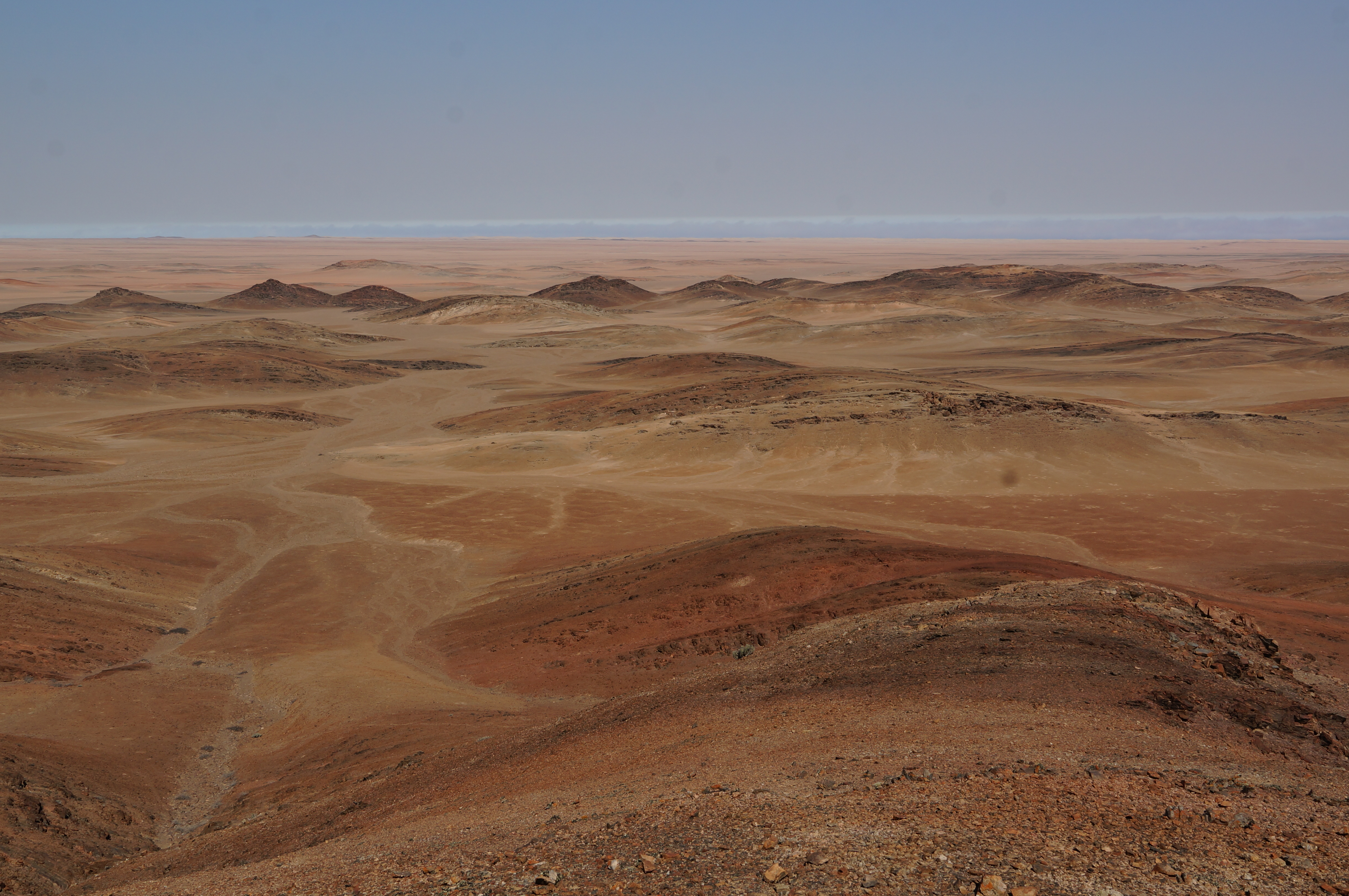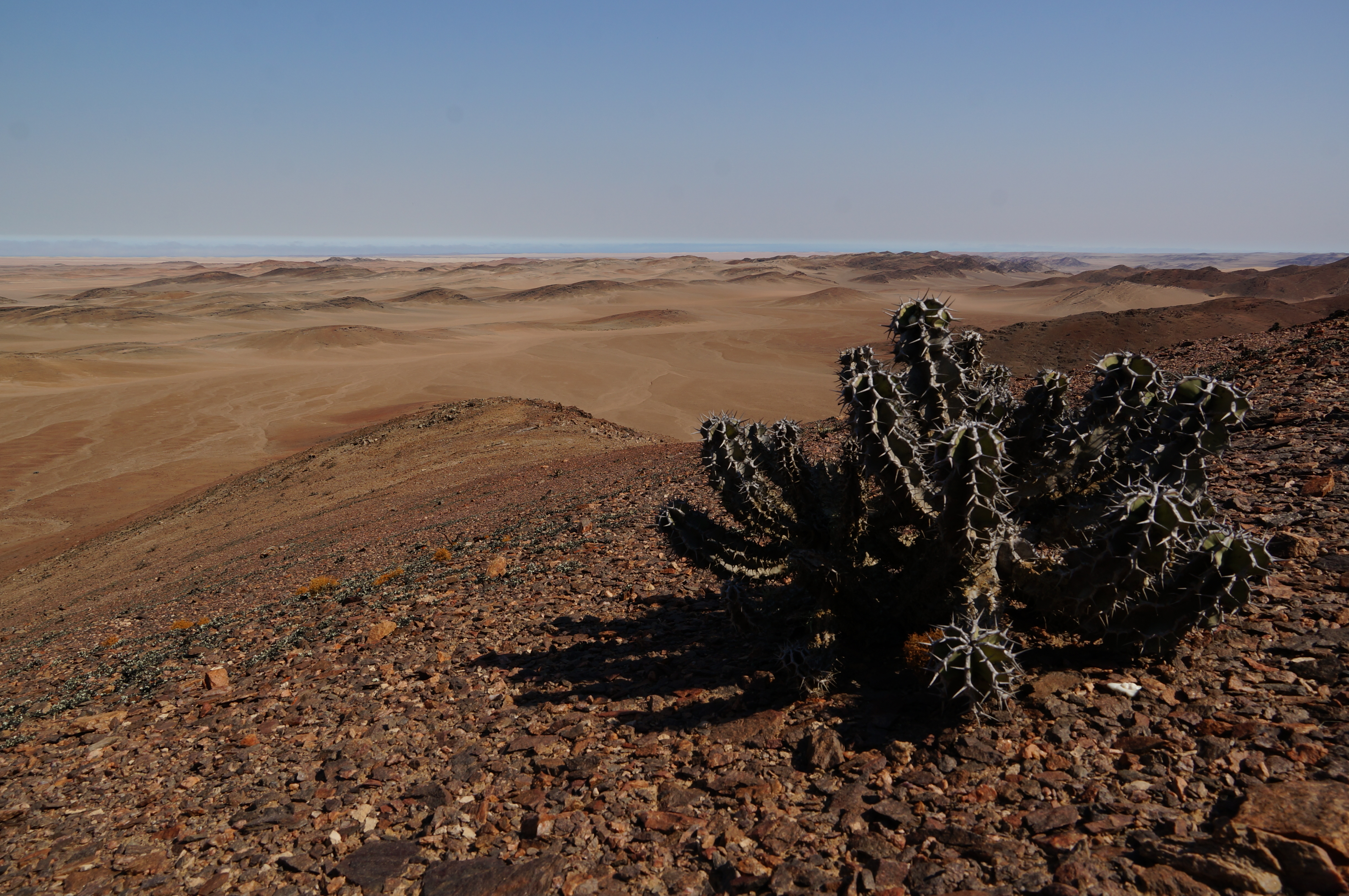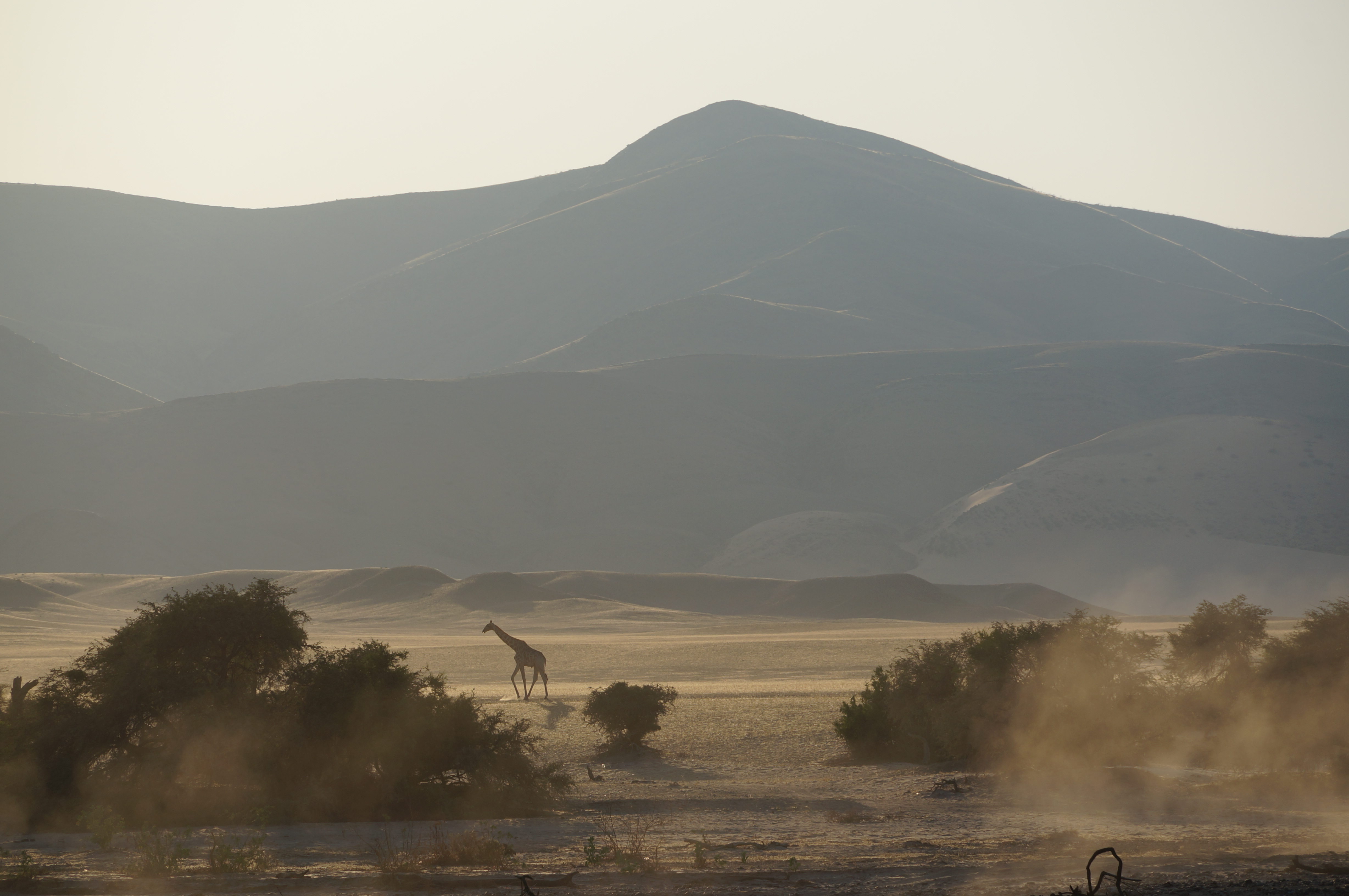 Het verhaal van de olifant is nog niet ten einde, want de volgende ochtend staan de twee zwaargewichten vijftig meter verderop in de bosjes hun ontbijt op te peuzelen. Even daarvoor zagen we in het ochtendlicht vanuit onze daktent al een kudde giraffes voorbijlopen. Het is de voorbode van weer een prachtige dag. We rijden door een bizar landschap naar een uitzichtspunt, waar we uitkijken over de Skeleton Coast tot aan de Atlantische Oceaan. Weer schieten woorden tekort om te beschrijven wat we zien en de foto’s waarschijnlijk ook. Het is onwerkelijk, niet te bevatten en vooral prachtig.