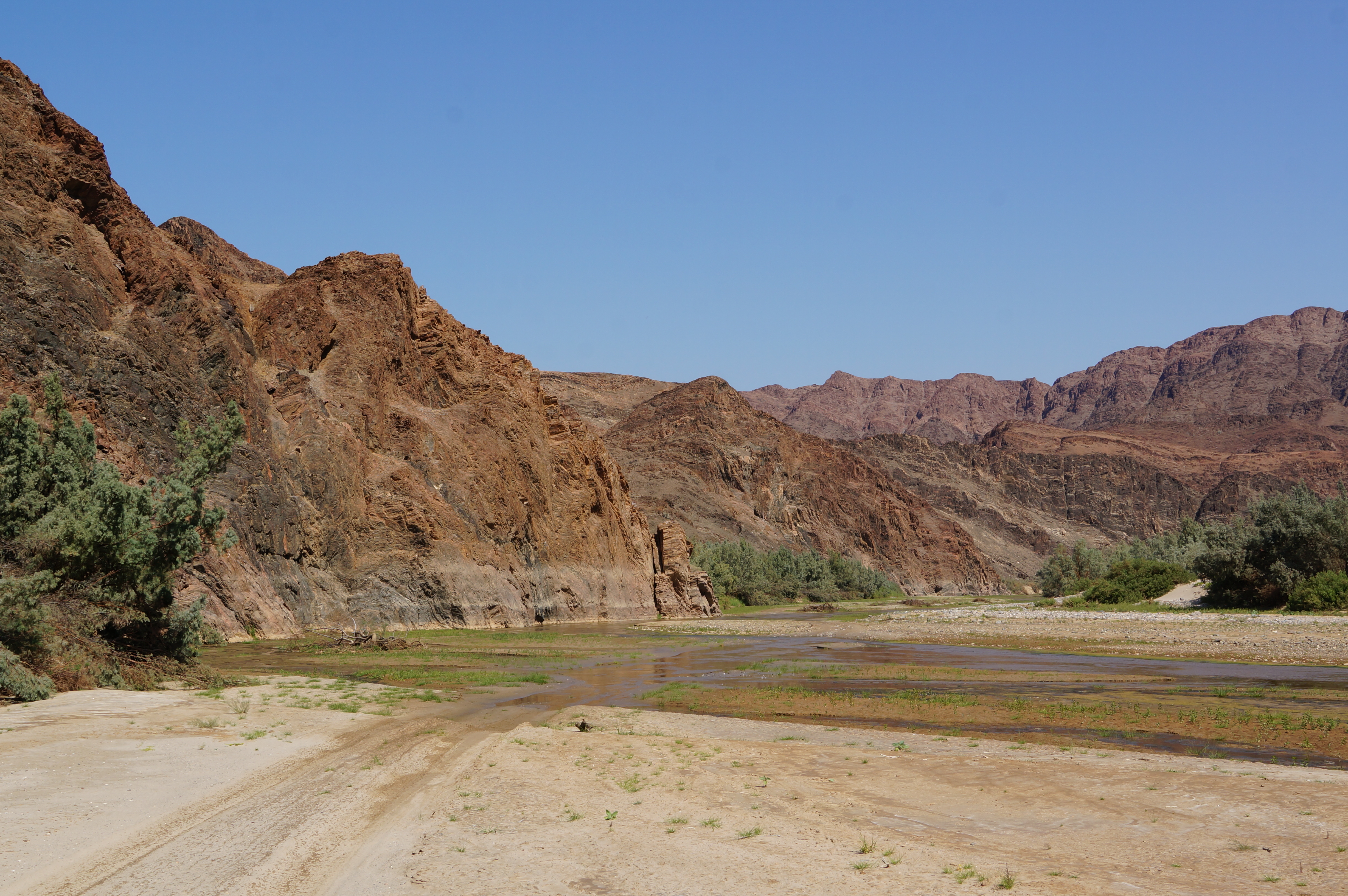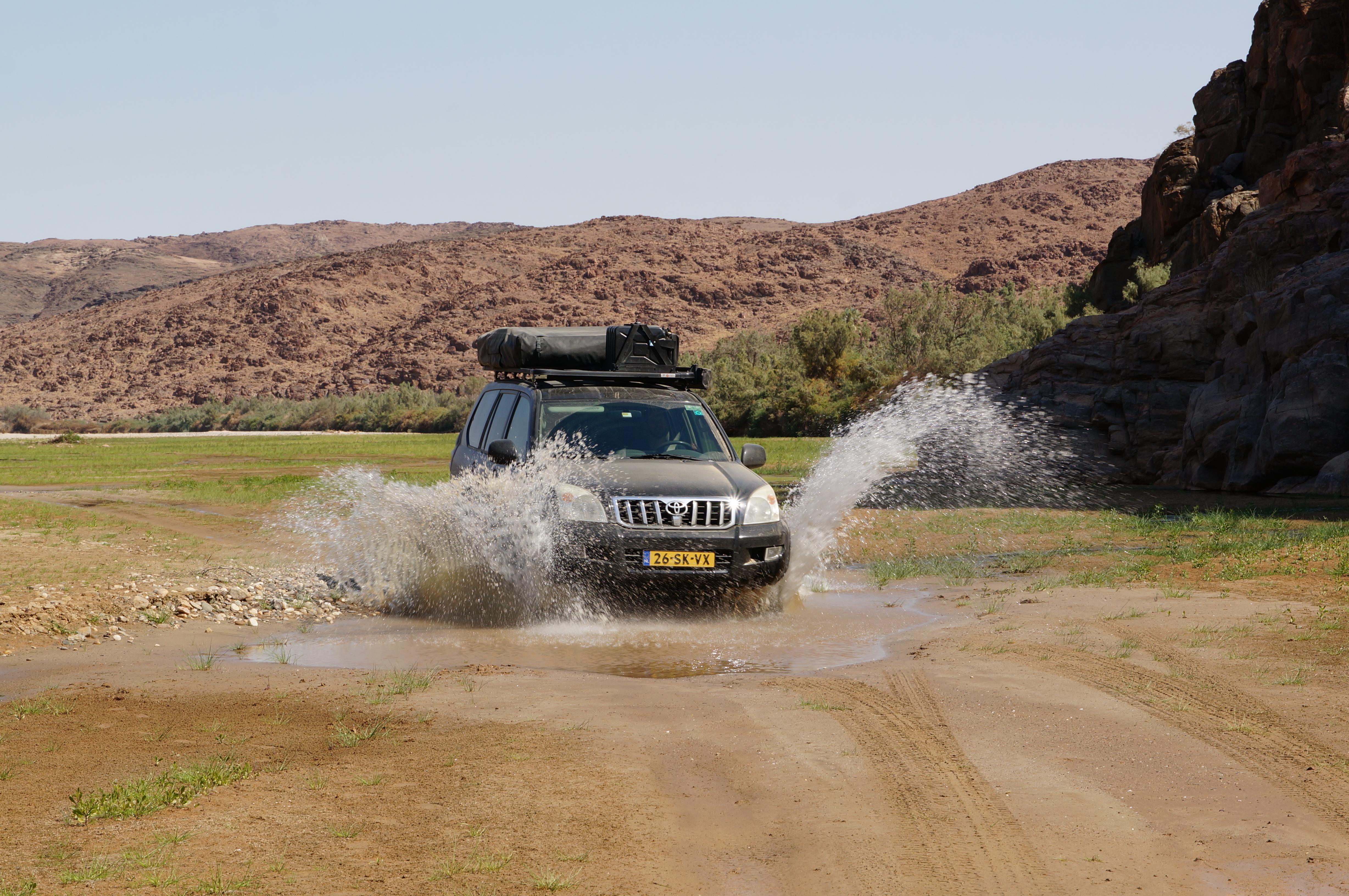 Op de terugweg nemen we een omweg door de Hoarusib-kloof, waar een jeepspoor langs en door de rivier leidt. Opeens rijden we door een groene oase en Ellemieke is blij is dat ze eindelijk weer wat groen ziet. Ondertussen vermaak ik me prima met het cruisen door de rivier en het zand. De volgende ochtend nemen we afscheid van Kaokoland en blijkt dat de olifanten ’s nachts ook nog even gedag hebben gezwaaid. Op slechts een meter van het trappetje van onze tent staan verse pootafdrukken…