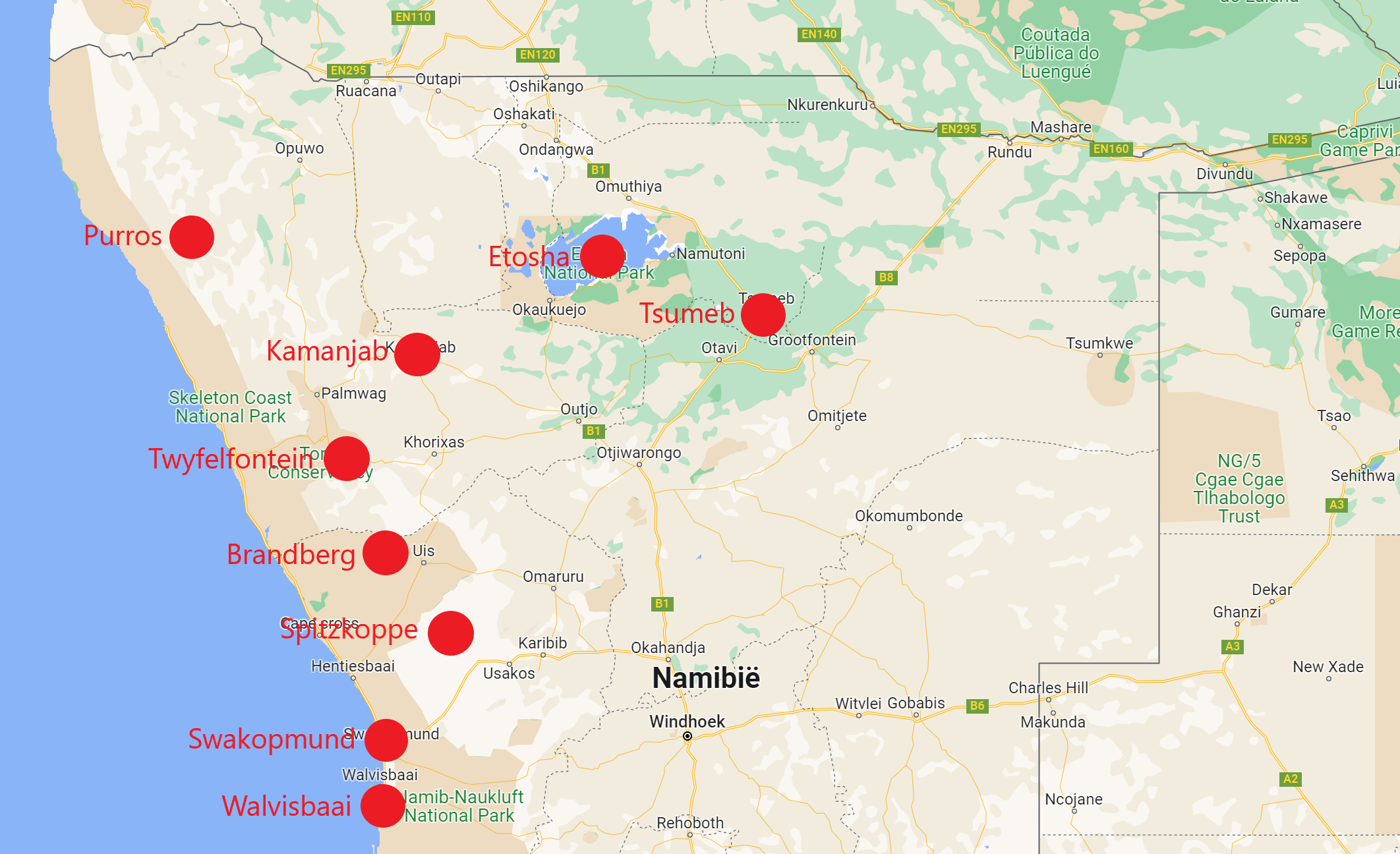 Kaartje met de route in chronologische volgorde: Swakopmund – Walvisbaai – Spitzkoppe – Brandberg – Twyfelfontein – Kamanjab – Purros – Etosha – Tsumeb