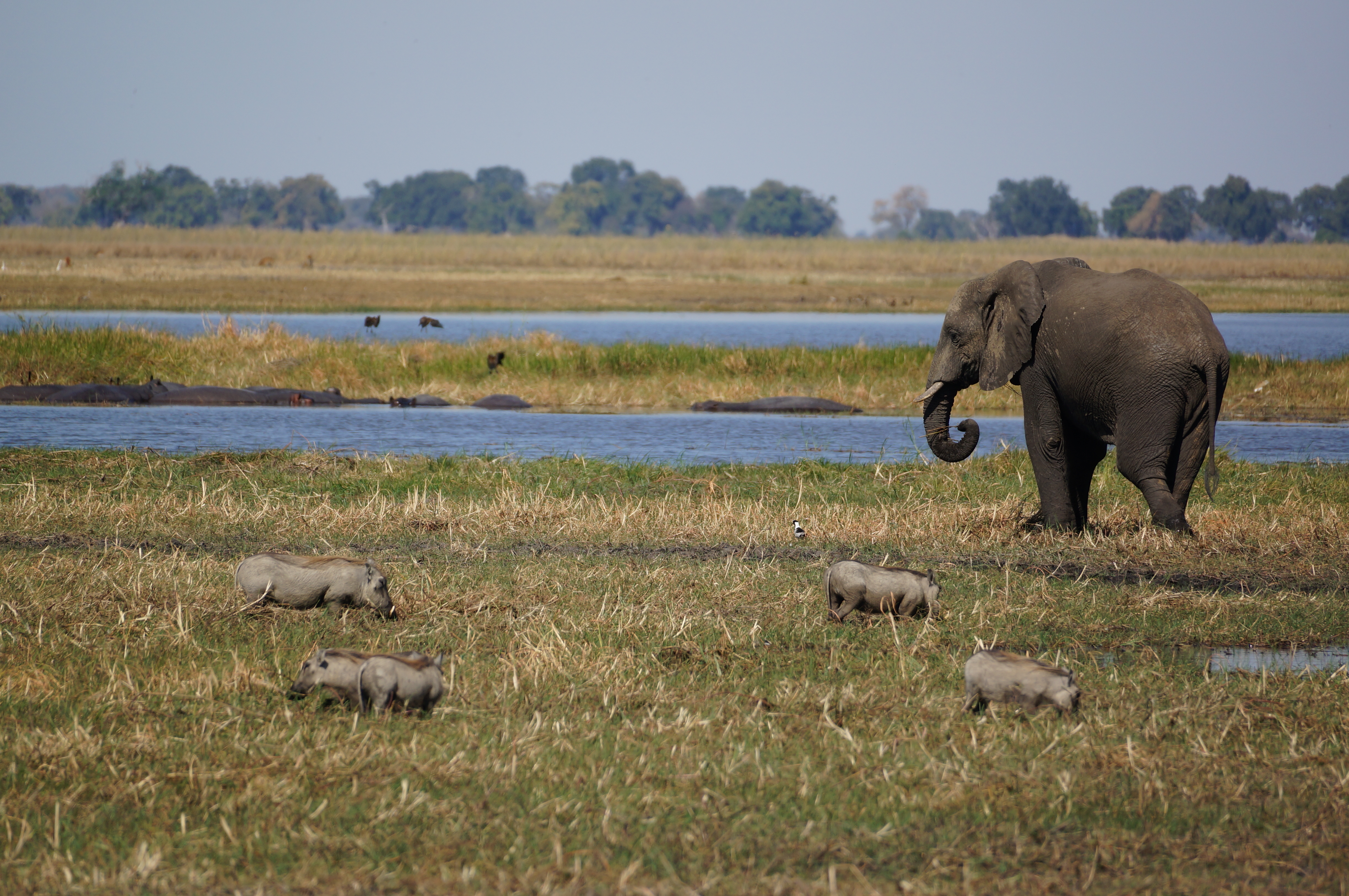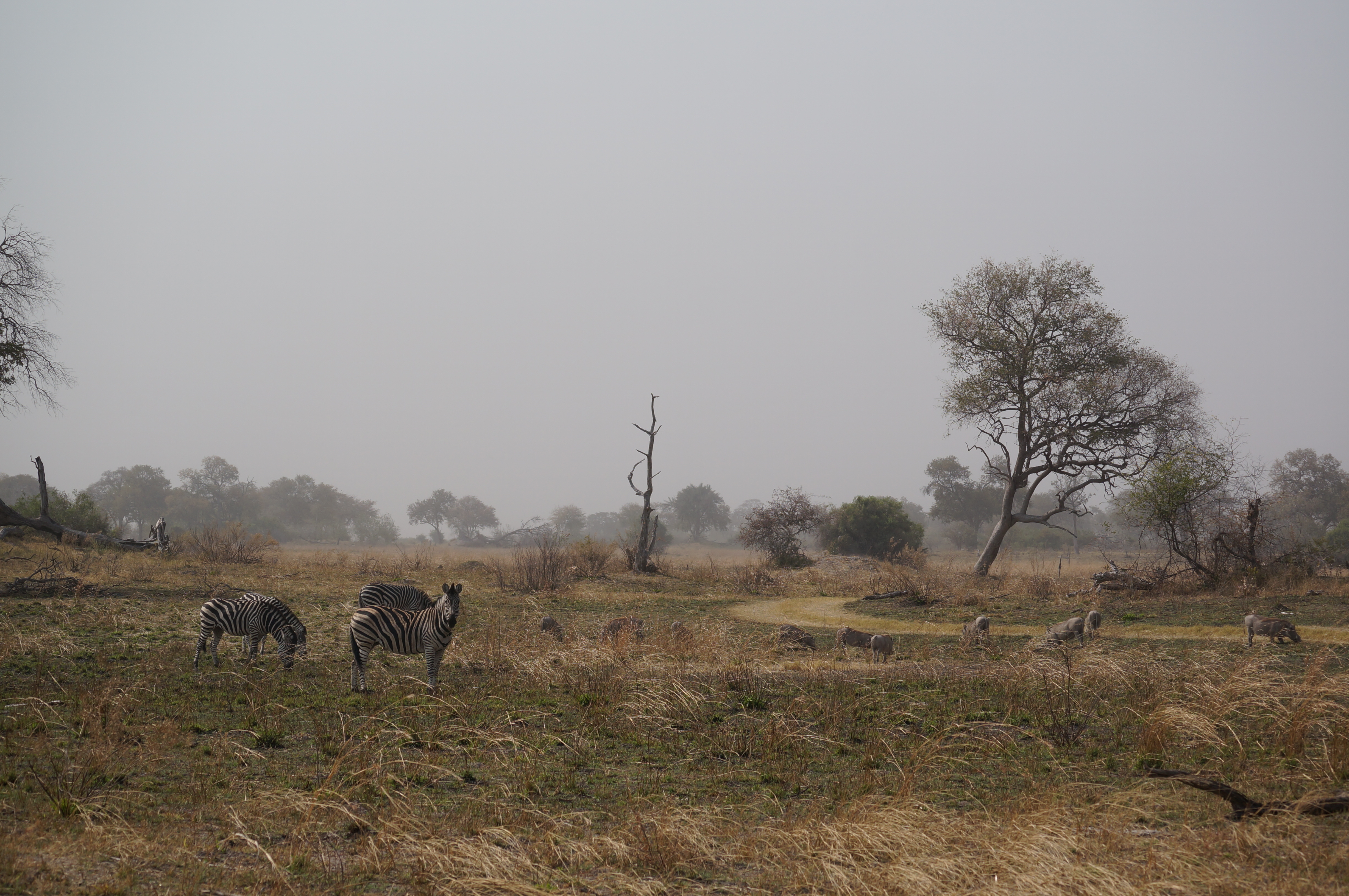 De volgende ochtend worden we weer gewekt door het gezellige geknor van nijlpaarden en rijden we verder in oostelijke richting. Dit deel van de Caprivi-strook ziet nauwelijks toeristen, behalve dan die over de hoofdweg voorbijrazen. We kamperen op een prachtige plek met uitzicht over de delta, waar wrattenzwijntjes in de modder staan te grazen. Het nationale park Nkasa Rupara wordt waarschijnlijk nóg minder bezocht, we komen de hele dag slechts een auto tegen. Ondanks de harde wind, waardoor het stof in de lucht hangt en veel dieren zich liever schuilhouden in de struiken, zien we grote groepen buffels, springbokken, giraffes, olifanten en zebra’s.