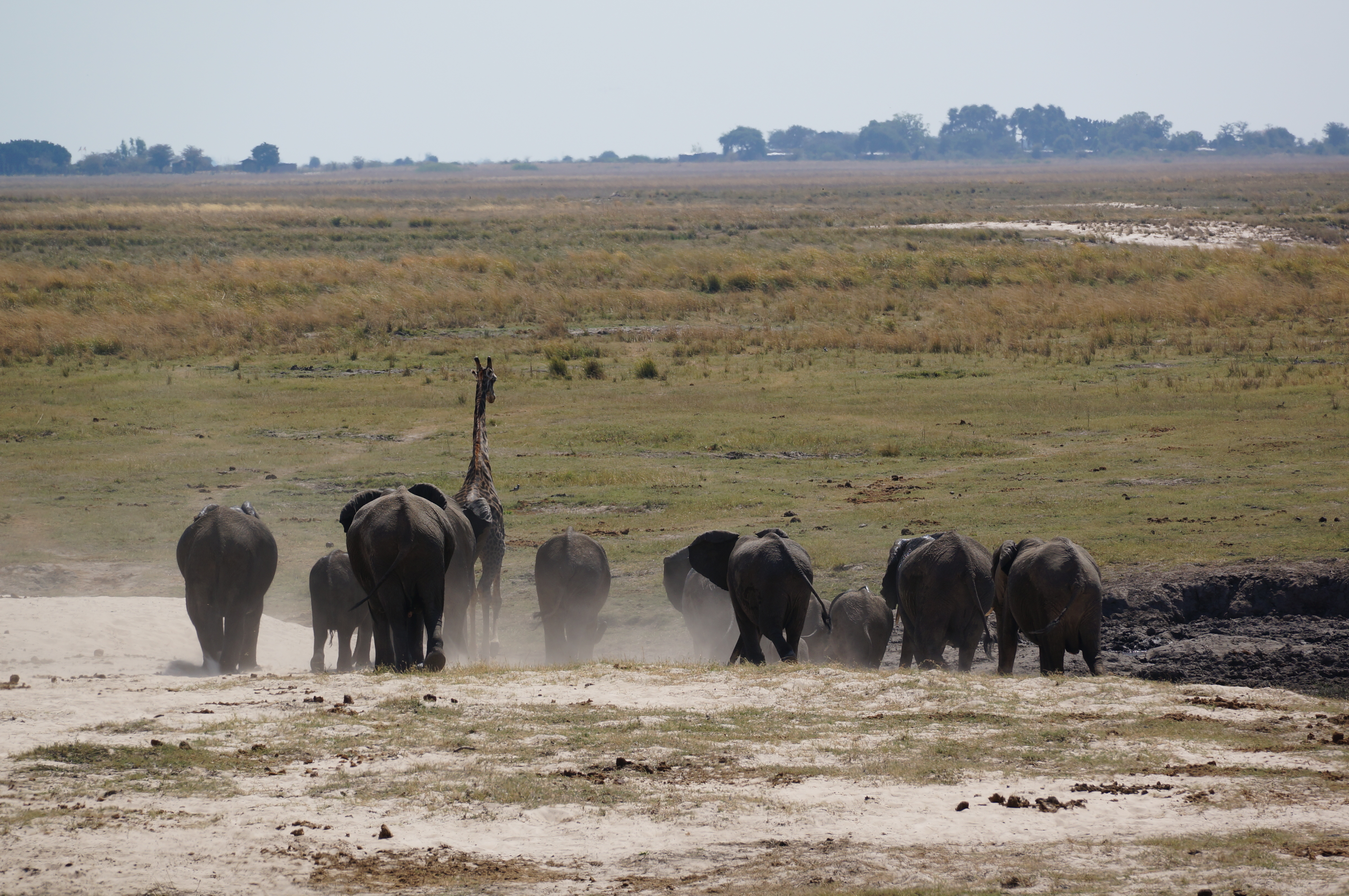 Het eerst dat opvalt in Botswana is dat er overal heerlijke muziek uit de speakers schalt. In de slijter, in de supermarkt, in de bar, op straat. Overal klinken afrobeats. Het is iets dat we in Namibië hebben gemist, net als de levendigheid in de straten van de stadjes. Maar landschappelijk gezien kan Botswana alleen maar nederig in de schaduw van zijn buurland staan. Qua olifantenpopulatie overigens niet, want Botswana = olifanten. Ze zijn werkelijk overal, tot op het punt dat we zelfs niet meer stoppen als we er eentje tegenkomen. In het nationale park Chobe Riverfront zien we er honderden op een ochtend. En toch, het blijven prachtige, indrukwekkende dieren. Het mooiste moment is als ze gaan badderen en de modder met een sierlijke boog de lucht in spuiten met hun slurf.