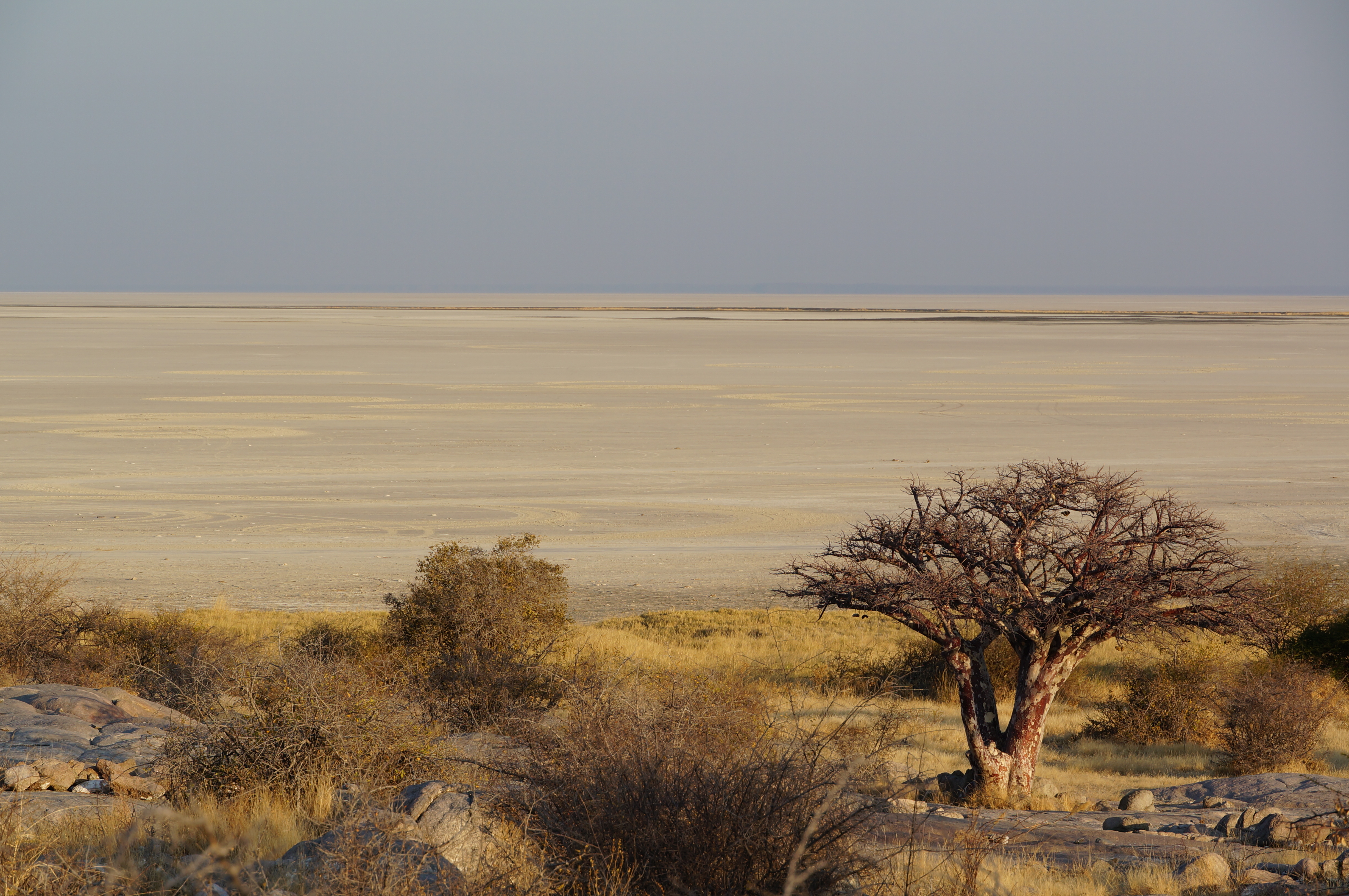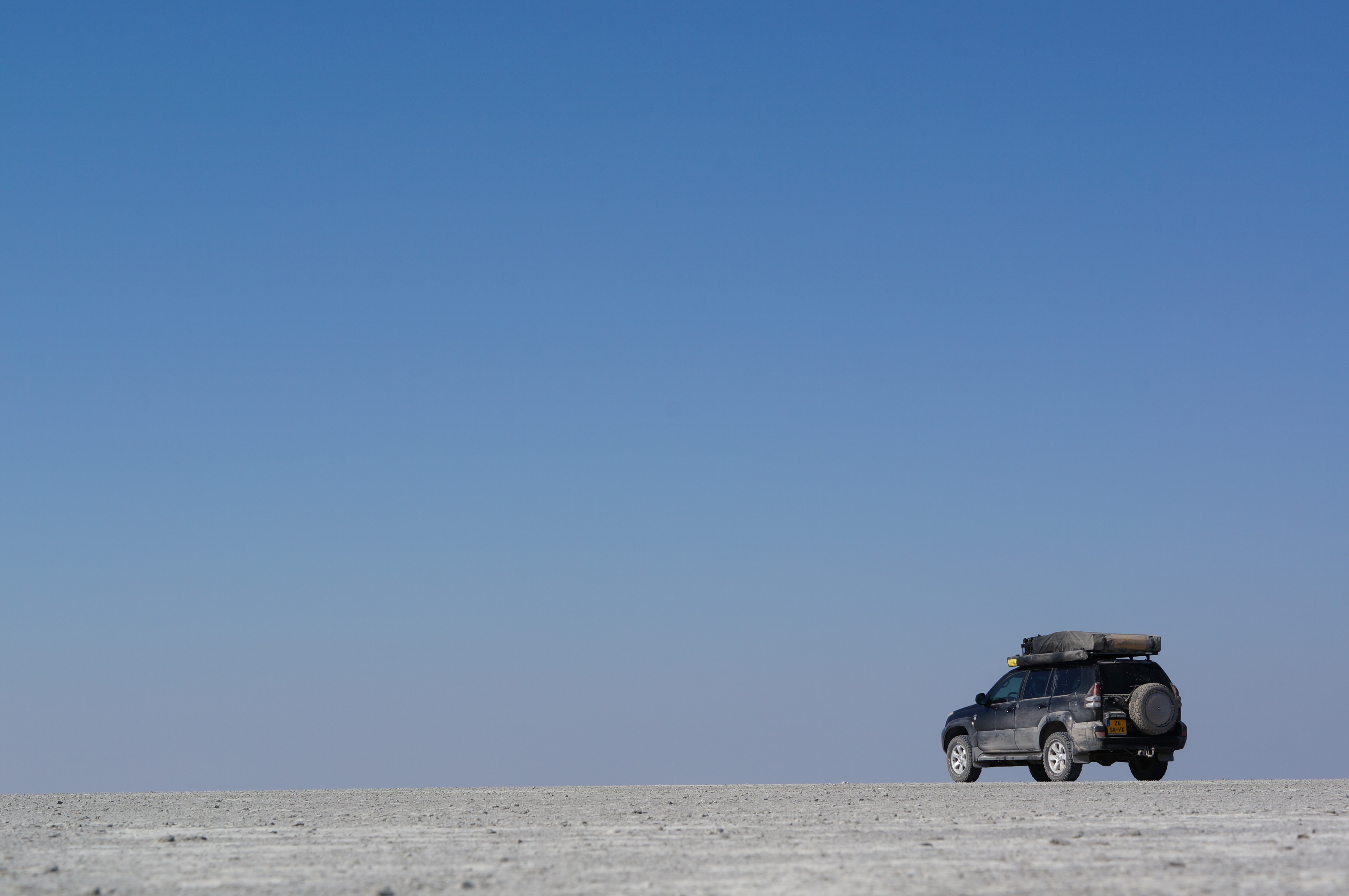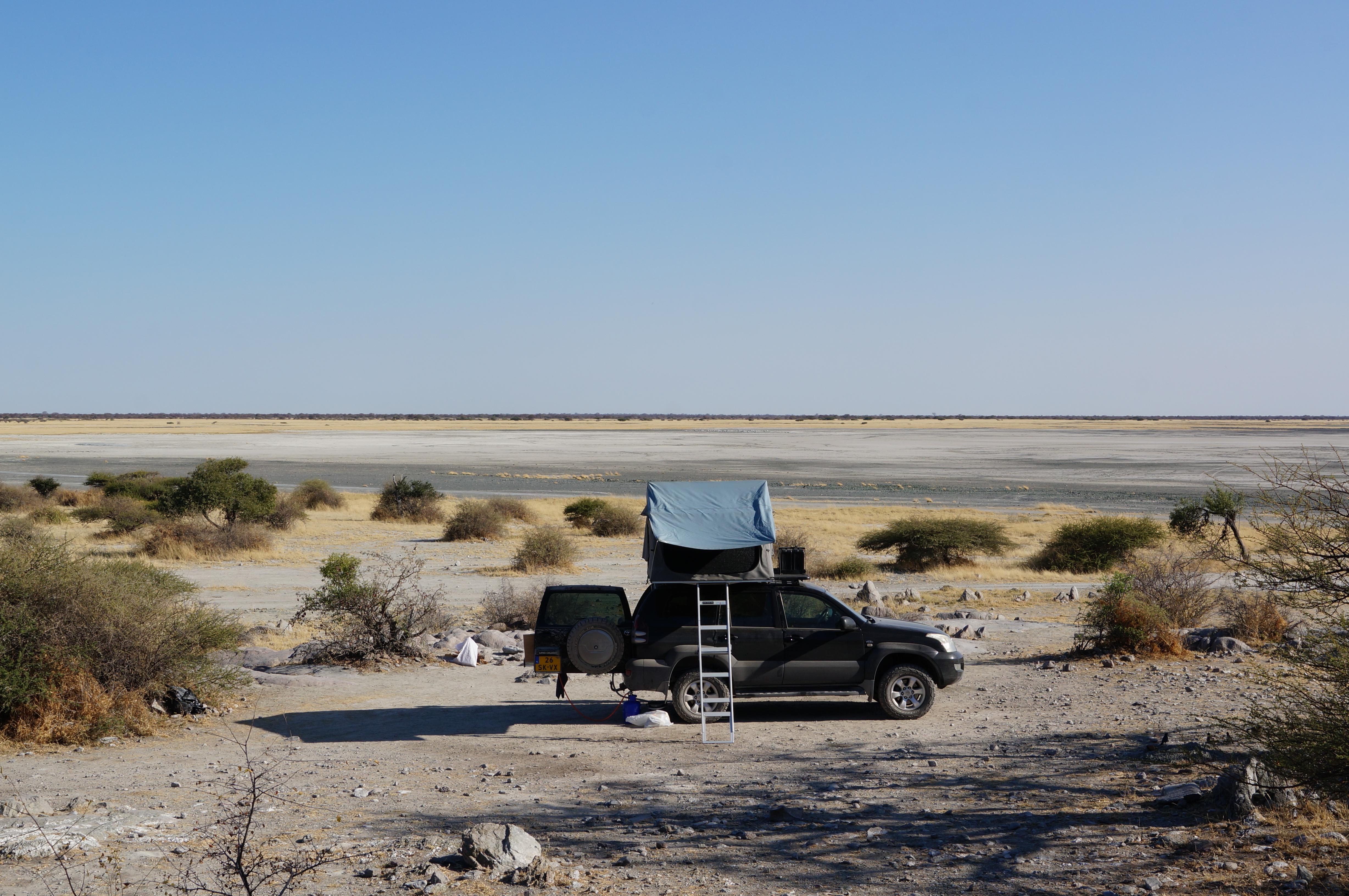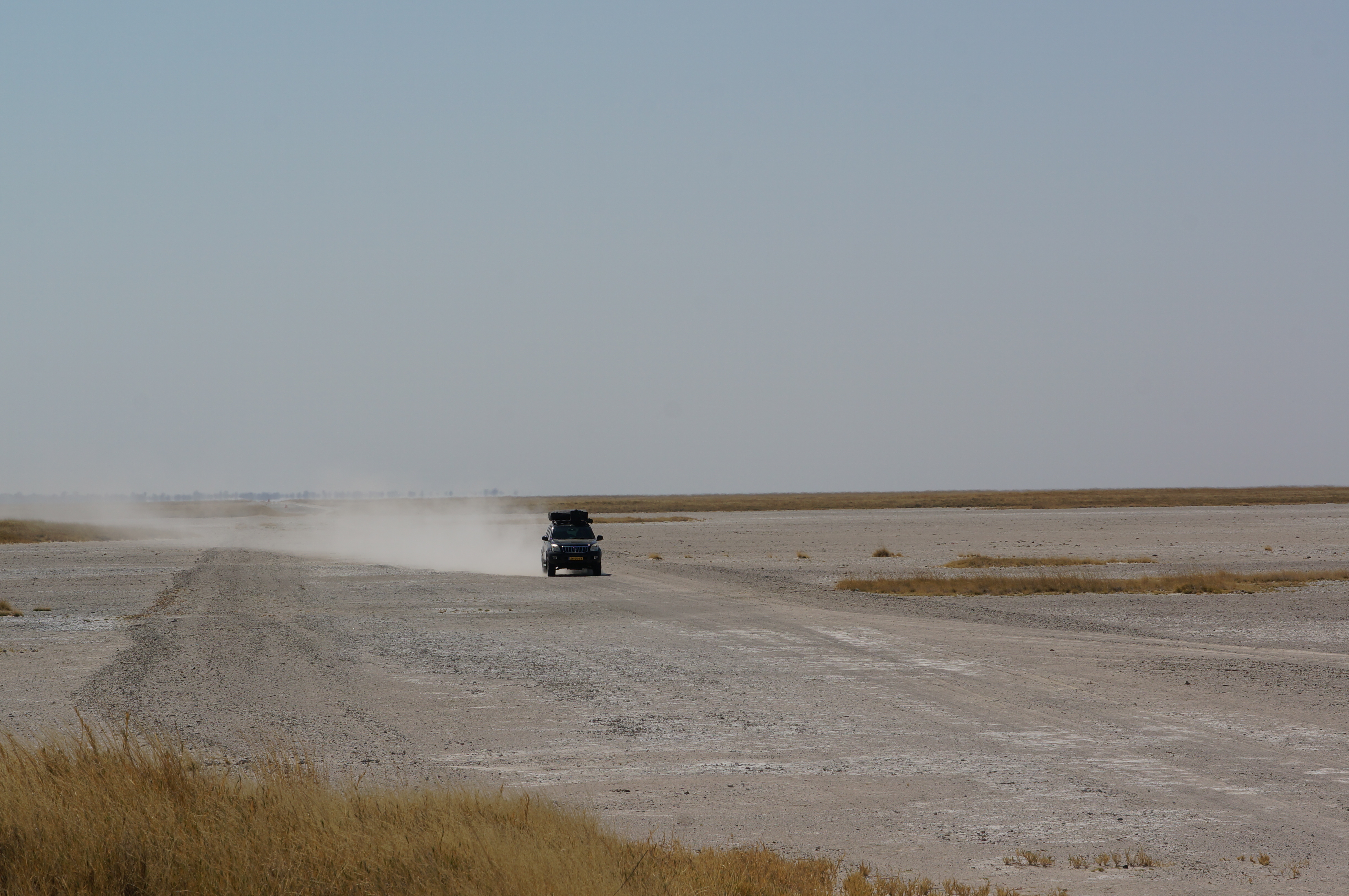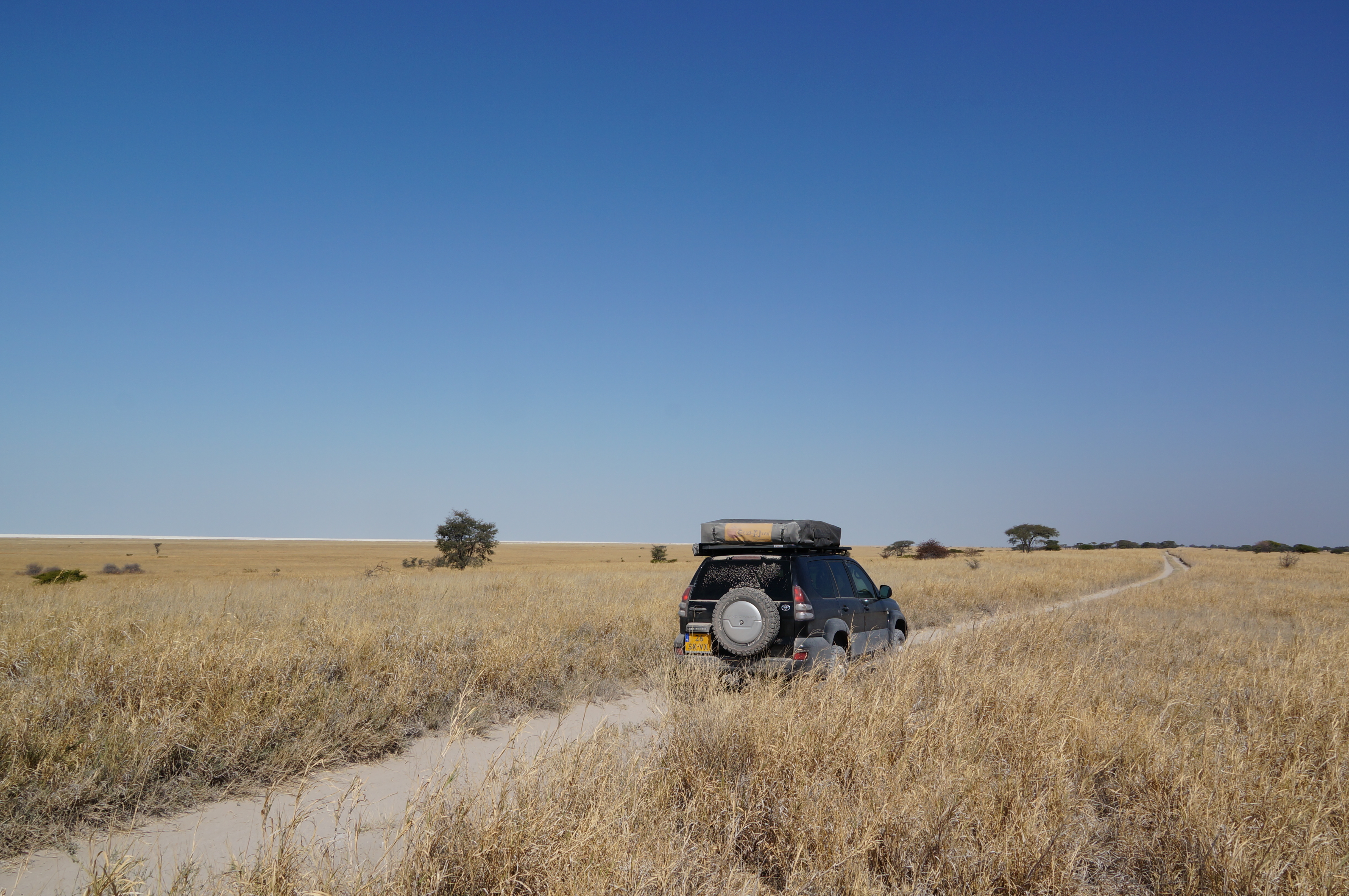 De volgende ochtend rijden we via een mooie 4×4-route terug naar de doorgaande weg. We scheuren over de zoutvlaktes, rijden door diep zand en slingeren tussen de doornstruiken door. Soms is het pad half overgroeid en horen we de takken over de lak van de auto schrapen. Alsof je met je nagels over een schoolbord gaat. Waarom groeien hier niet gewoon varens? Onze auto zit na ruim 2 maanden Afrika helemaal onder krassen. Het hoort erbij, maar toch doet het elke keer weer een beetje pijn als we ‘sqieieiezzz’ horen.