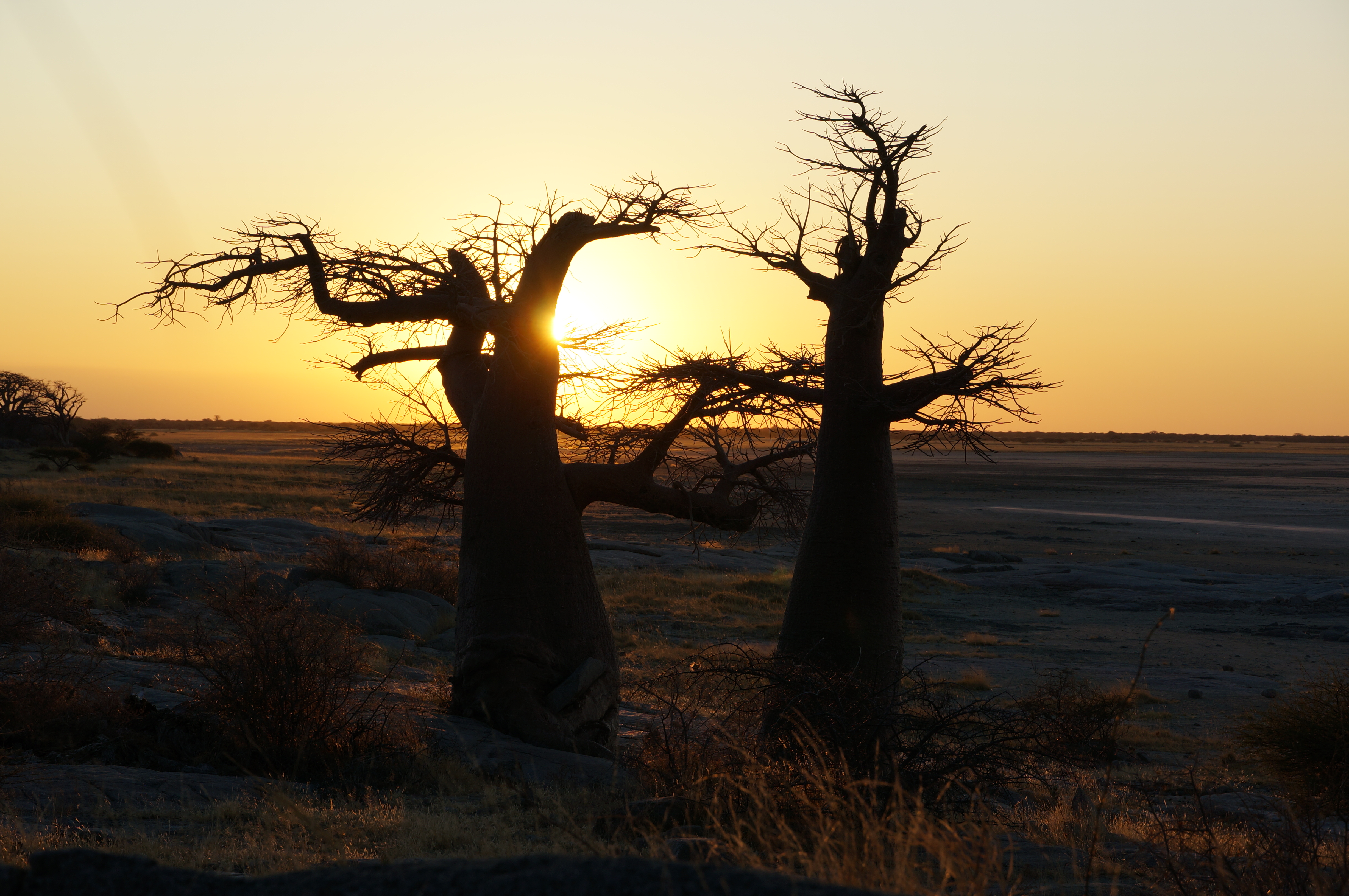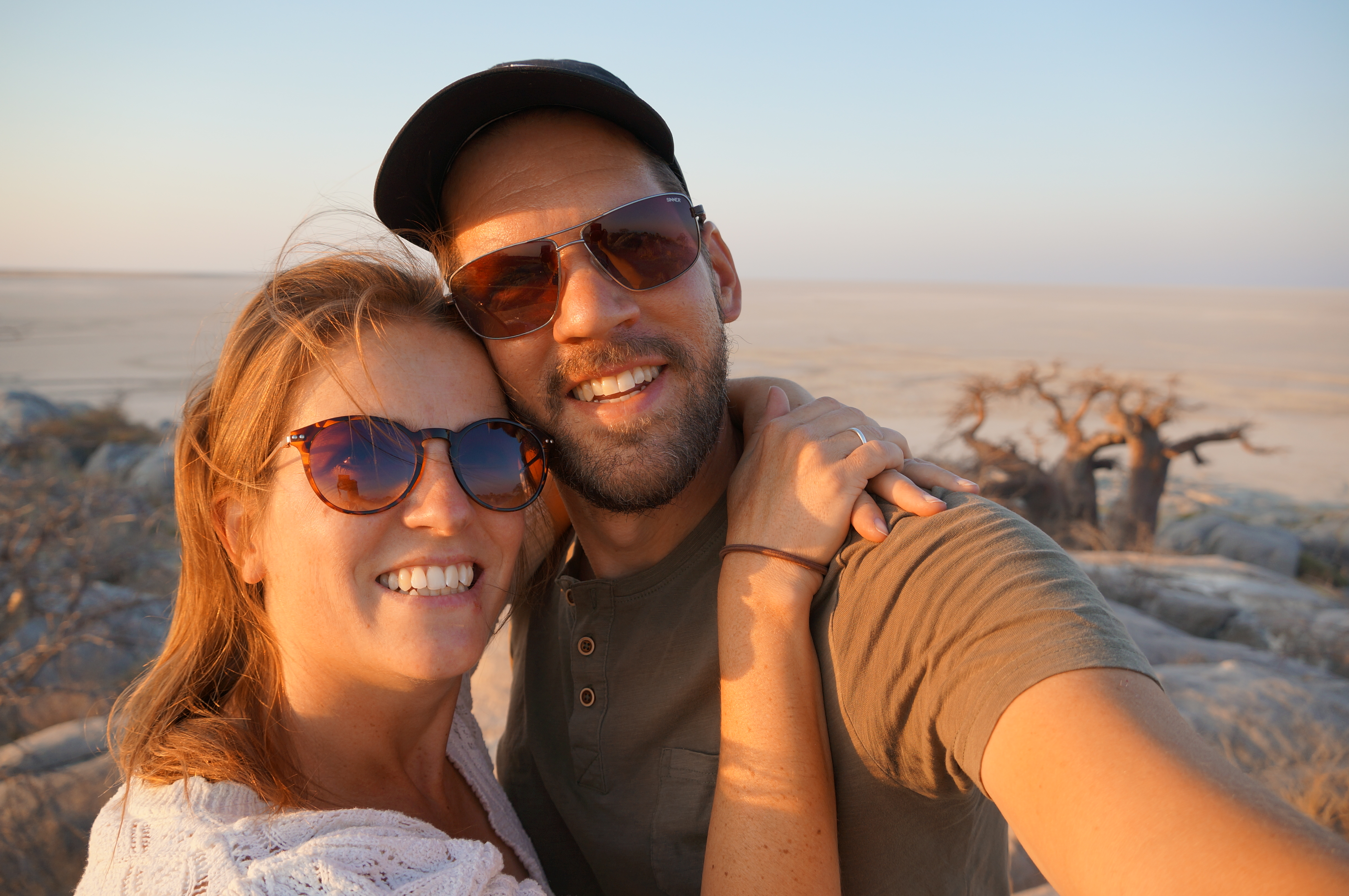 De volgende dag rijden we naar het grootste netwerk van zoutpannen ter wereld. Een karrespoor door het diepe gras en dwars over de zoutpannen leidt naar Kubu Island, dat middenin een van de zoutpannen ligt. Een magische plek, een van de mooiste kampeerplekjes tot nu toe. Het decor: een glinsterende zoutpan, enorme boababs en granieten rotsen. Doe daar een ondergaande zon bij en het kippenvelmomentje is compleet.