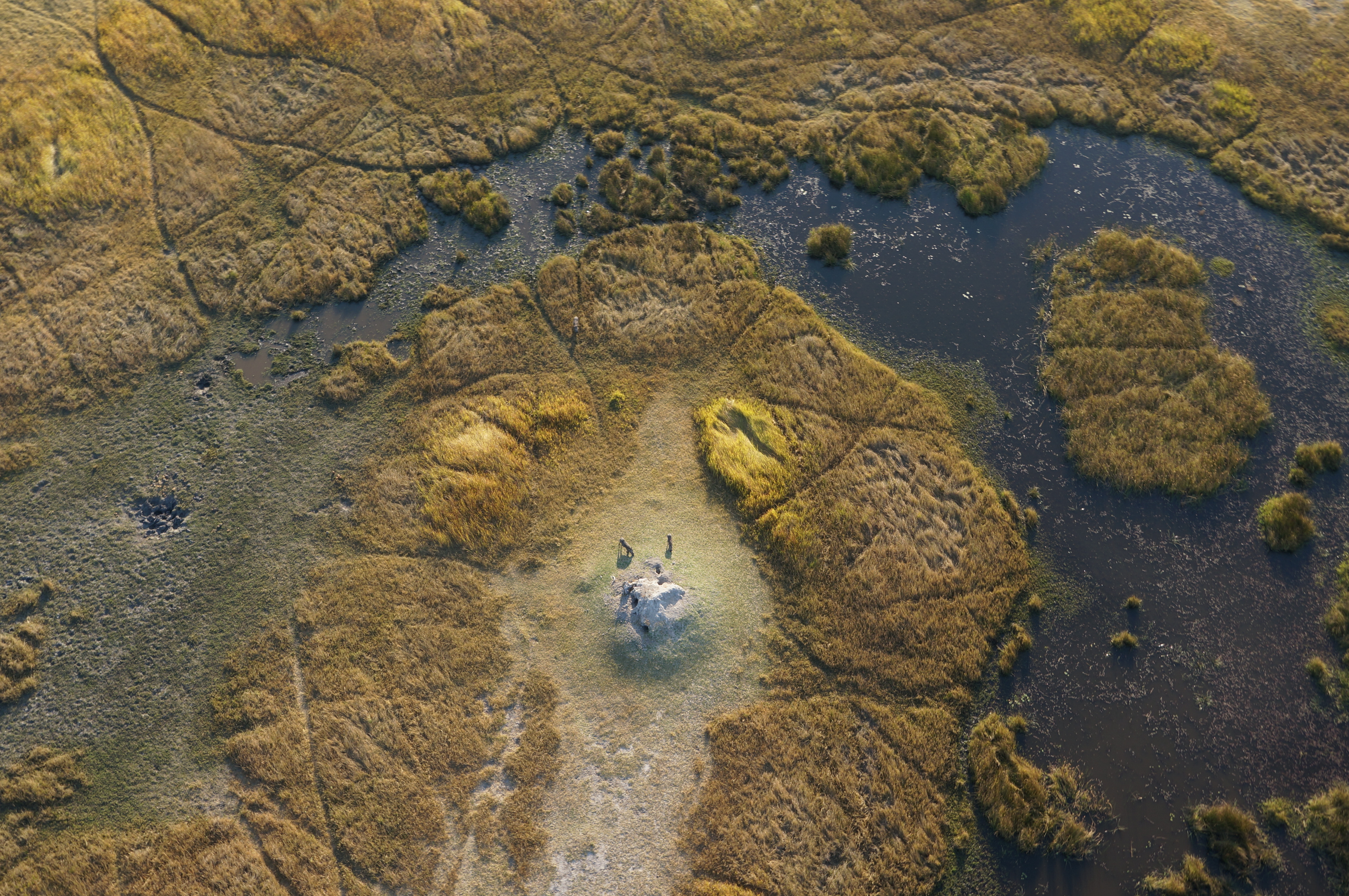 Het helikoptertje is meer een uit de hand gelopen drone met stoelen dan een echte helikopter. De zijkanten zijn open, er zijn vier kuipjes met een autogordel, een stuurknuppeltje en wat metertjes, that’s it. Ellemieke heeft een beetje vliegangst, dus dat het ding na de eerste poging niet meteen start en daarna pruttelend en schuddend tot leven komt helpt niet. Maar dat is daarna allemaal snel vergeten, want als we eenmaal boven de delta hangen is het uitzicht magisch. Rivierstroompjes lopen als aderen door het landschap. Spetterend groen en geel worden gemarkeerd door zwartblauw water. Er zijn zoveel prachtige vormen die je vanaf de grond niet ziet. En natuurlijk dieren, die in de waterrijke delta hun dorst komen lessen. Olifanten die in de late middagzon lange schaduwen over het land werpen. Andere kuddes die waden tussen de waterplanten. Van bovenaf lijken het net Playmobil-diertjes. Zo hadden we olifanten, nijpaarden, zebra’s, giraffes, buffels en gnoes nog niet eerder gezien. Wauw, wauw, wauw! Echt. Heel. Indrukwekkend.