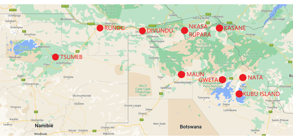 Route in chronologische volgorde: Tsumeb – Rundu – Divundu – Nkasa Rupara – Kasane – Nata – Kubu Island – Gweta – Maun