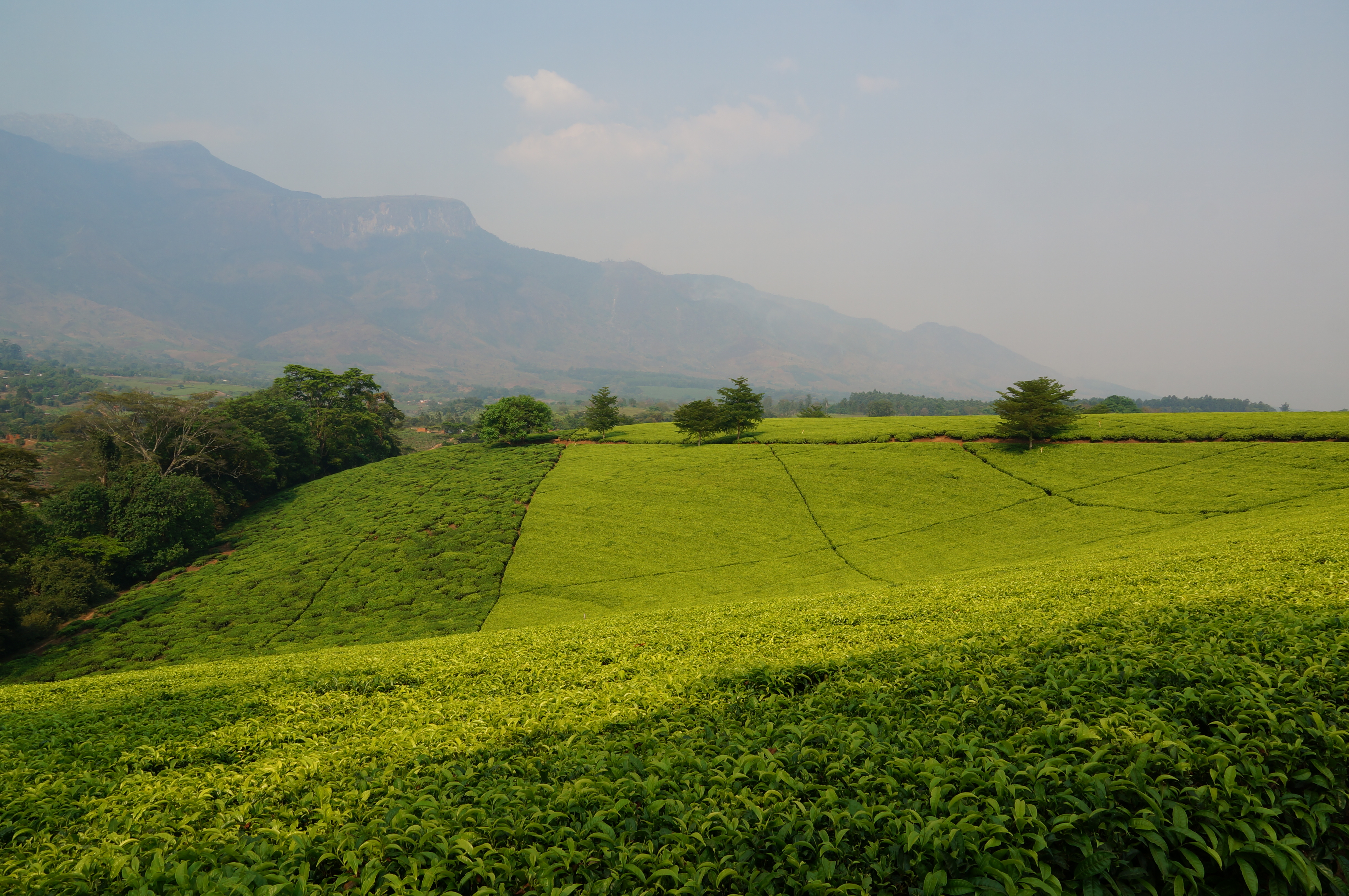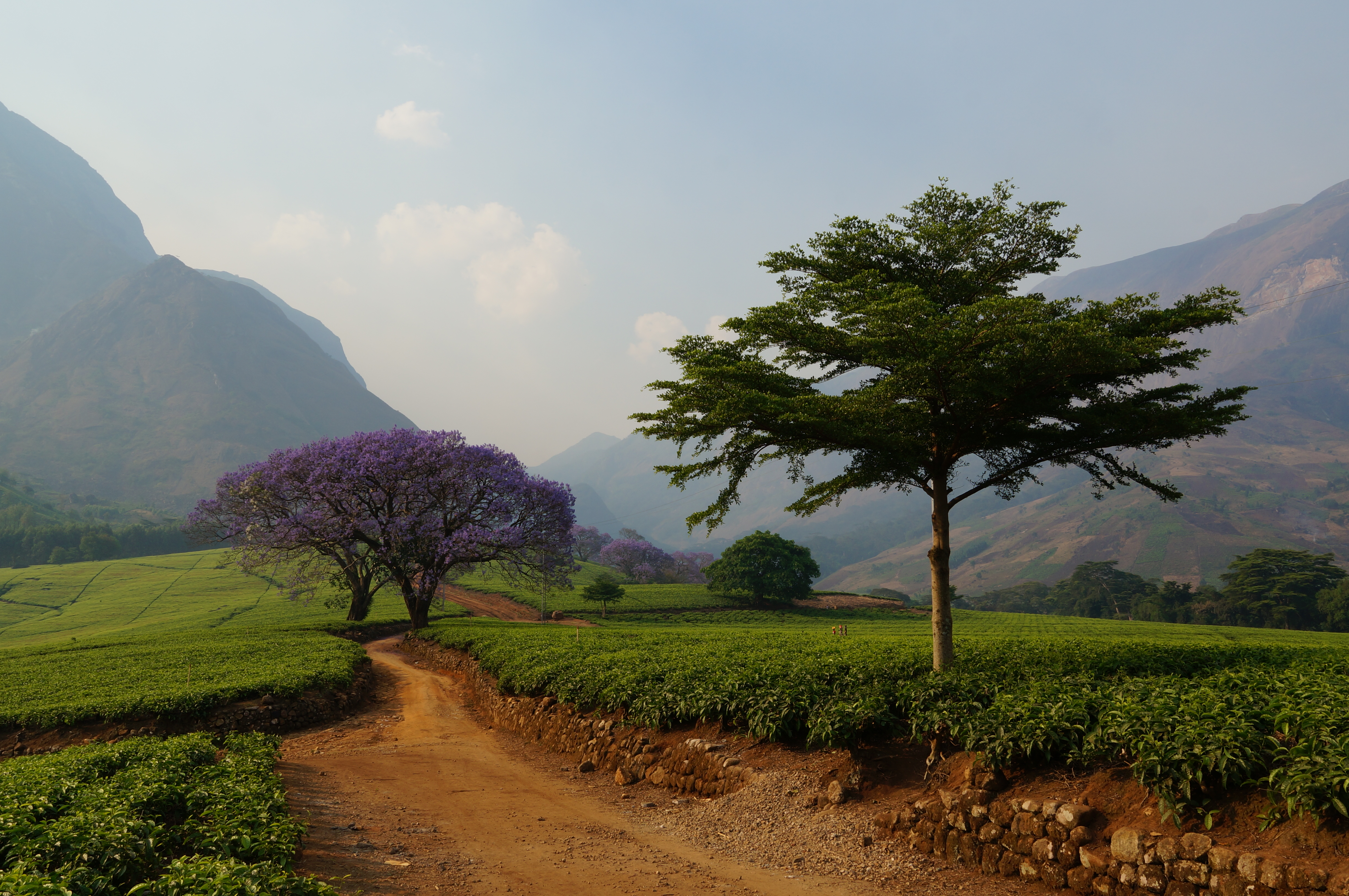De volgende middag rijden we nog wat verder de theevelden in, want tsjonge wat ís het hier mooi. Via de rode zandweggetjes, die als een spinnenweb door de plantages lopen, rijden en wandelen we door de oneindig golvende, groene zee van thee. Paarse jacaranda-bomen tornen als kunstwerken boven de theeplanten uit, met op de achtergrond het indrukwekkende Mulanje-massief dat als een beschermheer over de theevelden waakt.