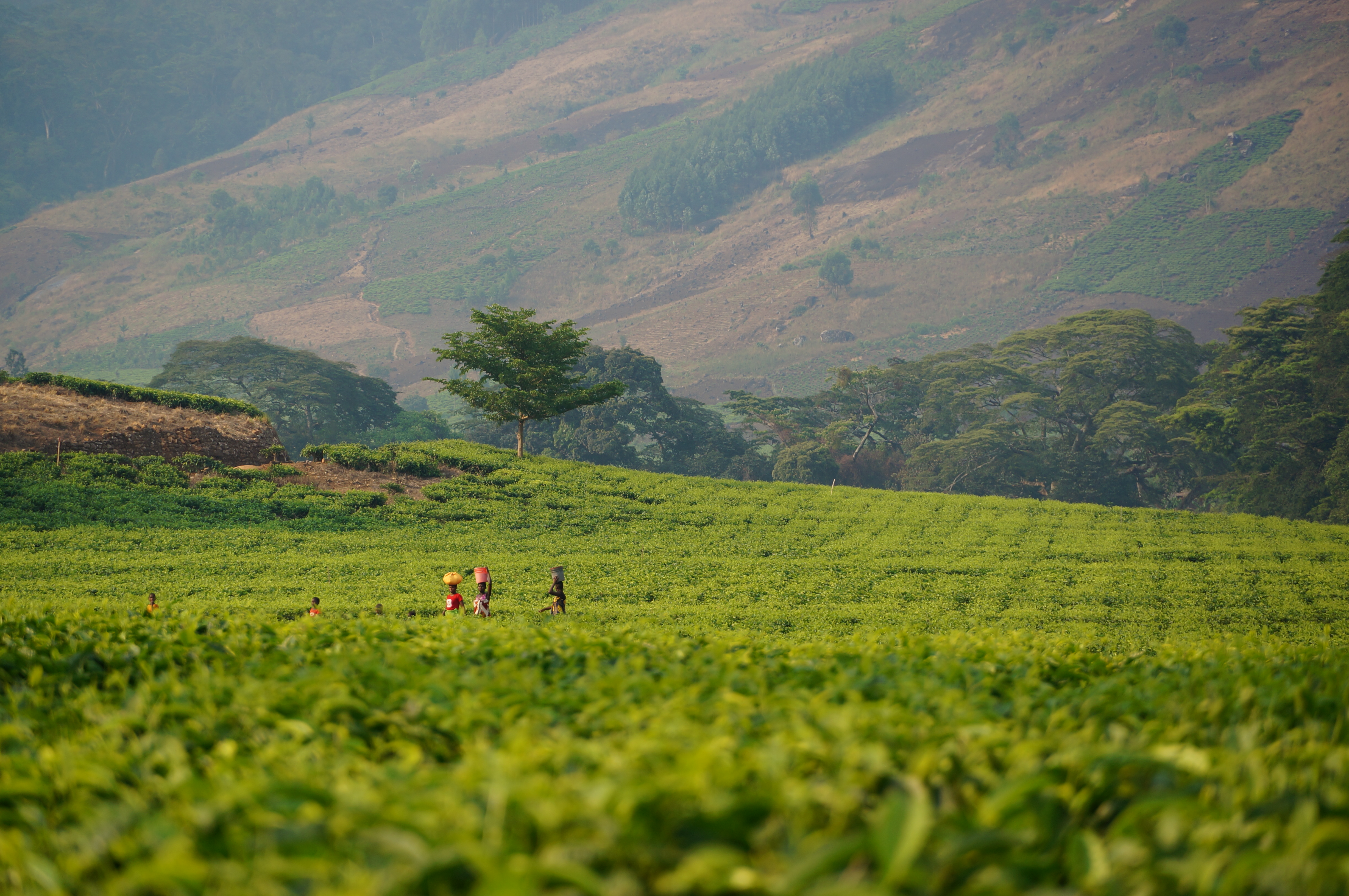 Theevelden met op de achtergrond het Mulanje-massief | Nieuwsgierige kinderen | Oogsten van de thee
