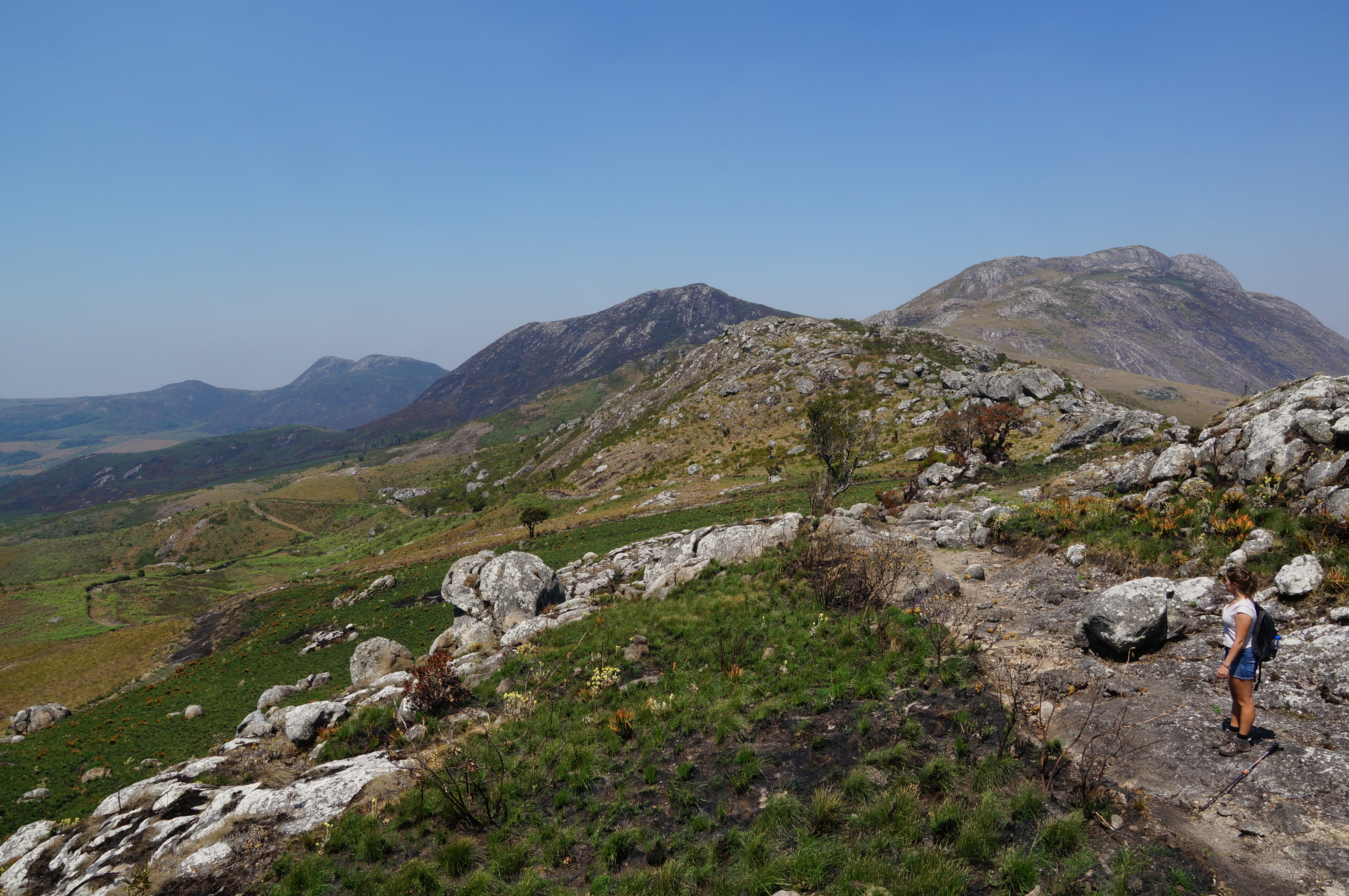 Op dag twee hoeven we gelukkig een stuk minder hoogtemeters te maken. Als we klaar zijn om te vertrekken om half negen, staat Tadziwa al een uur te wachten op ons. De vorige avond hebben we afgesproken om ‘half past 8’ te vertrekken, maar Engels blijft lastig… De route over bergkammen en hoogvlaktes is in ieder geval prachtig, honderden tinten groen en bruin worden afgewisseld met (ook hier) zwartgeblakerde vlaktes. De zoete geur van verbrand cederhout hangt tussen de bergen.