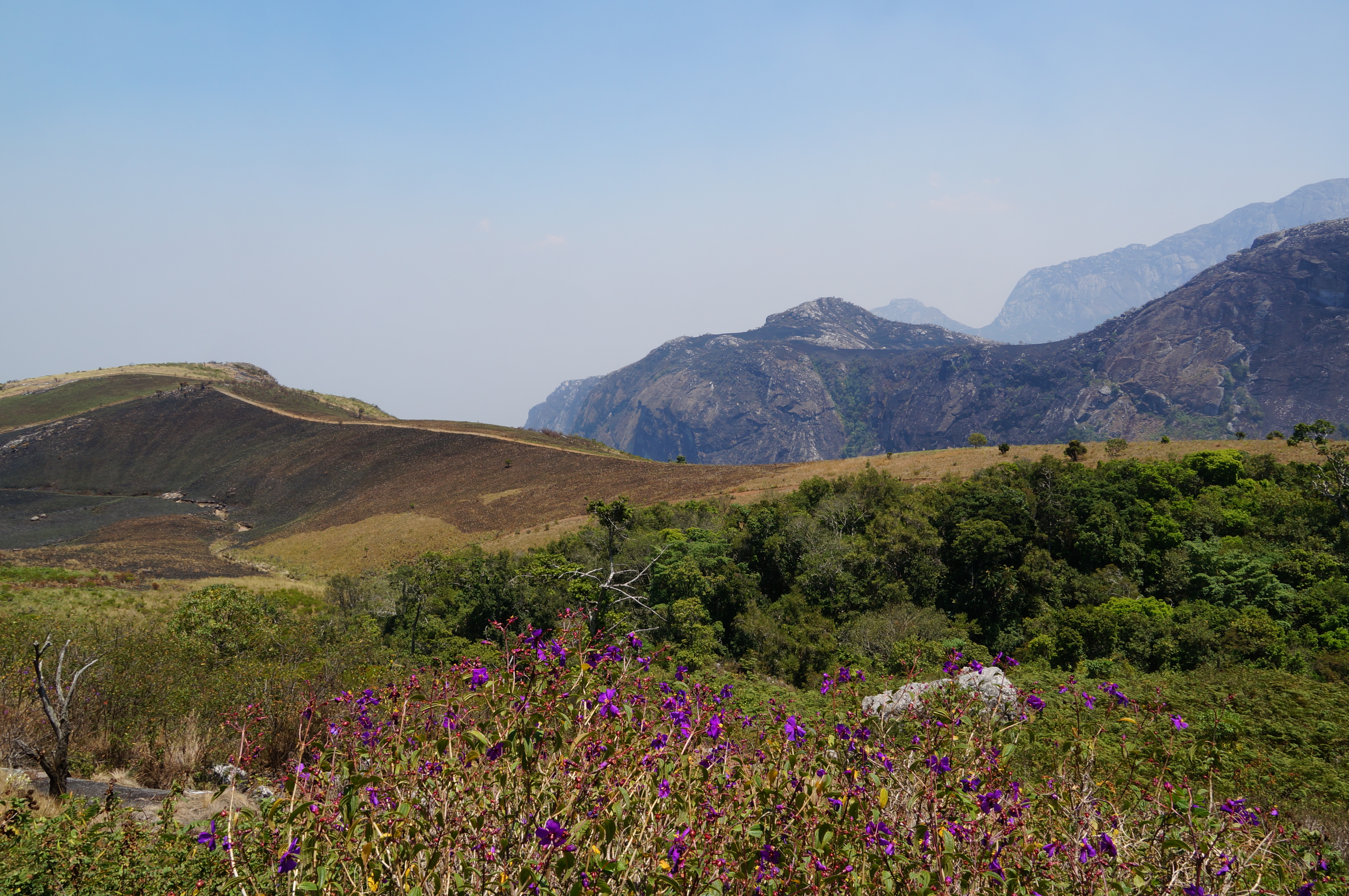 Het Zomba-plateau steekt zo’n 1.300 meter boven het landschap uit en heeft twee gezichten: hoe het had kunnen zijn en hoe het is. Veel van de oorspronkelijke bossen zijn gekapt en platgebrand, waardoor de hellingen er zwartgeblakerd bijliggen. Overal op en rondom het plateau zijn branden, waardoor de lucht zwaar is en het uitzicht wordt belemmerd. We zagen het eerder al in Zambia en Zimbabwe, maar deze stille natuurramp speelt zich in alle landen in de regio af. Iedereen kent de beelden van het brandende regenwoud in Brazilië, maar dat half Afrika in de fik staat daar hoor je nooit iemand over. In dit tempo staat er over 15 jaar geen boom meer overeind. Er zijn veel oorzaken voor de bosbranden, maar ze ontstaan bijna nooit vanzelf. Branden worden aangestoken om muizen te vangen (die ze langs de weg, op een stokje gespiesd, verkopen), om houtskool te maken, om de grond vruchtbaar te maken voor landbouw, om dieren makkelijker te kunnen afschieten en zo zijn er nog wel wat redenen. Iedereen die je ernaar vraagt vertelt wat anders. Grote bedrijven kappen de bomen op het Zomba-plateau, maar planten niks terug. En dan is er nog het probleem dat bijna iedereen op hout kookt. Daar is niet zomaar een oplossing voor, want gas is onbetaalbaar voor de meeste mensen. Maar het betekent wel dat er overal bomen worden gekapt. Mensen komen met stapels hout achterop de fiets of op hun hoofd de berg af. Wat overblijft zijn uitgedunde bossen en kale vlaktes.