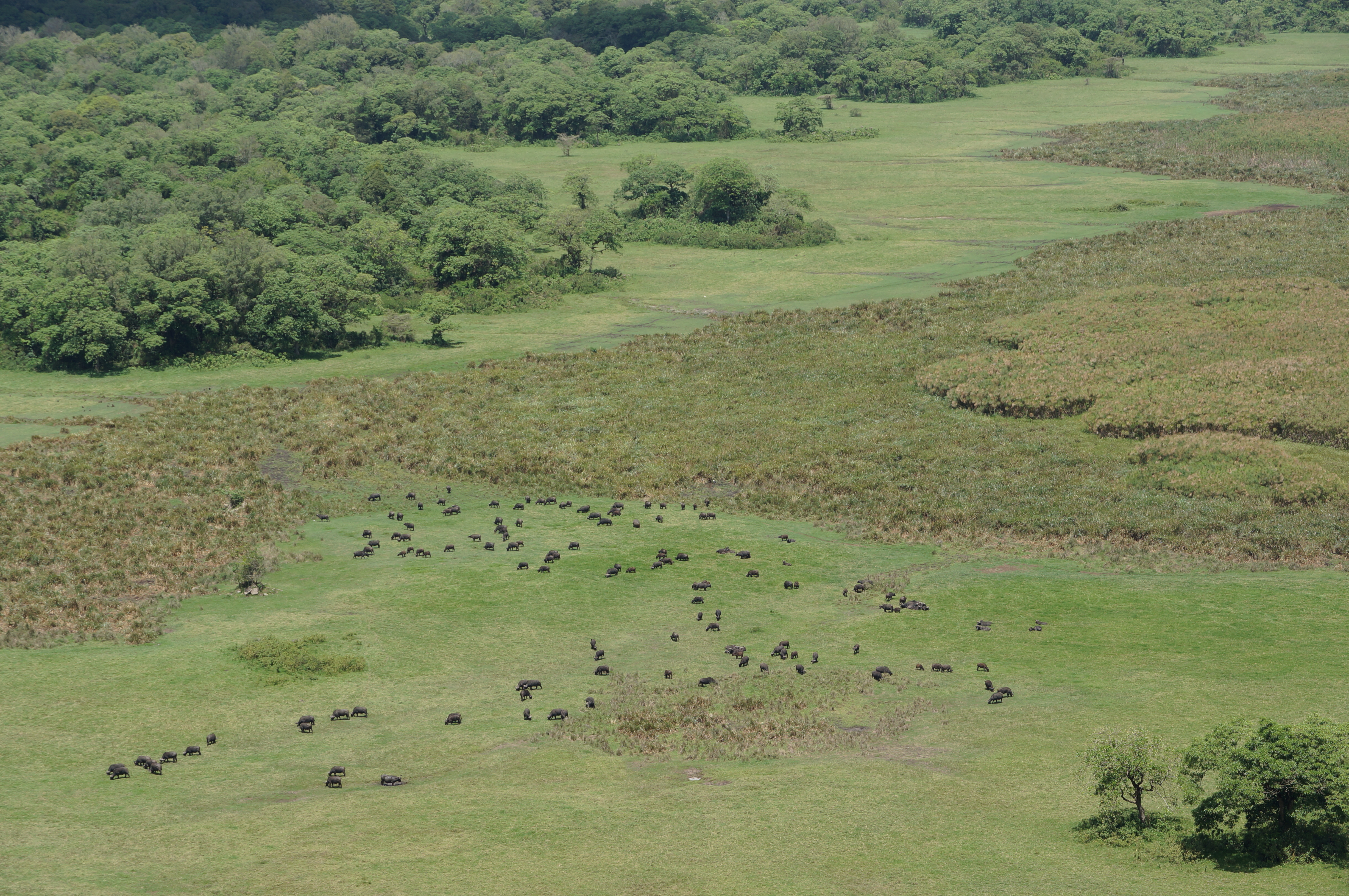De dag erna bezoeken we het Arusha National Park. Voor dit park moeten we 170 euro toegang betalen. Ja, nationale parken zijn duur in Tanzania en denk maar niet dat je daarvoor iets van service krijgt. Om de een of andere niet-bestaande reden duurt het maar liefst drie kwartier om onze auto te registreren. Het is het allemaal waard, want het park is prachtig. Eerst rijden we de helling van de Ngurdoto-krater op, over een steil pad dat op sommige punten half overgroeid is. Bovenaan hebben we een indrukwekkend uitzicht op de kraterbodem, waar een grote kudde buffels het verse gras staat op te peuzelen. De stilte, het uitzicht. Dit soort momenten laten je voelen dat je reist. Dat je op een unieke plek in de wereld bent.