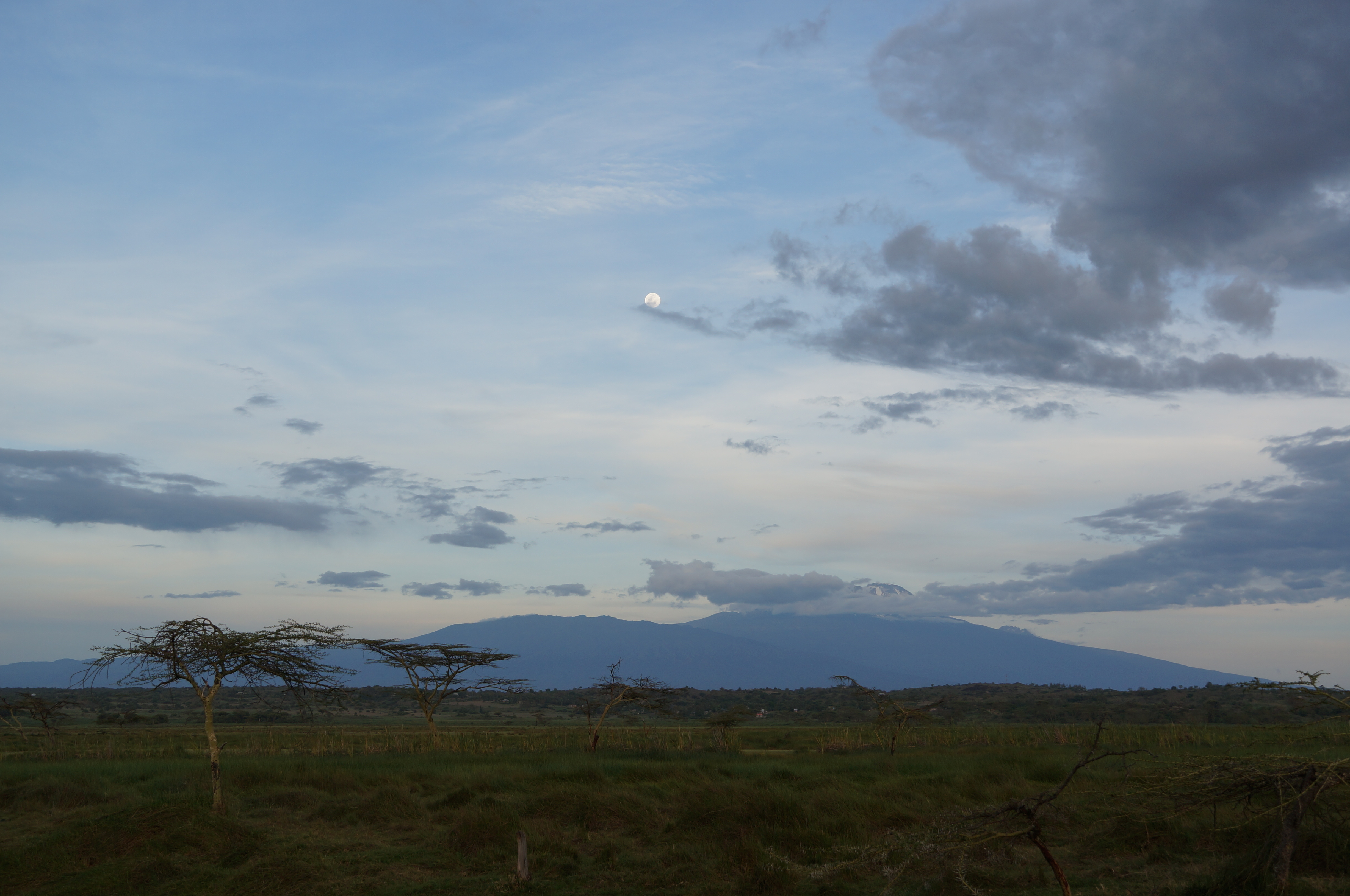 De laatste dagen in Tanzania verblijven we op een afgelegen camping, met aan de ene kant de Kilimanjaro en aan de andere kant Mount Meru. We worden wakker met uitzicht op die laatste en dineren met uitzicht op zijn grote broer. Die is meestal verstopt in de wolken, maar op precies het goede moment, als de volle maan al hoog aan de schemerige hemel staat, steekt het topje verlegen zijn besneeuwde snuit boven de wolken uit. Heel bijzonder. Het is zo’n moment waarop we beseffen wat voor een geweldig avontuur we meemaken.
