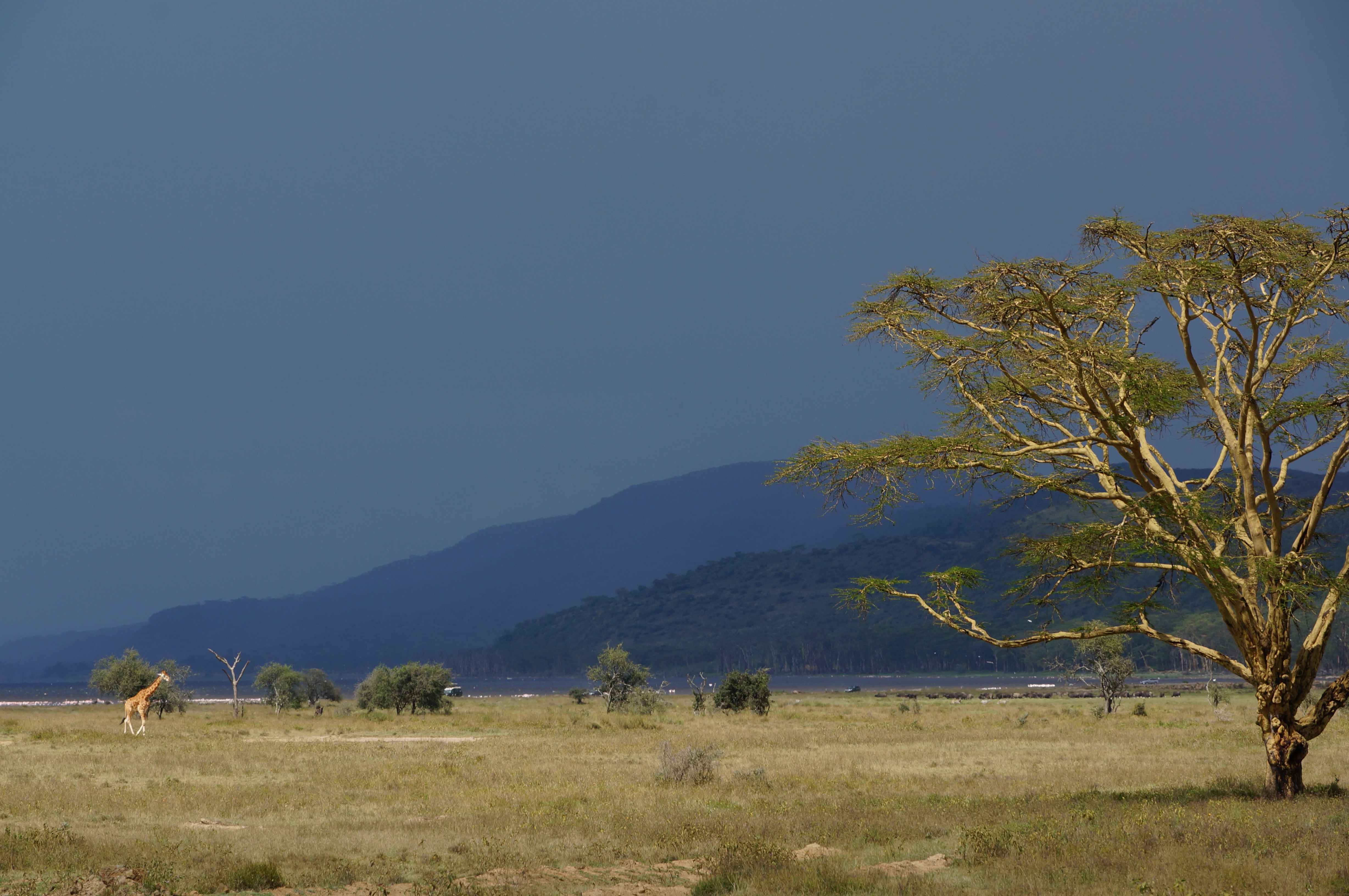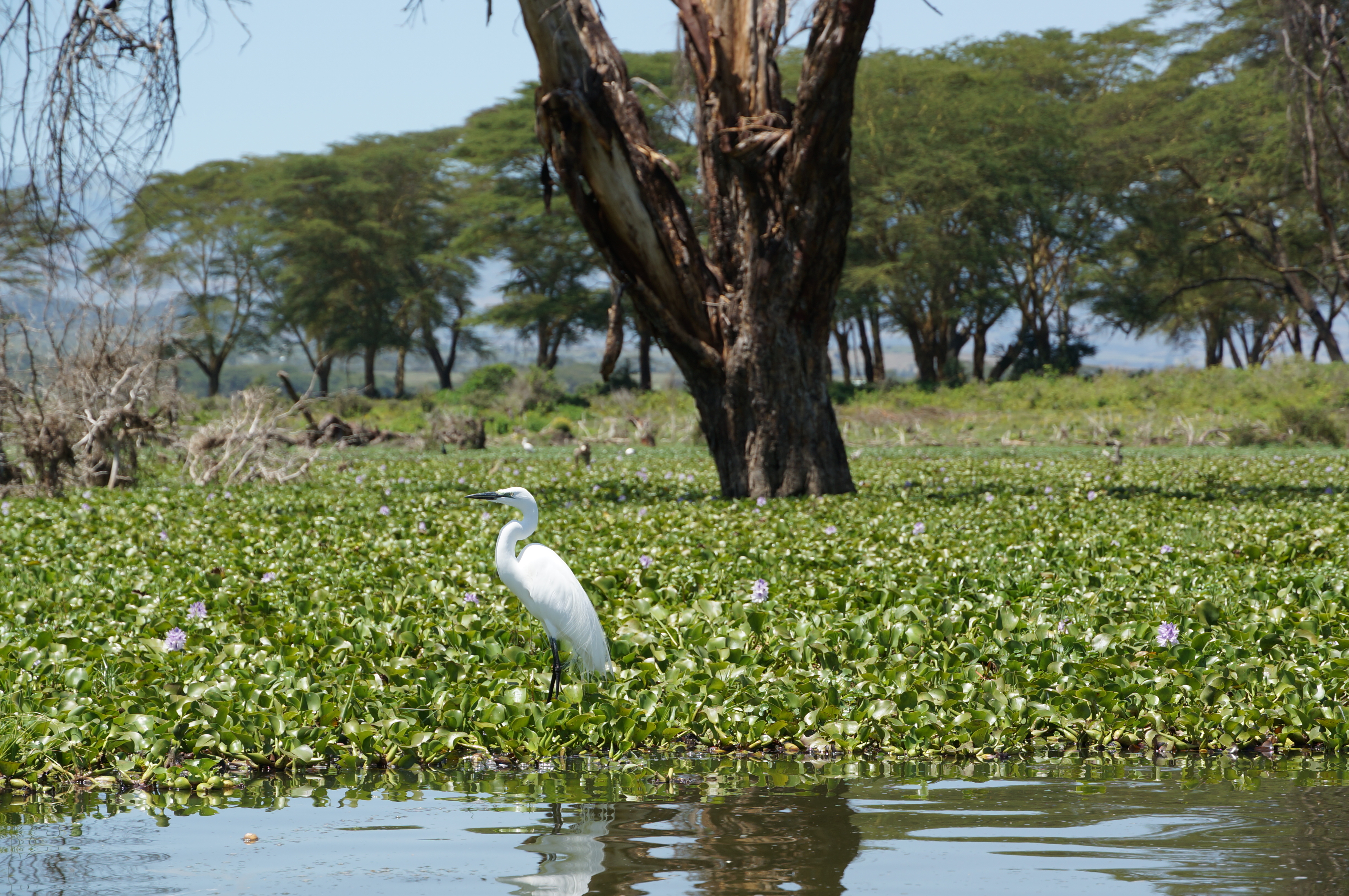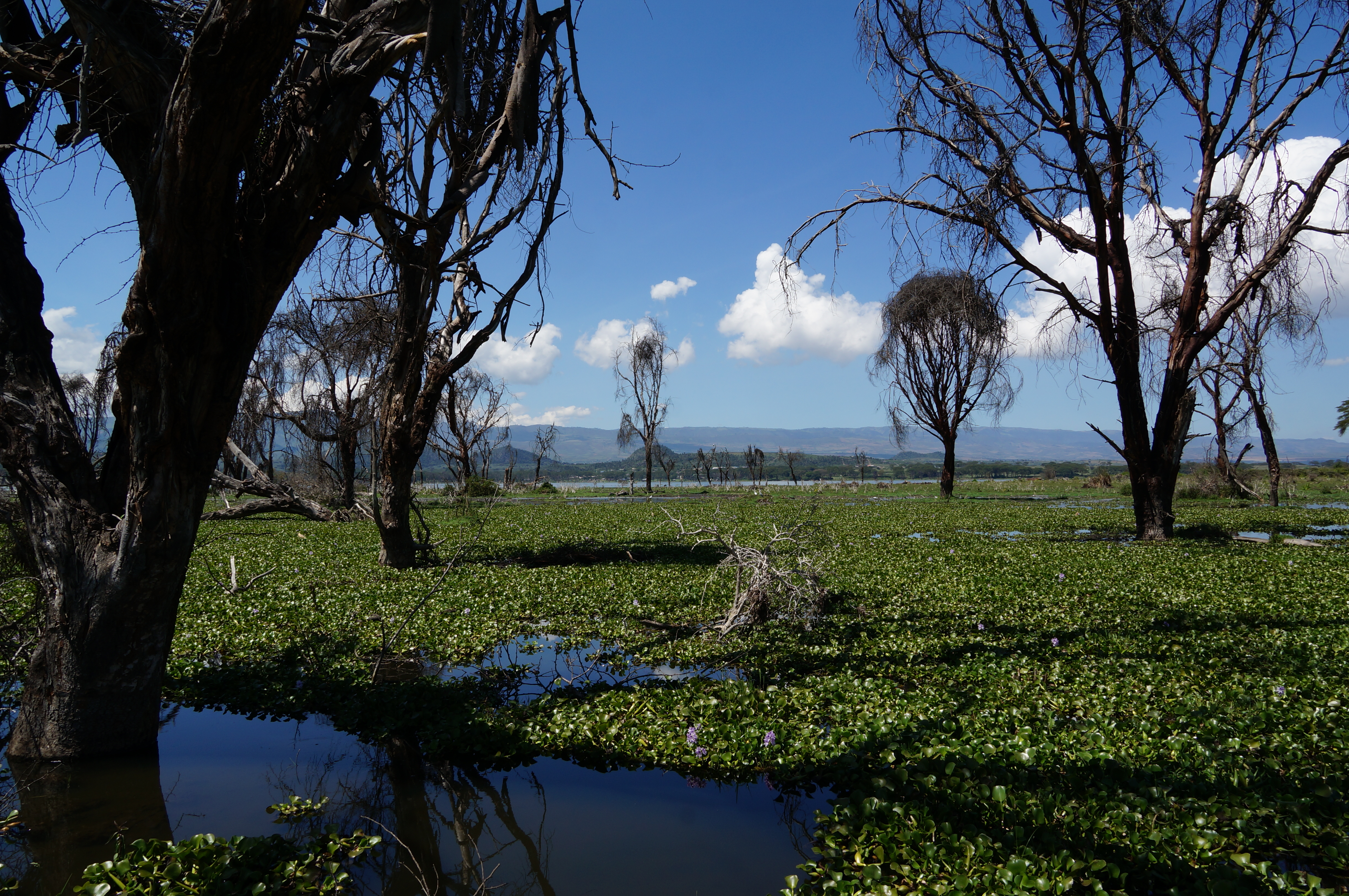 Boven het meer hangen donkere onweerswolken, die prachtig contrasteren met de roze flamingo’s die in het donkere water staan. Gelukkig blijft de regenbui ons bespaard en kunnen we droog op pad naar het volgende meer, Lake Naivasha. Daar verblijven we een paar dagen op een prachtig plekje met uitzicht over het water. We maken een boottocht tussen de half ondergelopen bomen en de kilometerslange slierten van waterhyacinten, die als een groene deken over het meer liggen.