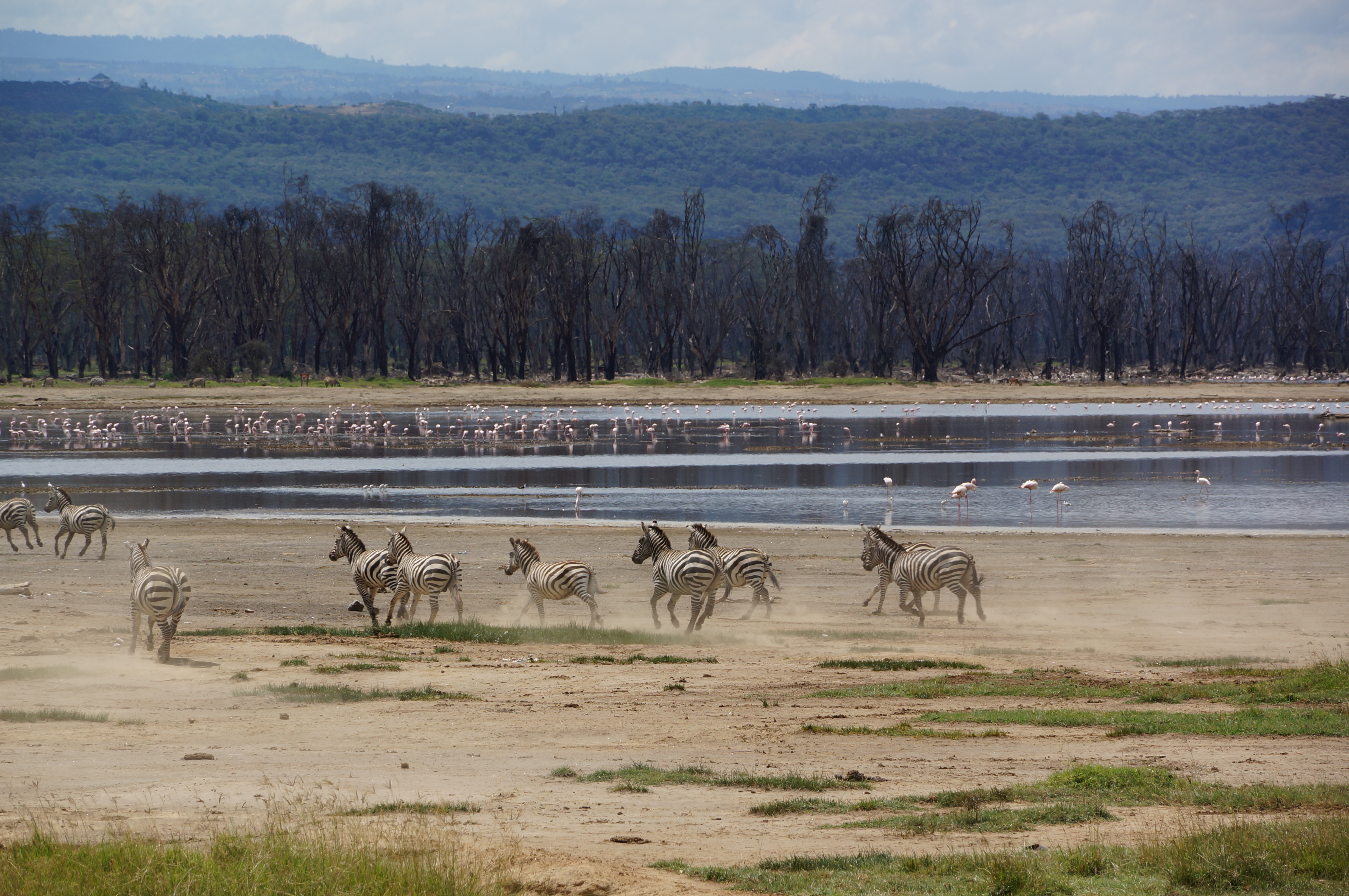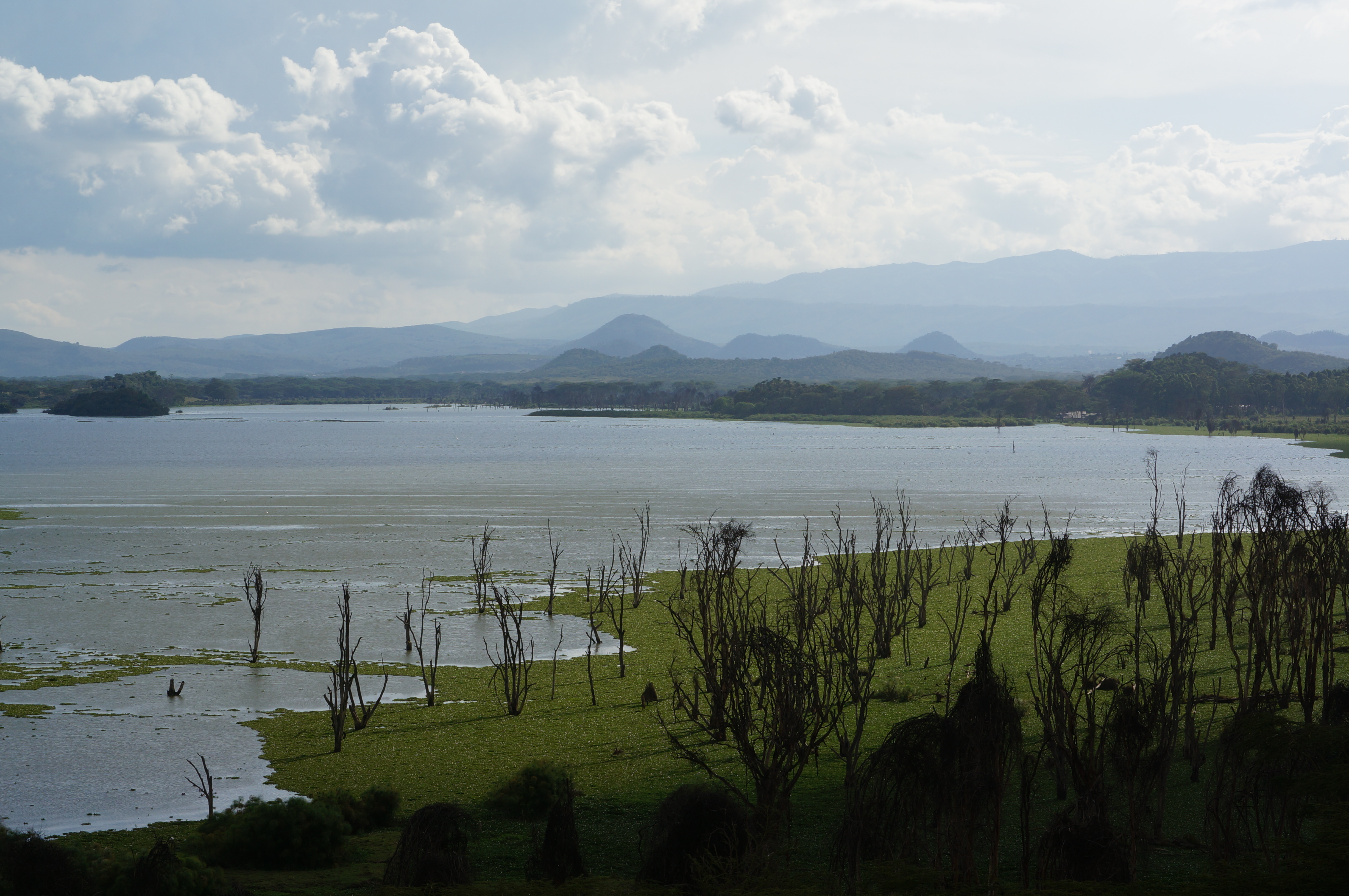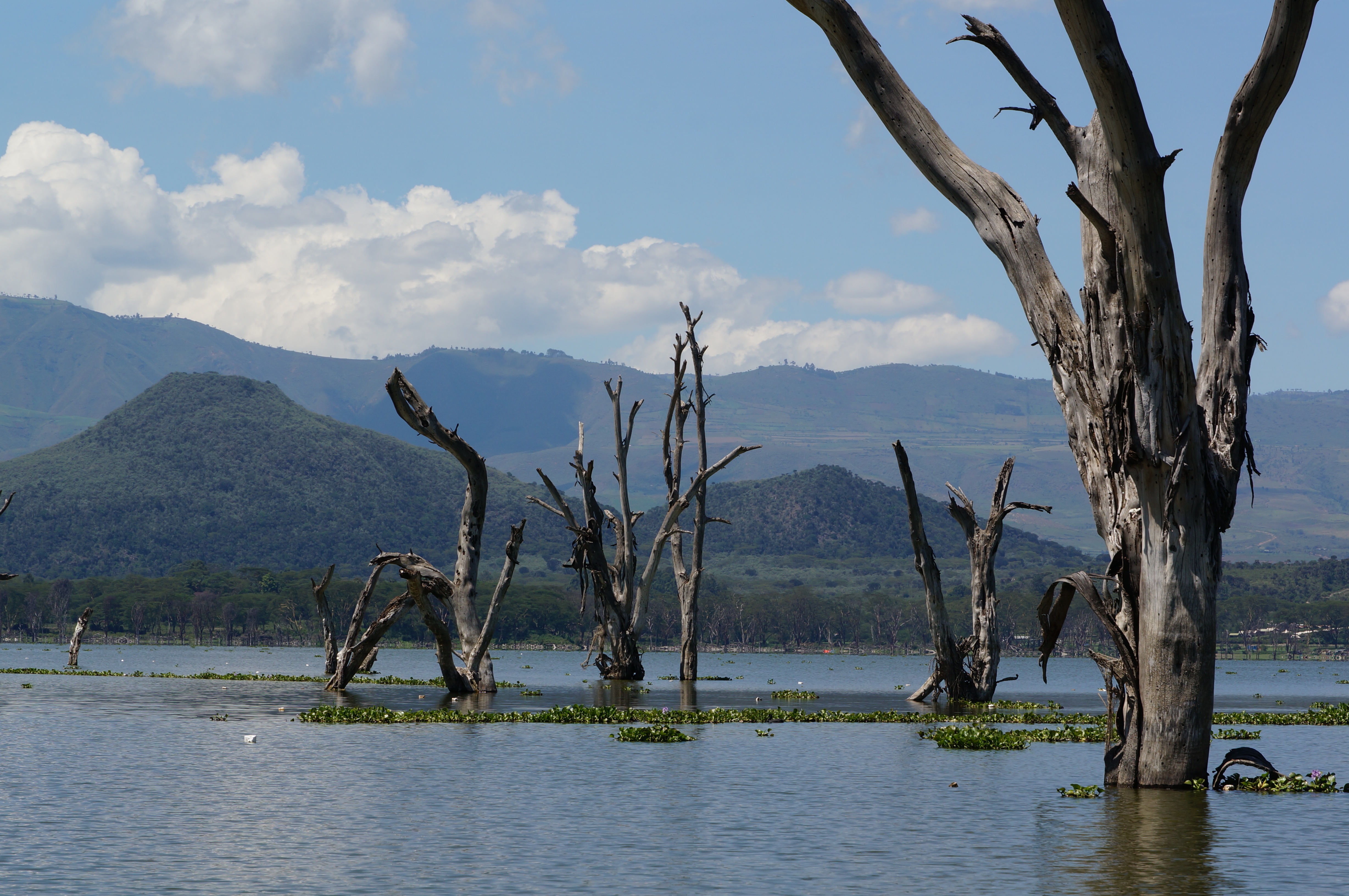 Boven het meer hangen donkere onweerswolken, die prachtig contrasteren met de roze flamingo’s die in het donkere water staan. Gelukkig blijft de regenbui ons bespaard en kunnen we droog op pad naar het volgende meer, Lake Naivasha. Daar verblijven we een paar dagen op een prachtig plekje met uitzicht over het water. We maken een boottocht tussen de half ondergelopen bomen en de kilometerslange slierten van waterhyacinten, die als een groene deken over het meer liggen.