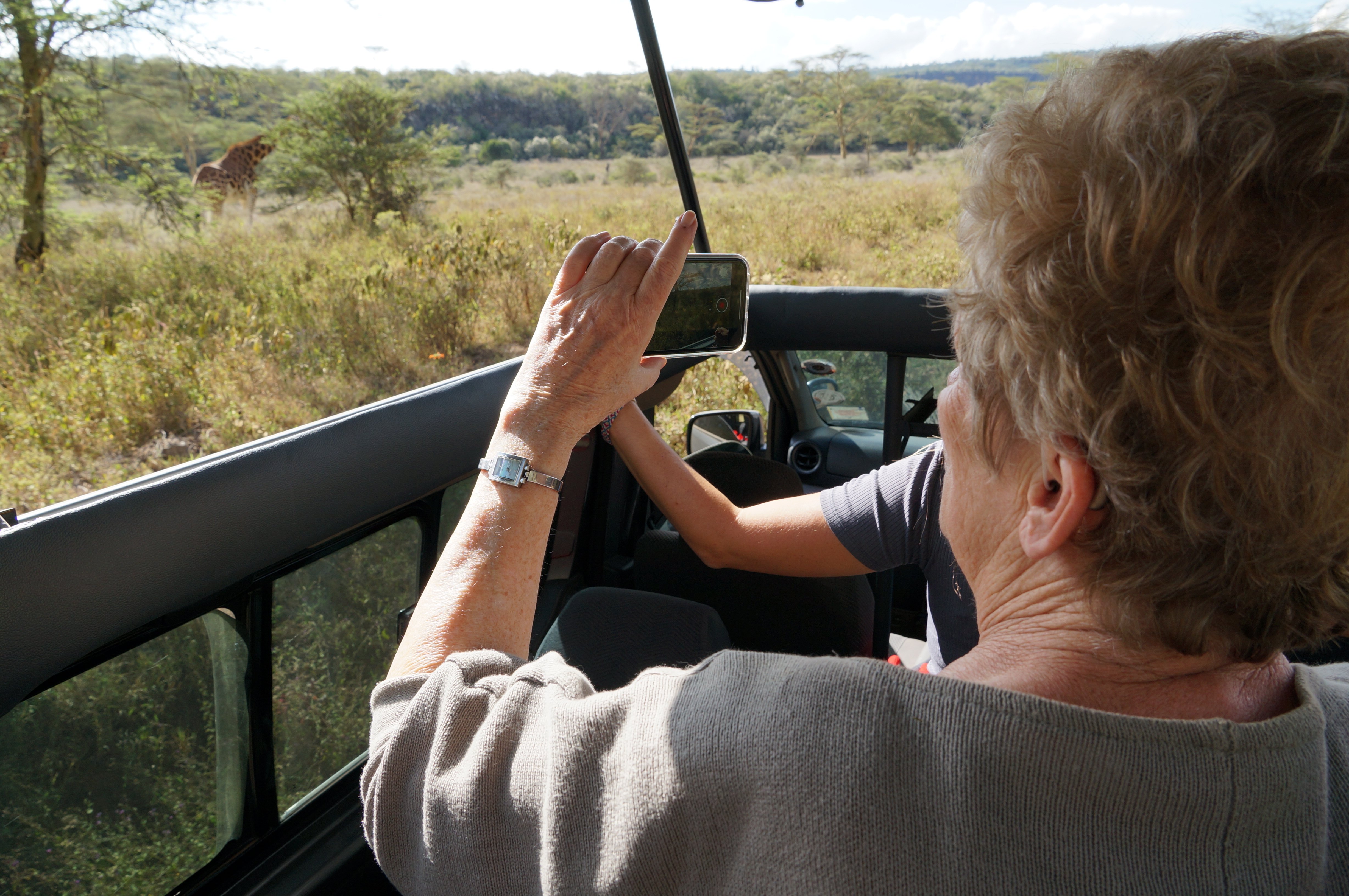 Voor het eerst buiten Europa en alleen in het vliegtuig. Voor Ria, de moeder van Ellemieke, is het een groot avontuur om naar Nairobi te komen. Heel bijzonder dat ze deze reis kan maken, om ons te bezoeken op bijna 7.000 kilometer van huis. We halen haar op van het vliegveld en de dagen erna gaan we op pad met gids John. We hebben zelf geen extra zitplaats, dus we ruilen de Land Cruiser in voor een busje dat er nogal boos uitziet. Het boze busje brengt ons stuiterend en laverend tussen de rokende vrachtwagens van Nairobi naar het Lake Nakuru National Park. Voor Ria is het de eerste kennismaking met zebra’s, giraffes, impala’s en andere wilde dieren.