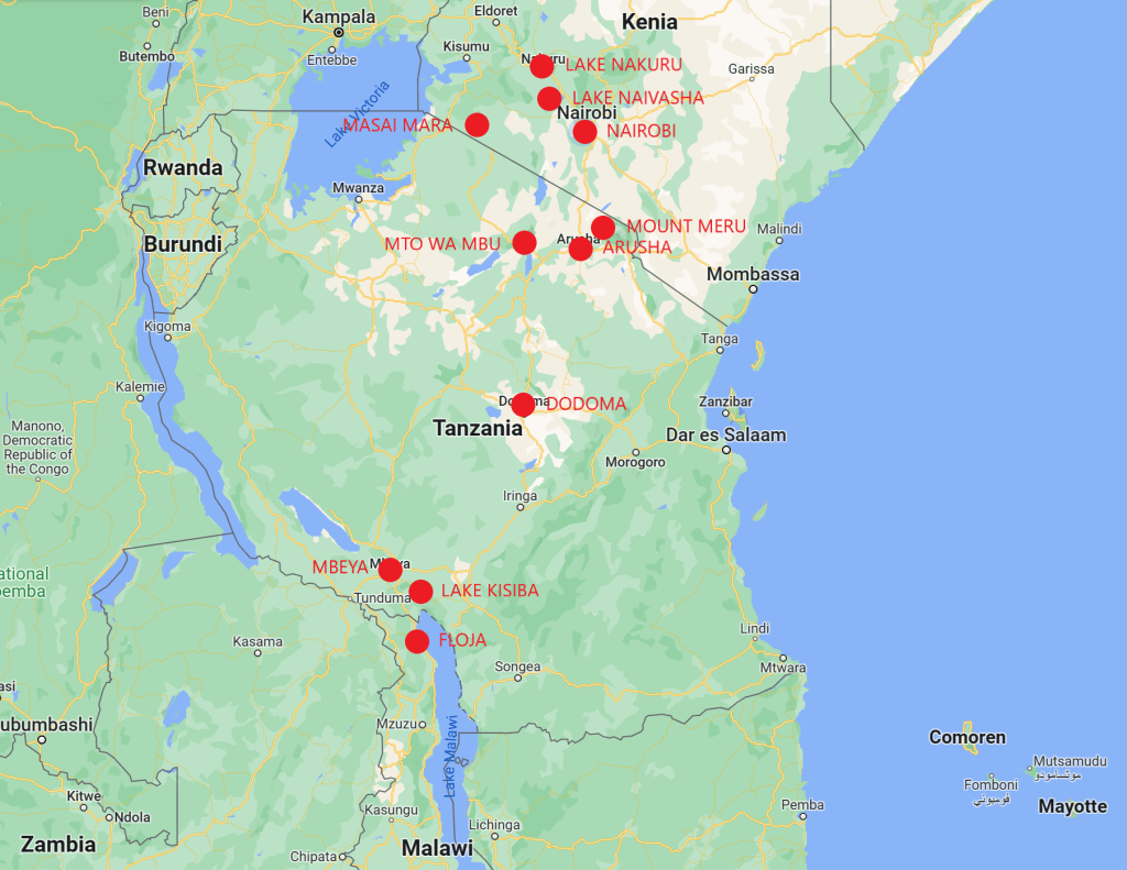 Onze route: FloJa-camping – Lake Kisiba – Mbeya en omgeving – Dodoma – Mto Wa Mbu – Arusha – Mount Meru – Nairobi – Lake Nakuru – Lake Naivasha – Masai Mara – Nairobi