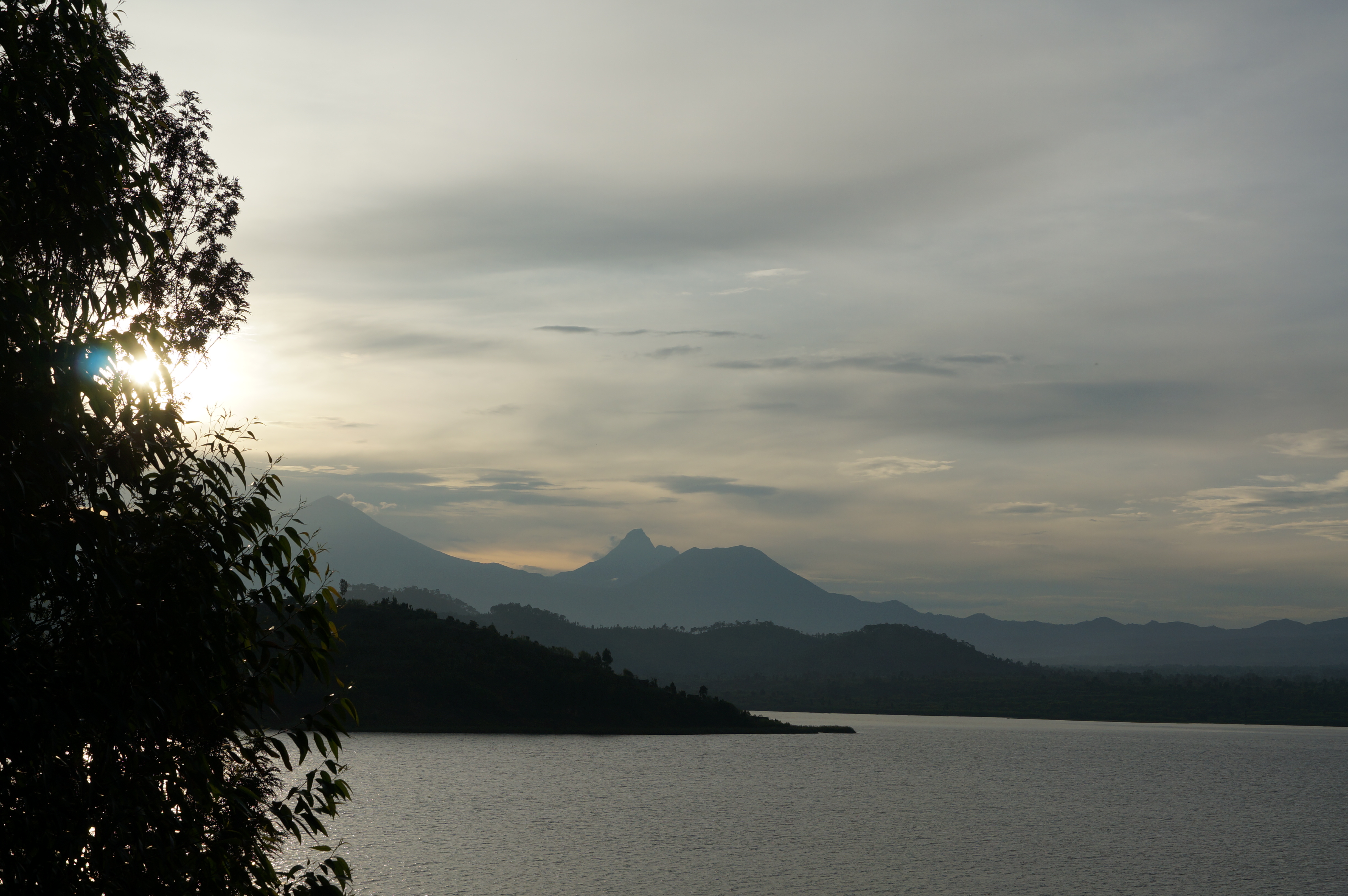 Uitzicht op Lake Ruhondo | Drie vulkanen op een rij | Zonsondergang boven het meer