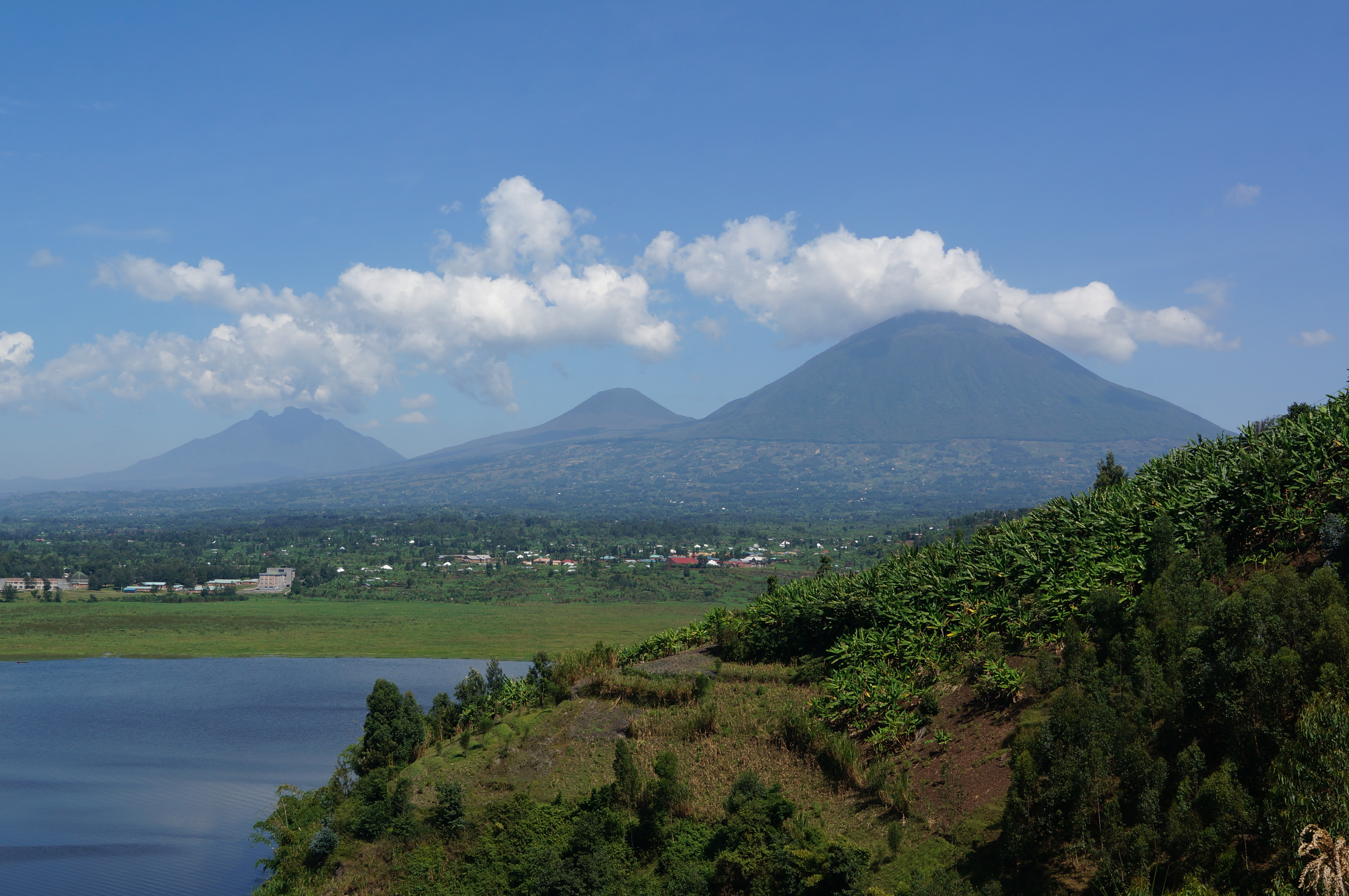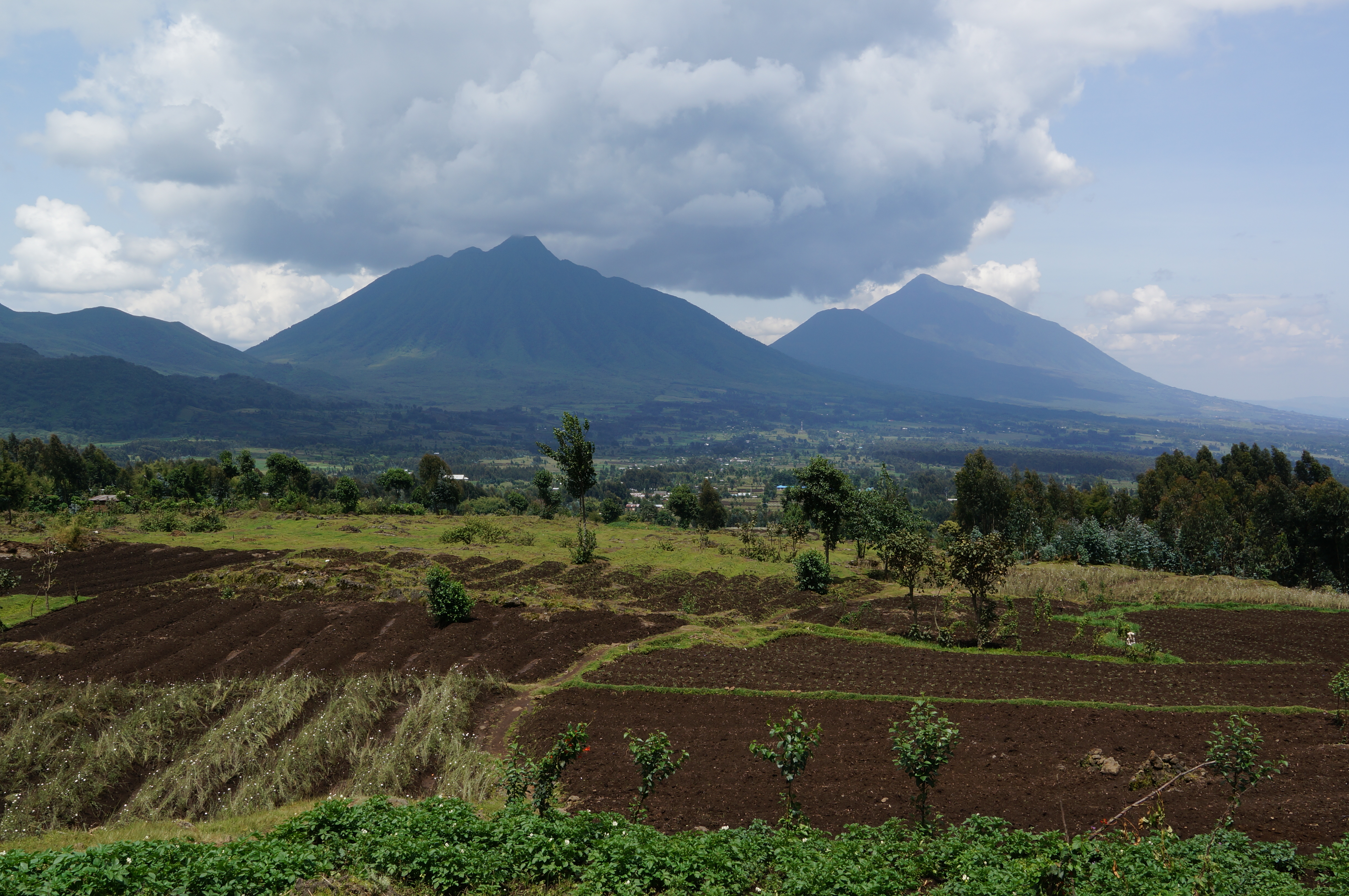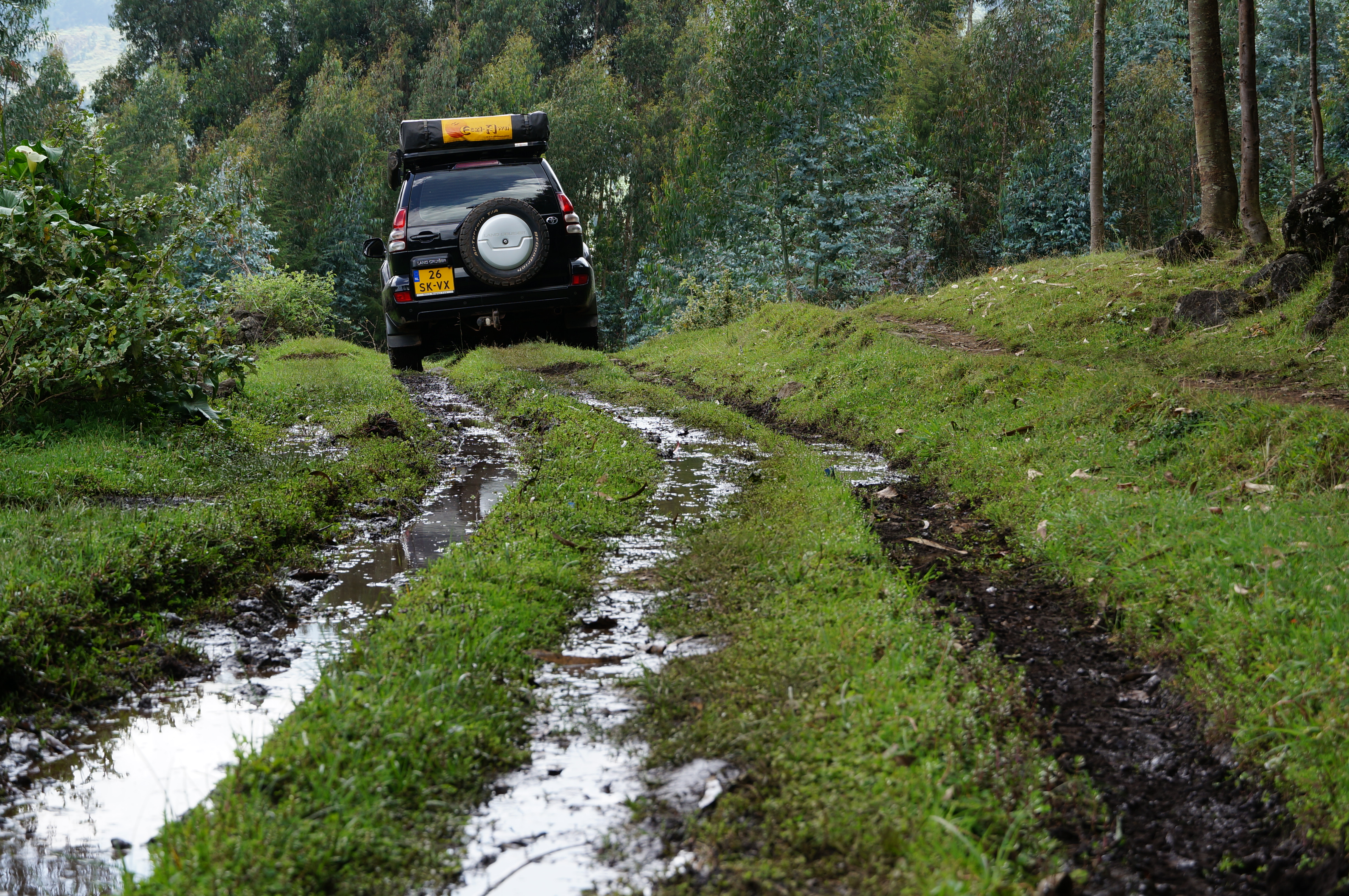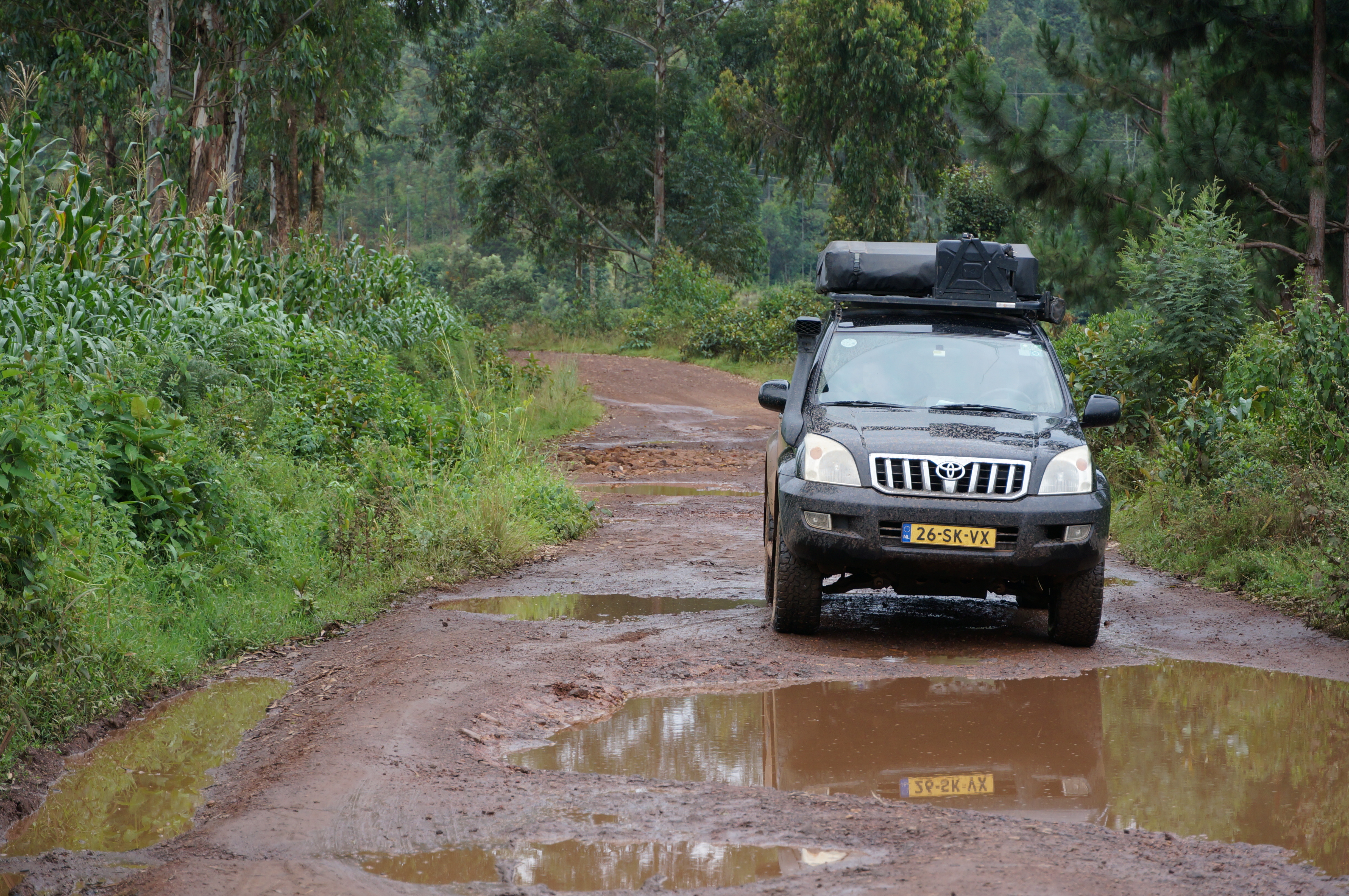 We reizen verder naar het meest noordwestelijke puntje van Rwanda. Hier domineren een stuk of acht vulkanen, die verspreid liggen over het grensgebied met Uganda en Congo, het landschap. Achter elke struik, achter elke bocht lijkt weer een nieuwe vulkaan op te duiken. We hobbelen over rotsige en modderige weggetjes aan de voet van de vulkanen door dit indrukwekkende decor. Het blijft bijzonder om dorpjes te passeren waar mensen ons aankijken alsof we uit de hemel zijn komen vallen. De enige auto die we tegenkomen is een andere Land Cruiser. De bestuurder probeert wat ruimte te maken zodat we hem kunnen passeren op het smalle weggetje, maar de auto belandt met twee wielen in de greppel. We zijn de beroerdste niet en trekken hem er weer uit met een sleepkabel, onder grote belangstelling en met hulp van voorbijgangers die vervolgens bij ons en de bestuurder van de andere auto om geld vragen omdat ze ons hebben geholpen.