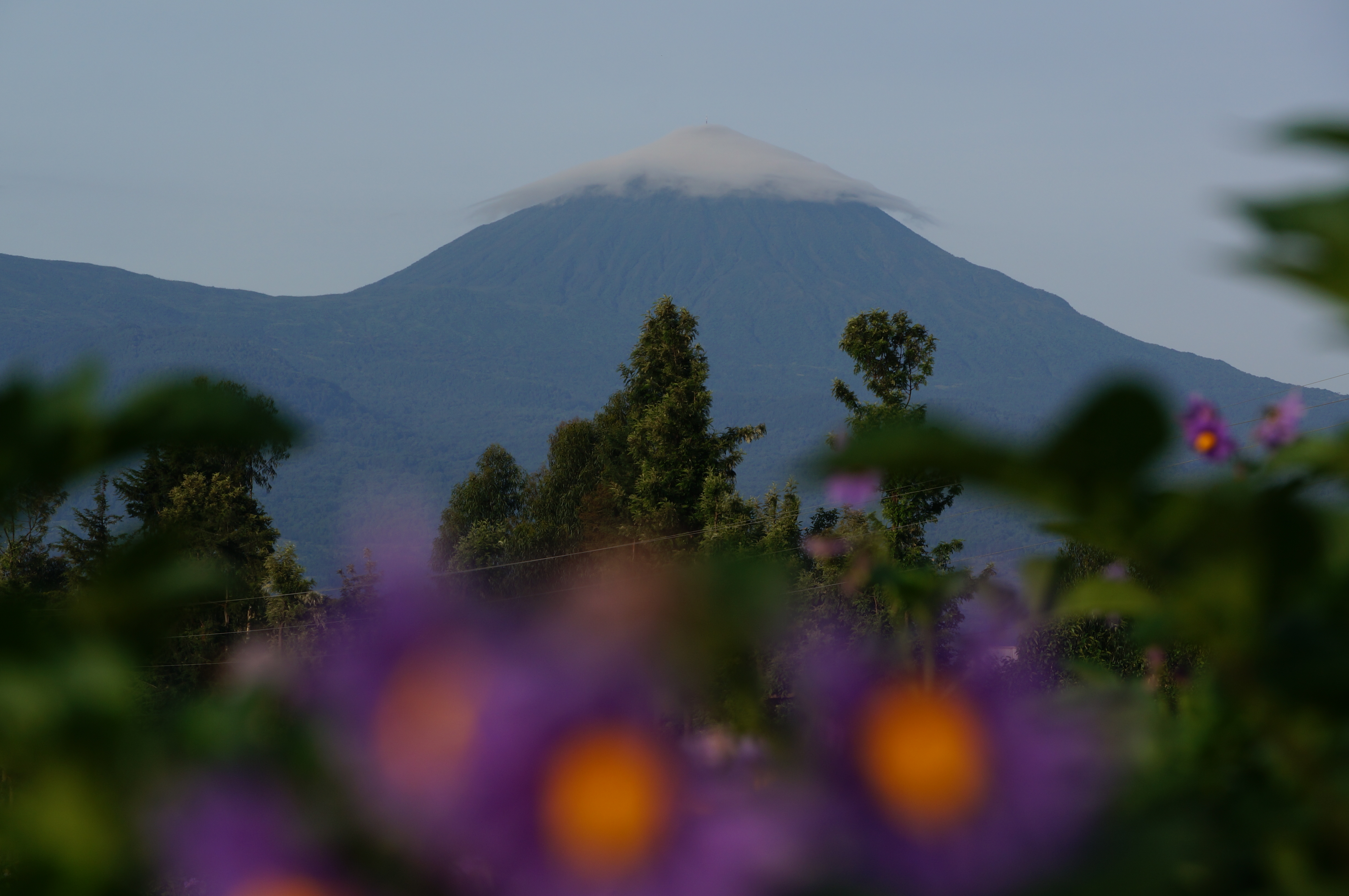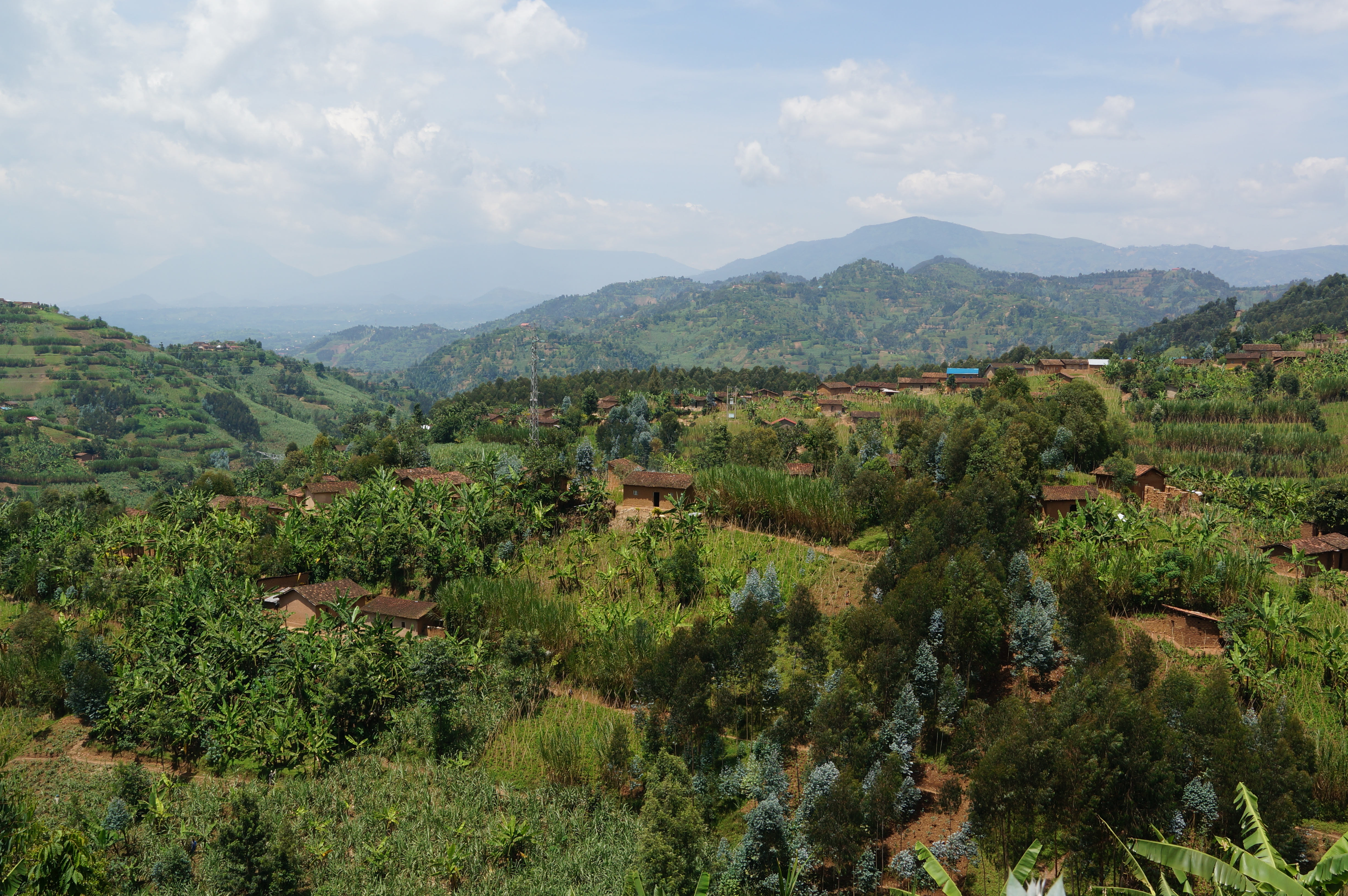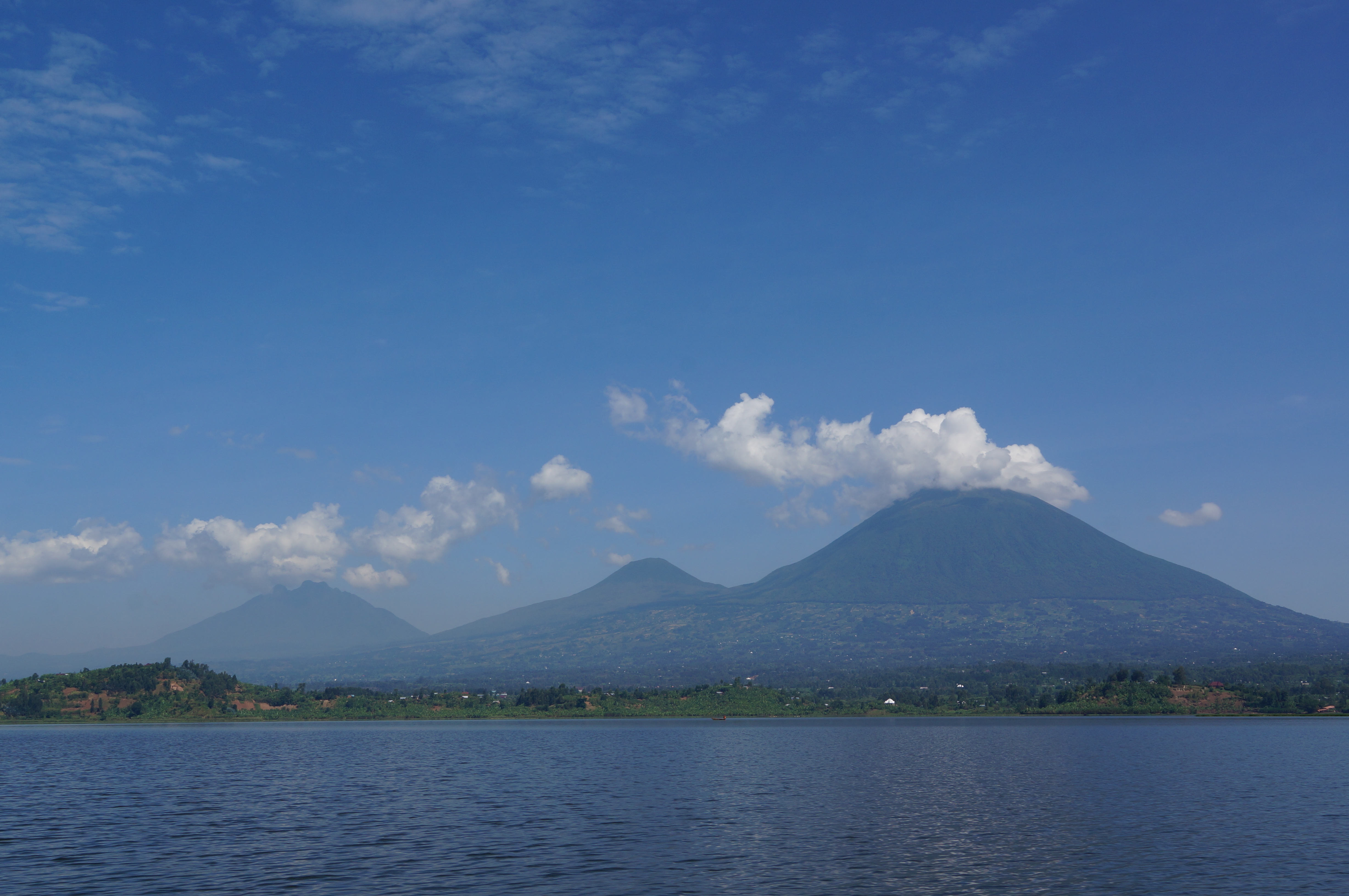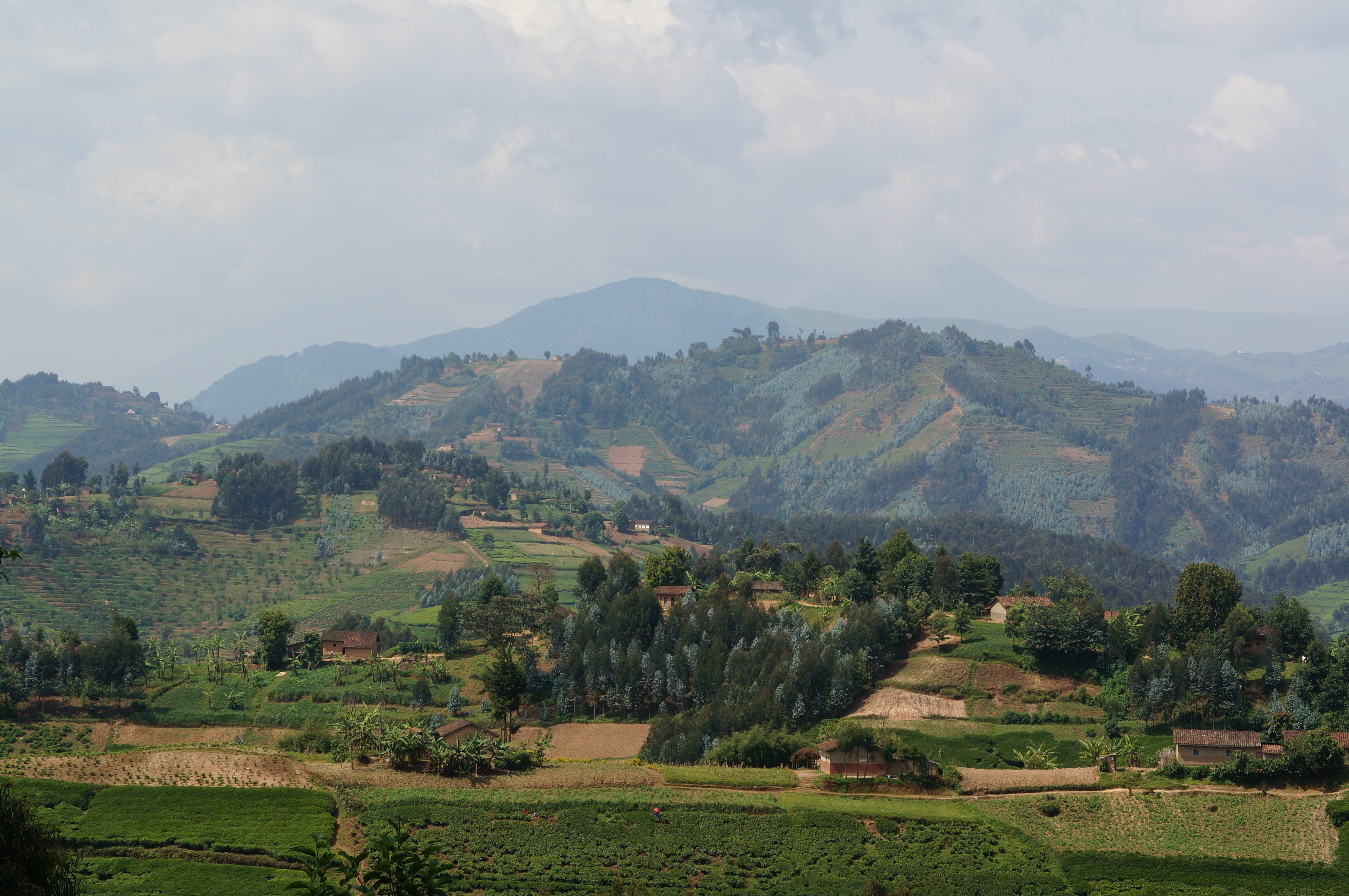 We reizen verder naar het meest noordwestelijke puntje van Rwanda. Hier domineren een stuk of acht vulkanen, die verspreid liggen over het grensgebied met Uganda en Congo, het landschap. Achter elke struik, achter elke bocht lijkt weer een nieuwe vulkaan op te duiken. We hobbelen over rotsige en modderige weggetjes aan de voet van de vulkanen door dit indrukwekkende decor. Het blijft bijzonder om dorpjes te passeren waar mensen ons aankijken alsof we uit de hemel zijn komen vallen. De enige auto die we tegenkomen is een andere Land Cruiser. De bestuurder probeert wat ruimte te maken zodat we hem kunnen passeren op het smalle weggetje, maar de auto belandt met twee wielen in de greppel. We zijn de beroerdste niet en trekken hem er weer uit met een sleepkabel, onder grote belangstelling en met hulp van voorbijgangers die vervolgens bij ons en de bestuurder van de andere auto om geld vragen omdat ze ons hebben geholpen.