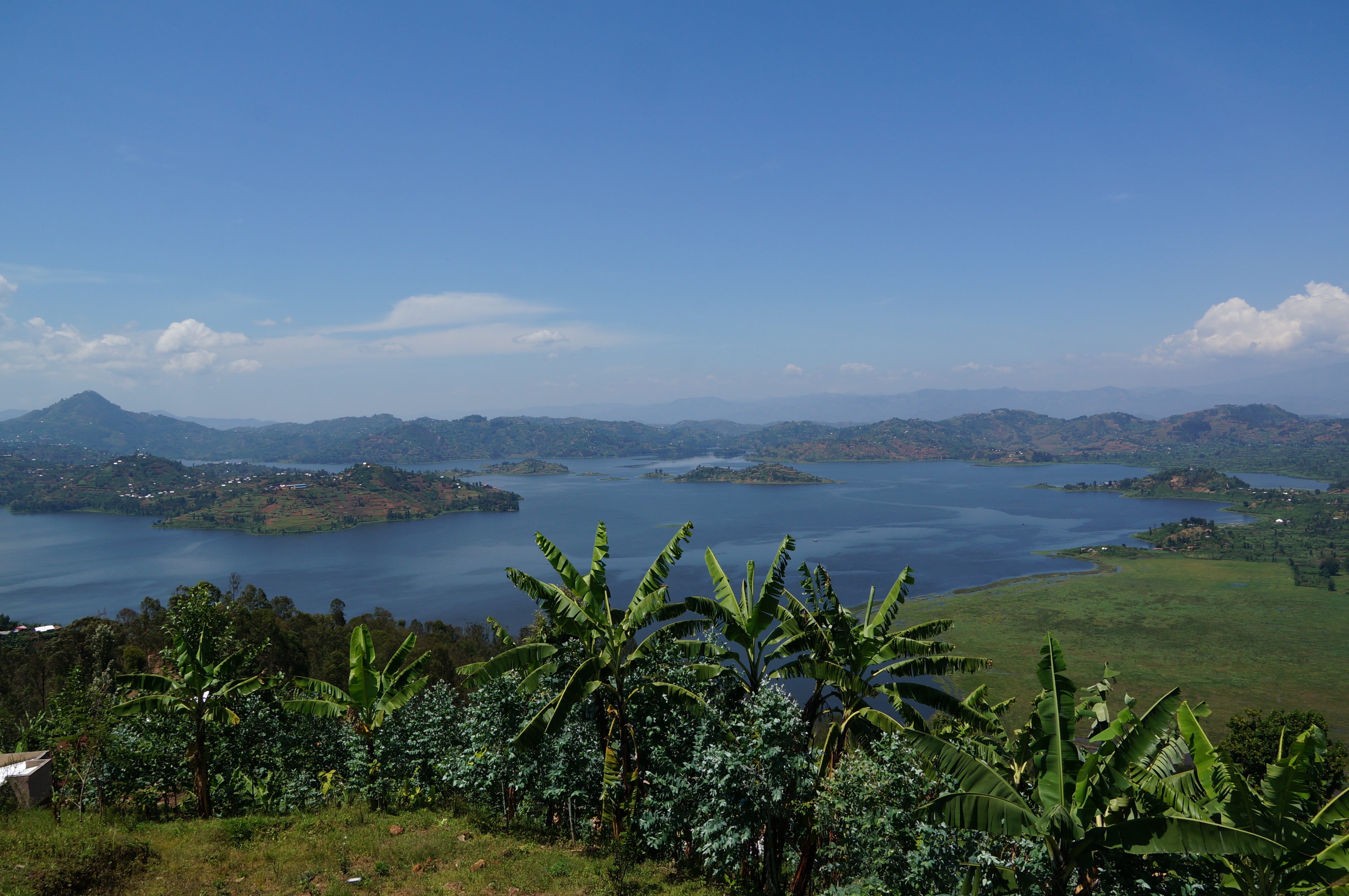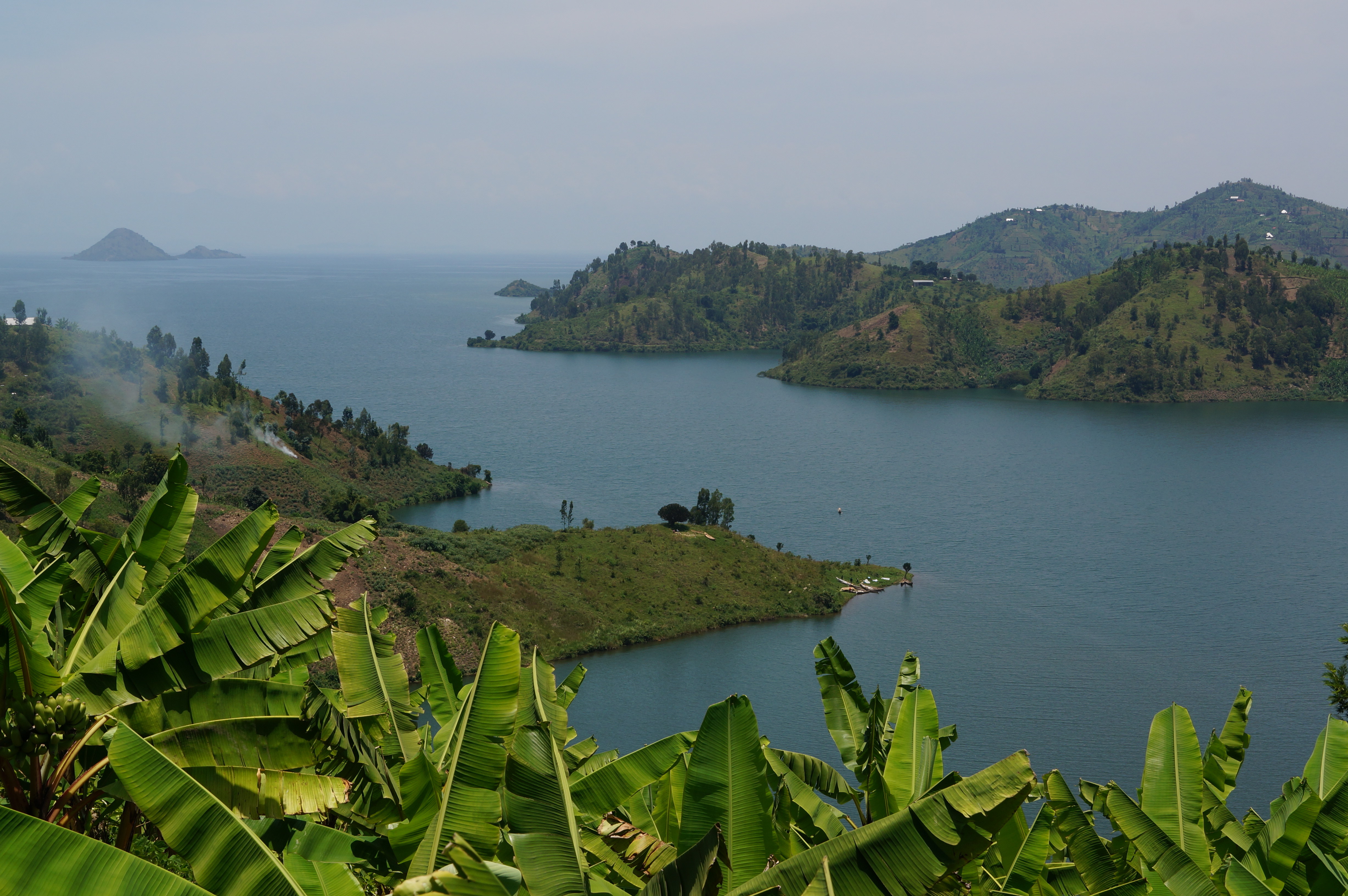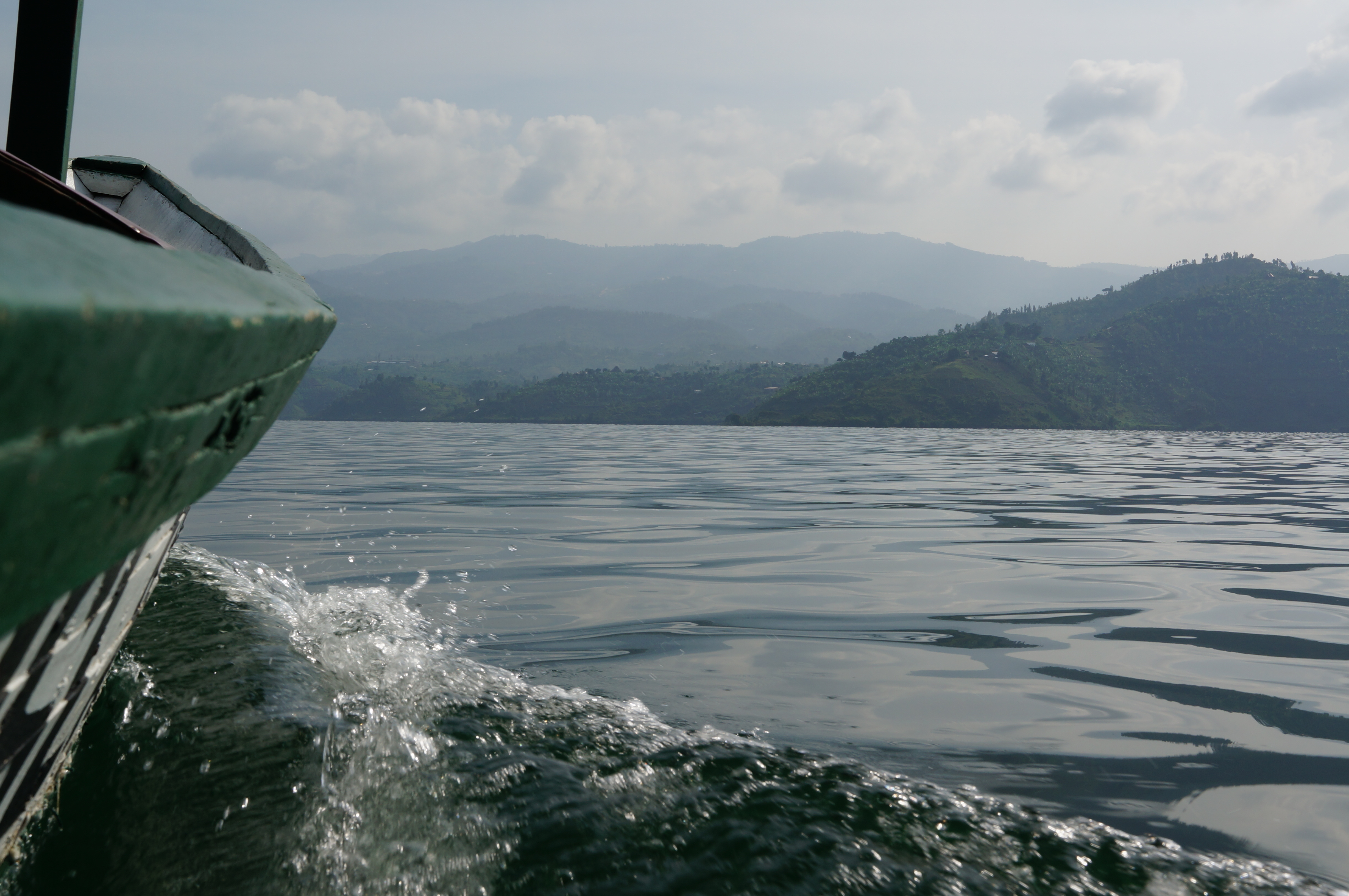 De volgende dag rijden we richting het zuiden en worden de vulkanen langzaam kleiner in de binnenspiegel. Het Kivumeer is de volgende stop, waar we een deel van de Congo-Nijl Trail gaan wandelen. Door een lokale schipper worden we afgezet aan de voet van een heuvel en vanaf daar kunnen we een etappe lopen van de bijna 230 kilometer lange wandelroute. We wandelen door bananenplantages, heel veel bananenplantages, door groene dalen, over groene heuvels en kijken uit over het blauwe meer.