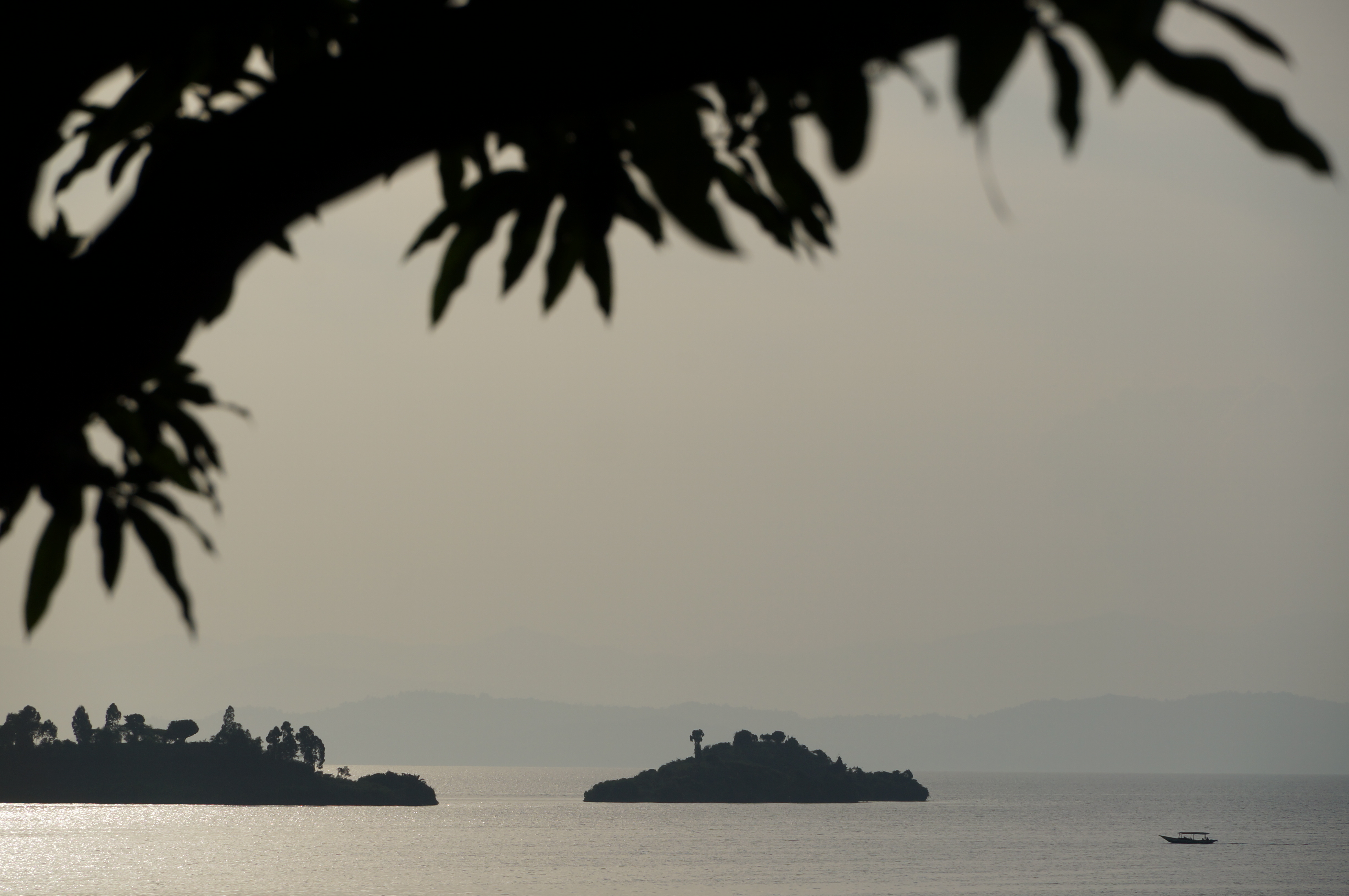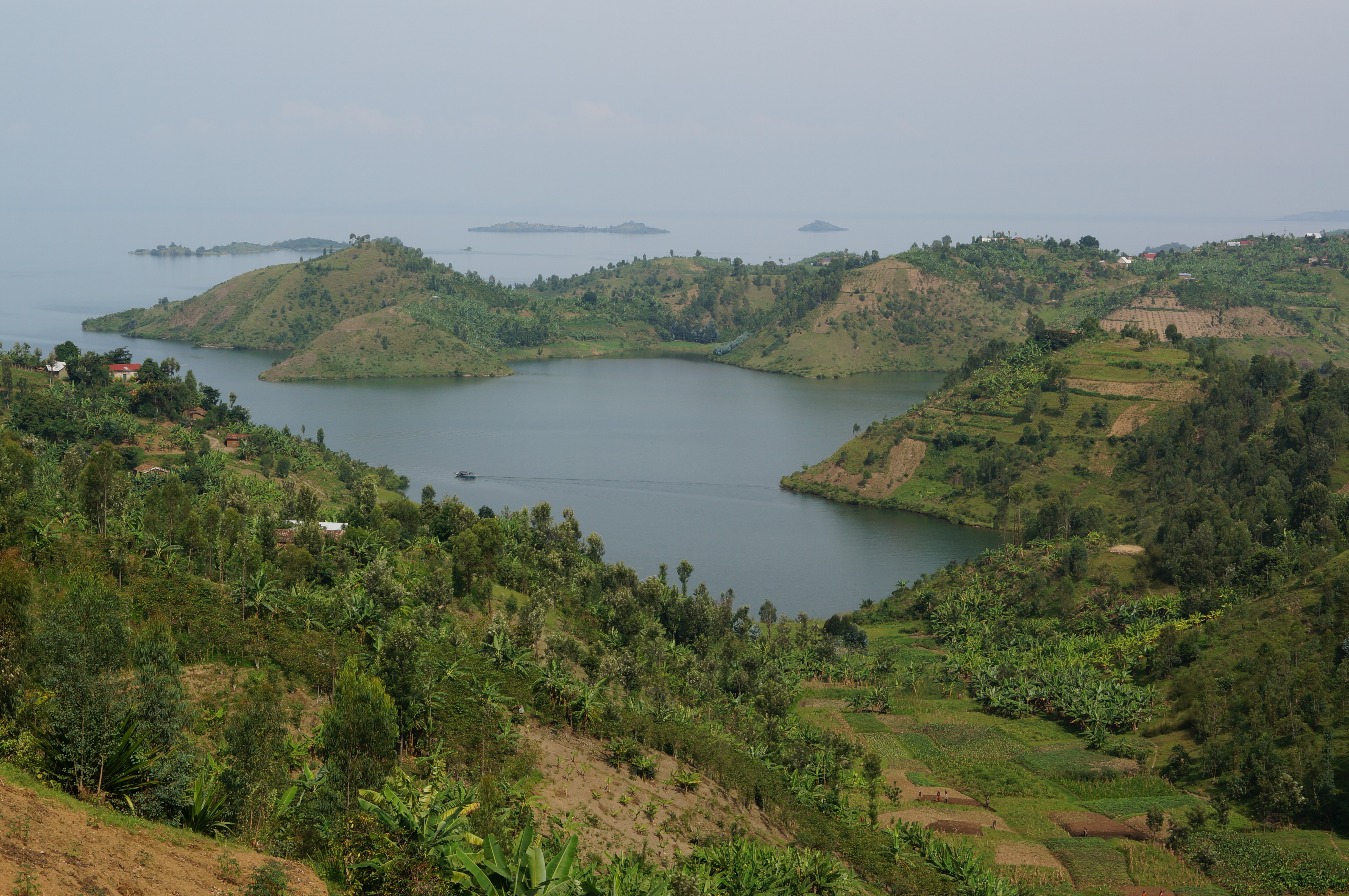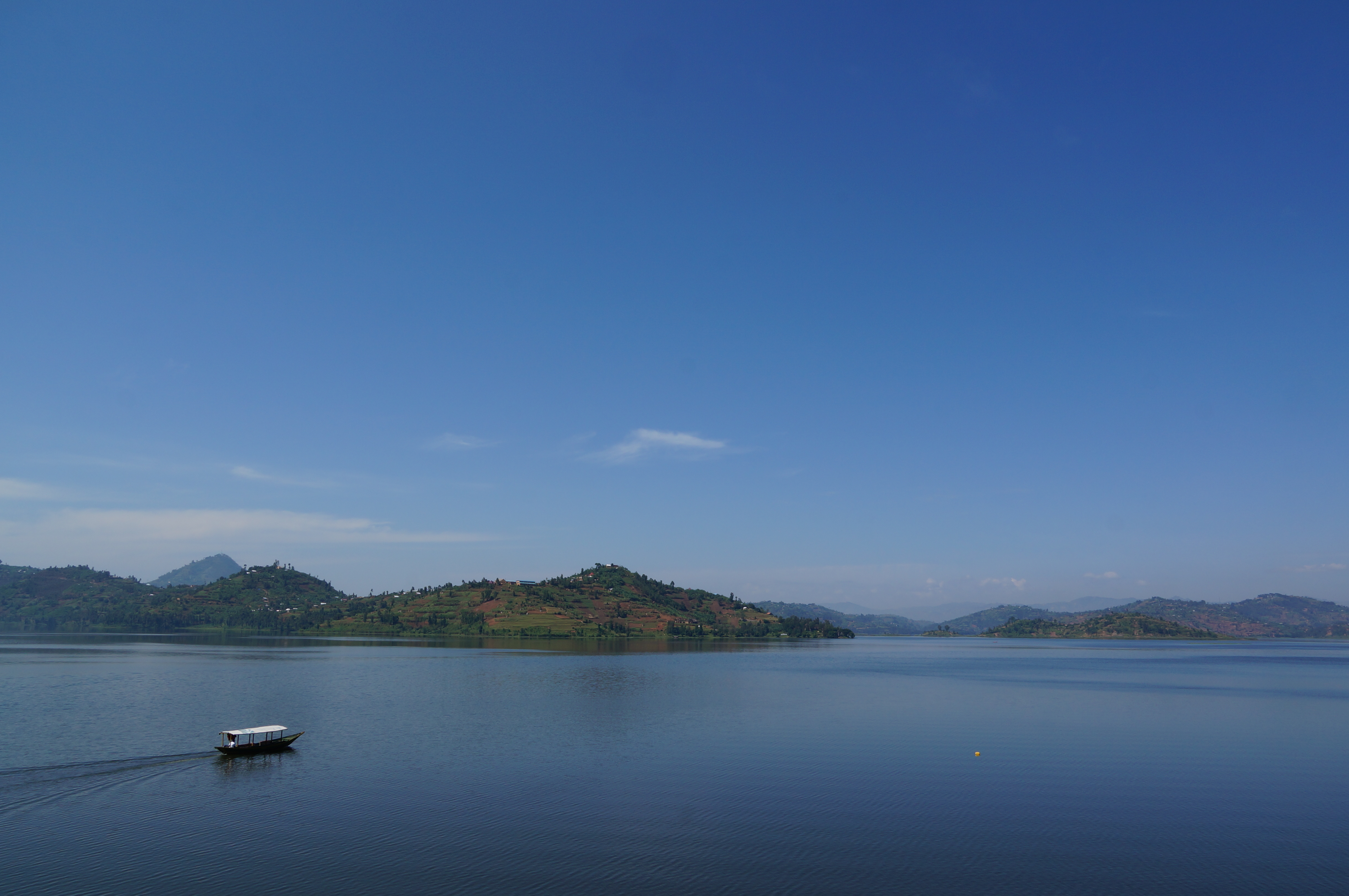 De volgende dag rijden we richting het zuiden en worden de vulkanen langzaam kleiner in de binnenspiegel. Het Kivumeer is de volgende stop, waar we een deel van de Congo-Nijl Trail gaan wandelen. Door een lokale schipper worden we afgezet aan de voet van een heuvel en vanaf daar kunnen we een etappe lopen van de bijna 230 kilometer lange wandelroute. We wandelen door bananenplantages, heel veel bananenplantages, door groene dalen, over groene heuvels en kijken uit over het blauwe meer.