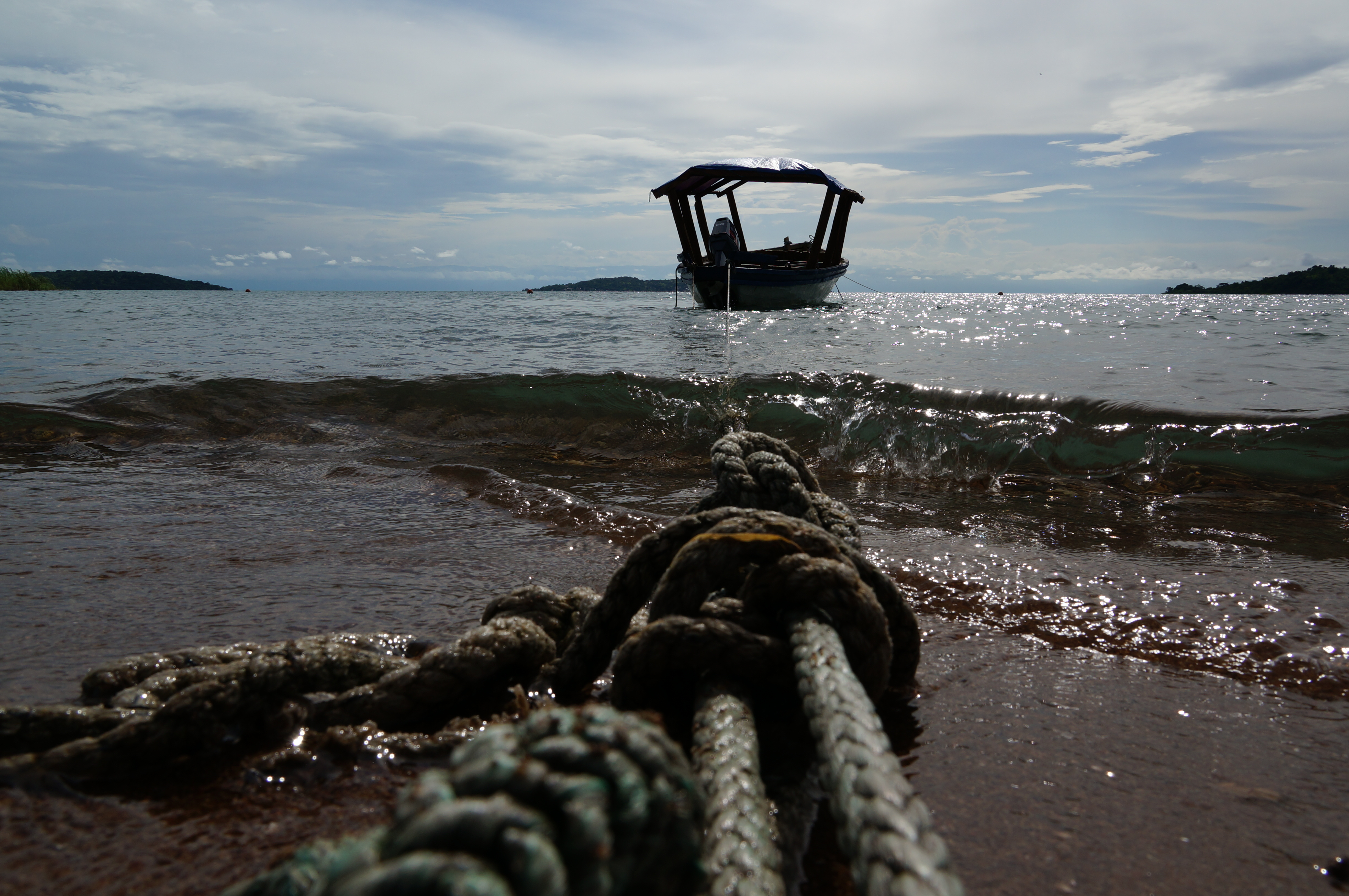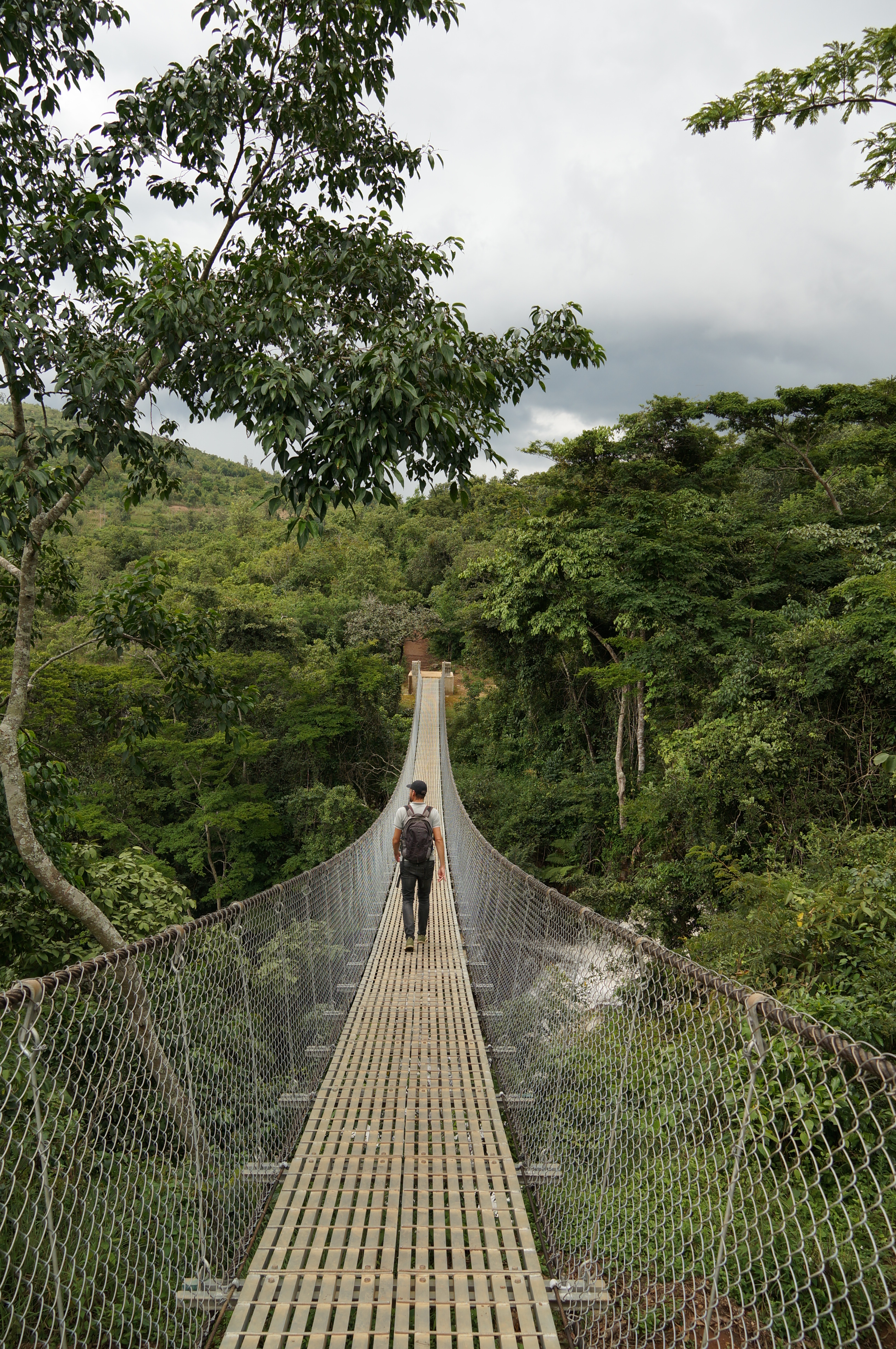 Onderweg steken we een paar keer een rivier over. Soms moeten we onze wandelschoenen uittrekken en wadend de rivier oversteken, soms is er een brug. De gammele hangbrug waar we na een paar uur wandelen op stuiten is half weggespoeld door de rivier. De resten hangen vervaarlijk boven het water, maar het is de enige manier om aan de overkant te komen. Balancerend op de restanten van de brug, terwijl tien meter onder ons het riviertje raast, halen we de overkant. De laatste oversteek is over het meer, maar het ‘pontje’ dat er zou moeten zijn ligt er niet. Na een half uurtje wachten komt er een bootje aangekacheld en kunnen we na de oversteek het laatste stuk terug naar de camping lopen. We zijn ruim op tijd terug om de zon te zien zakken in het meer, terwijl vissersbootjes in de verte voorbij pruttelen.
