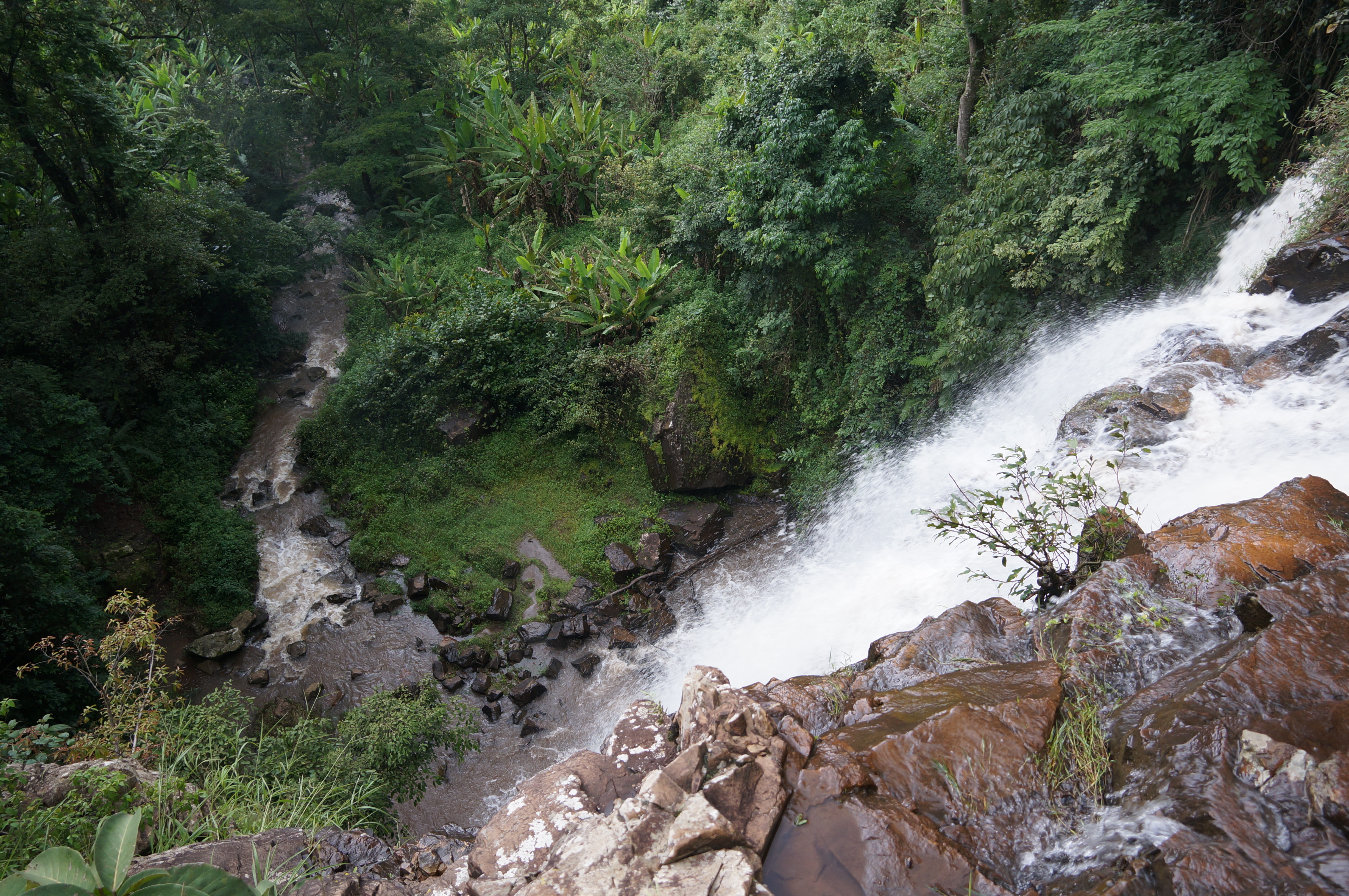 Na een nachtje in het veel te korte bed rijden we door naar zo’n beetje de enige toeristische bezienswaardigheid op onze route door Burundi, de Karera-watervallen. We maken een korte wandeling door het gebied. Er is zelfs een stevig uitziende, metalen hangbrug, waardoor we een mooi uitzicht hebben op het omlaag stortende water. Halverwege het wandelingetje barst de hemel open en stort het water ook uit de lucht. We zitten midden in het regenseizoen, dus het moest een keer gebeuren dat we écht flink nat regenen. De kleur van de watervallen verandert in no-time van sprankelend wit naar modderbruin.