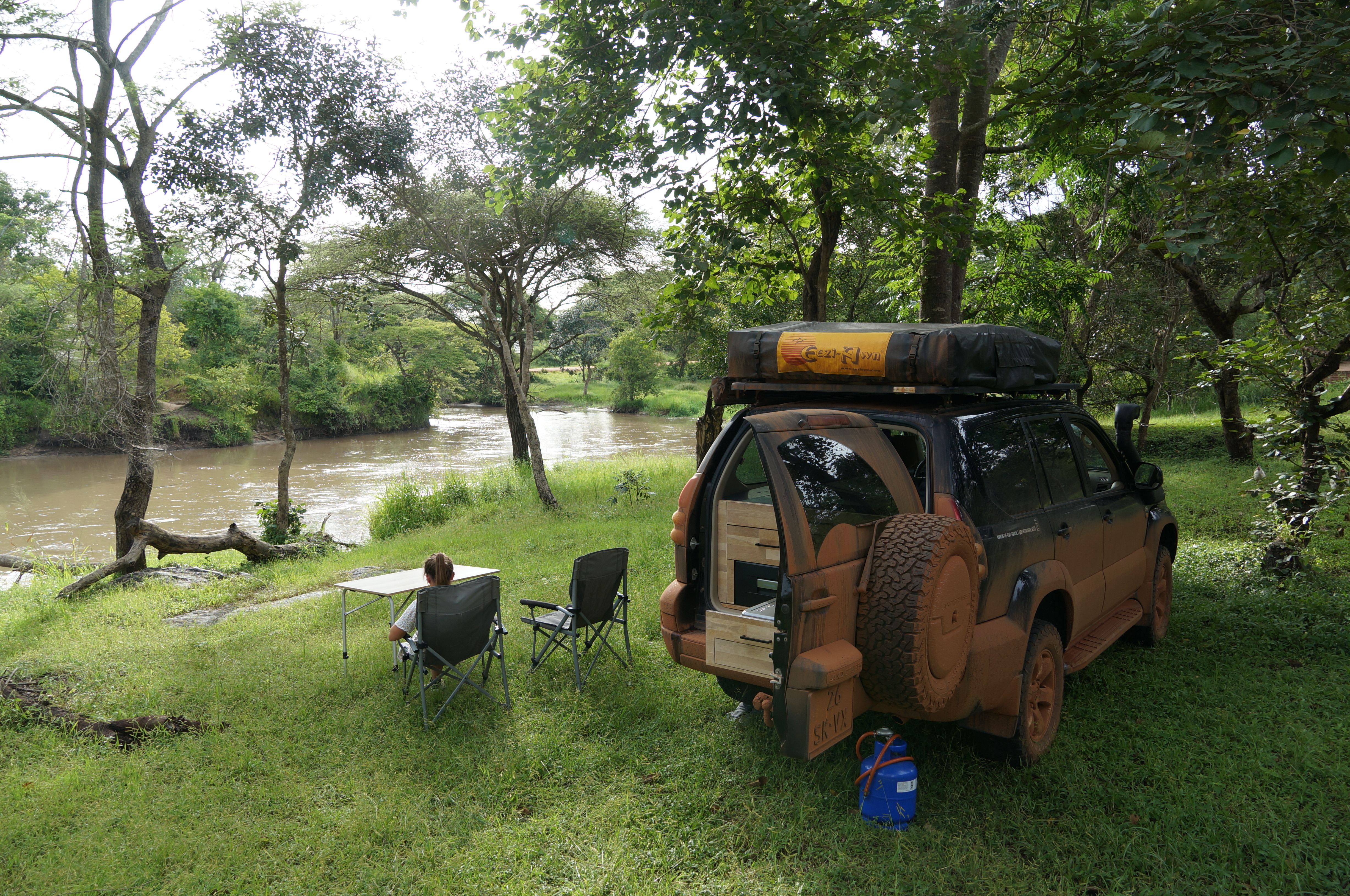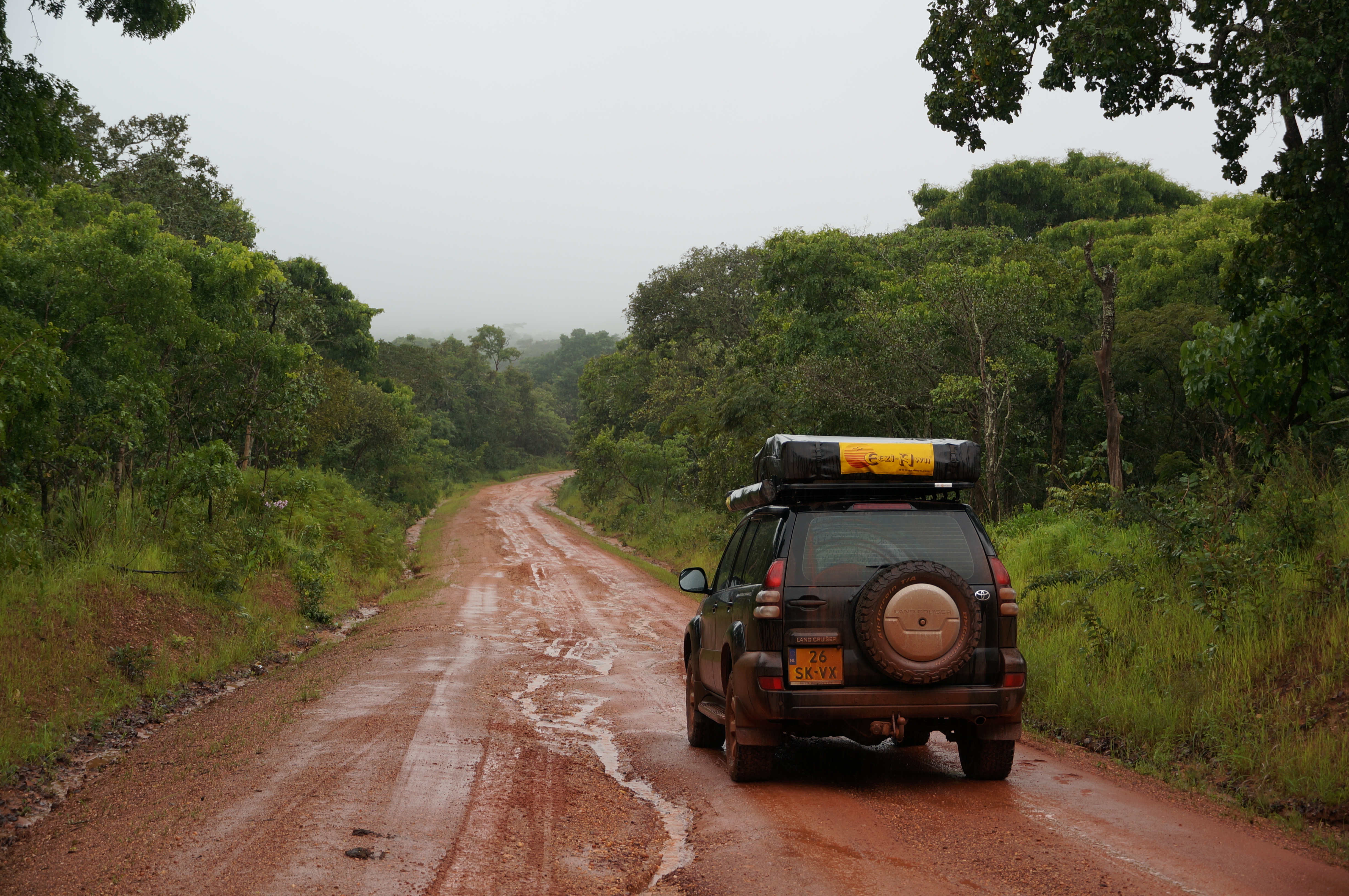 De volgende dag vullen we de voorraden aan en rijden verder naar het zuiden. De weg is onverhard en door de regen die bijna de hele dag valt is het een grote blubberboel. Urenlang glibberen we over de roodbruine weggetjes, waterstromen steken de weg over en veroorzaken diepe geulen. De onderste helft van de auto is aan het eind van de dag bedekt met een dikke laag modder. Maar net als de dag ervoor breekt de zon aan het eind van de middag door, waardoor we droog kunnen kamperen. Op het moment dat we gaan eten komt er een invasie van vliegjes op gang, die als een magneet naar het licht worden getrokken. Miljoenen vliegjes zwermen rondom alles wat licht geeft en storten vervolgens halfdood neer. We vluchten snel naar binnen, want pasta met vliegen is iets teveel fusion cooking voor ons. Na een paar uur is de ergste vliegenstorm voorbij en kunnen we nog even bij het kampvuur zitten, terwijl we luisteren naar de knorrende nijlpaarden in het riviertje voor onze tent. Dit soort momentjes, die gaan we ons nog heel hard herinneren als we over een paar maanden weer acht uur lang op kantoor zitten op een druilerige dag.