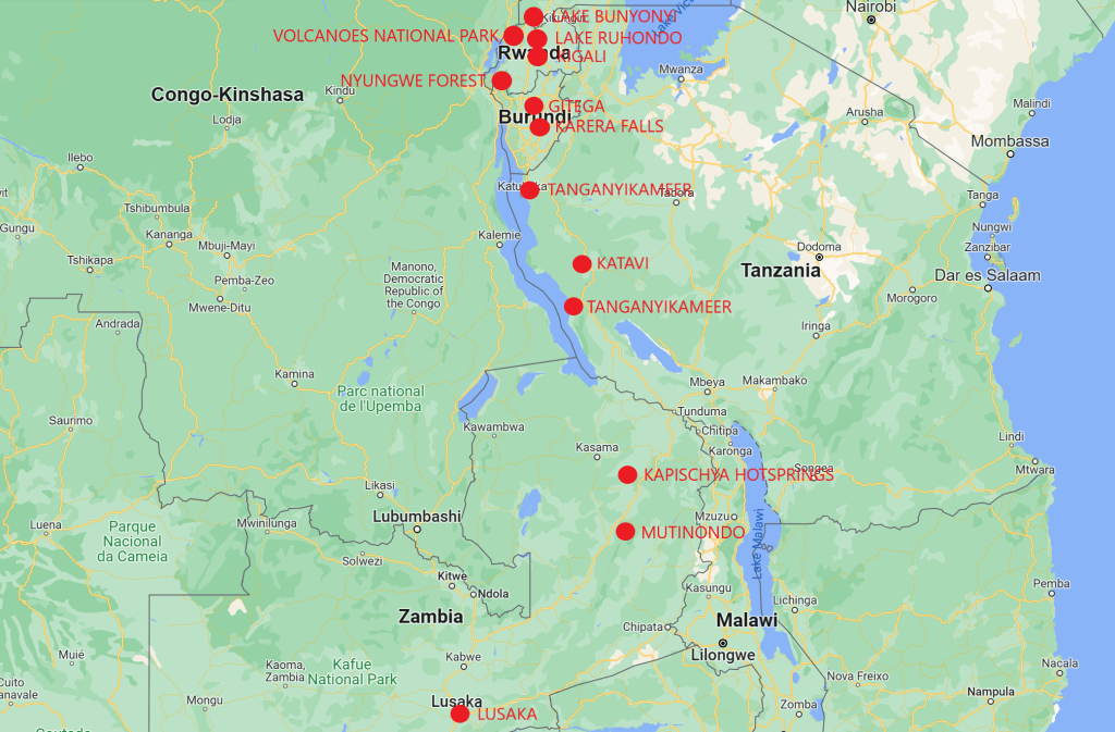 Onze route in chronologische volgorde: Lake Bunyonyi – Kigali – Lake Ruhondo – Volcanoes NP – Nyungwe – Gitega – Karera Falls – Tanganyikameer – Katavi – Nog een keer het meer – Kapischya Hotsprings – Mutinondo – Lusaka